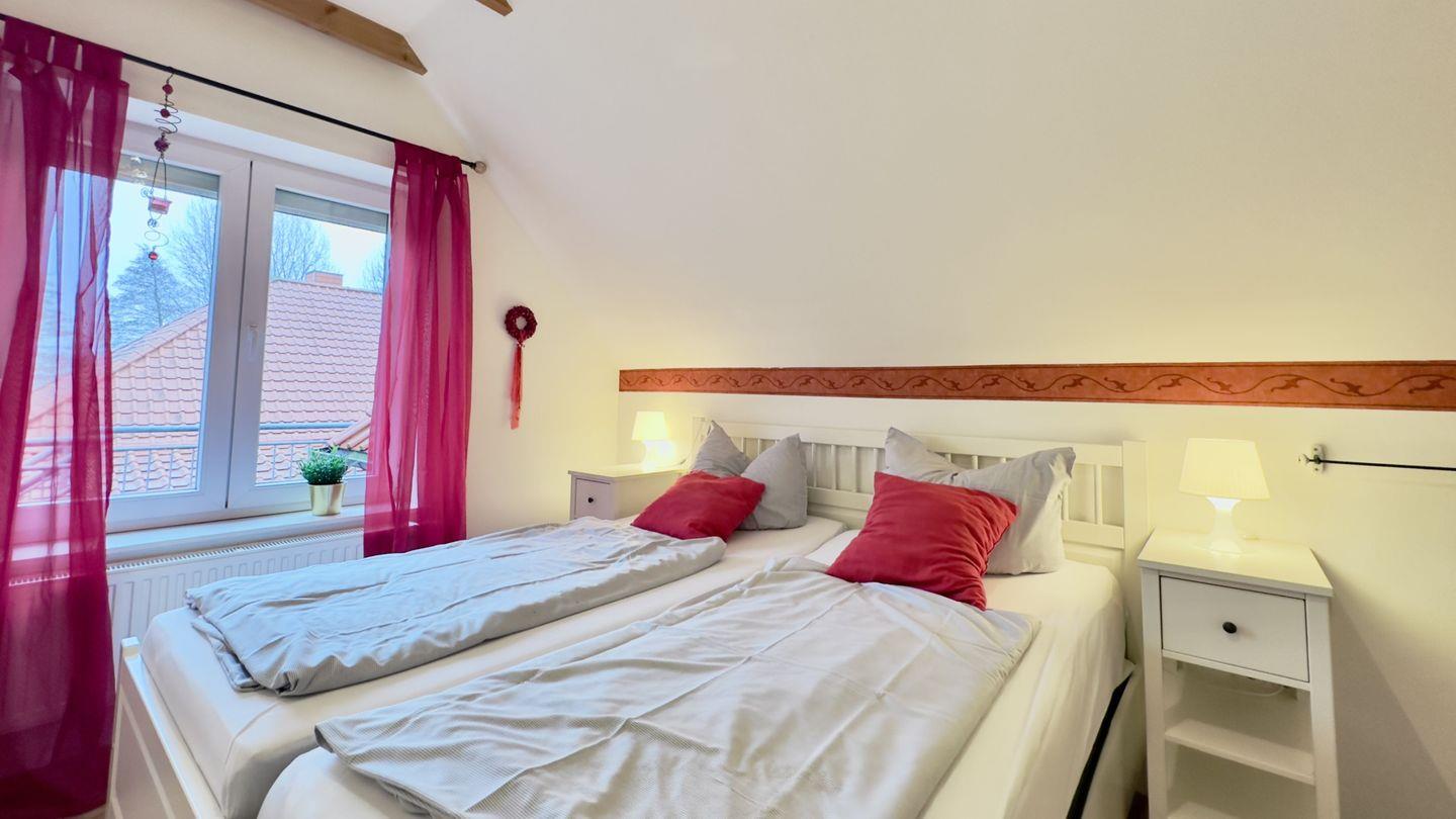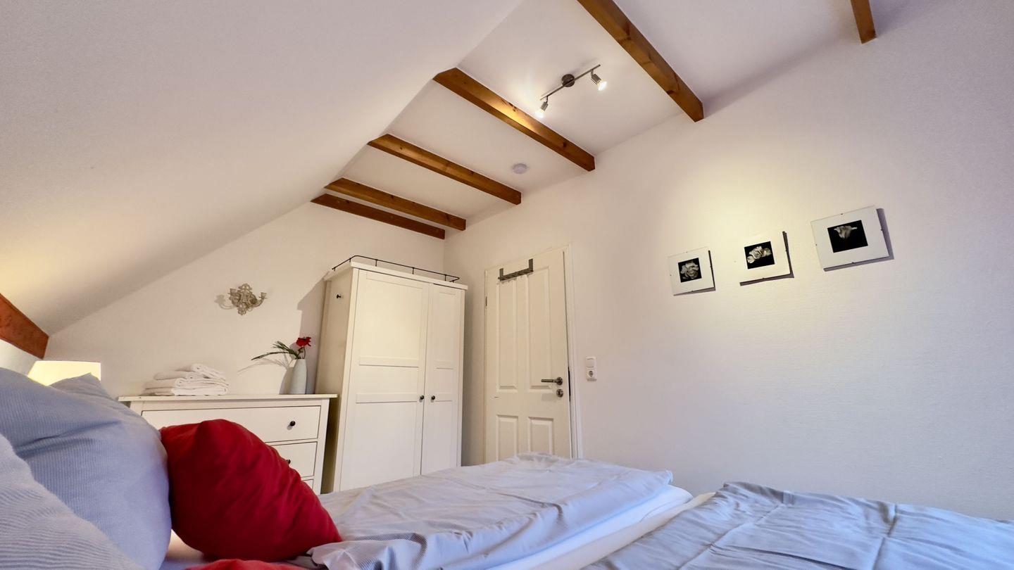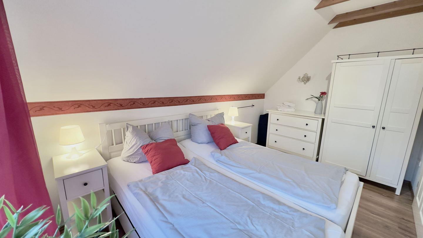Das Schlafzimmer, ausgelegt mit Venyl strahlt eine behagliche Atmosphäre aus, ergänzt durch die hellen Holzmöbel. Ein Doppelbett und ein großer Kleiderschrank stehen zur Verfügung, um den Aufenthalt angenehm zu gestalten. Das zweite Schlafzimmer verfügt über zwei Einzelbetten mit Nachtschränken und einem Hängeschrank für die Kleidungsaufbewahrung.