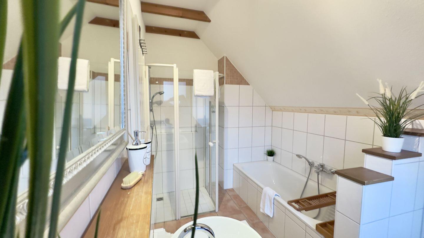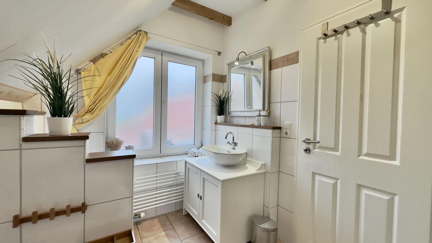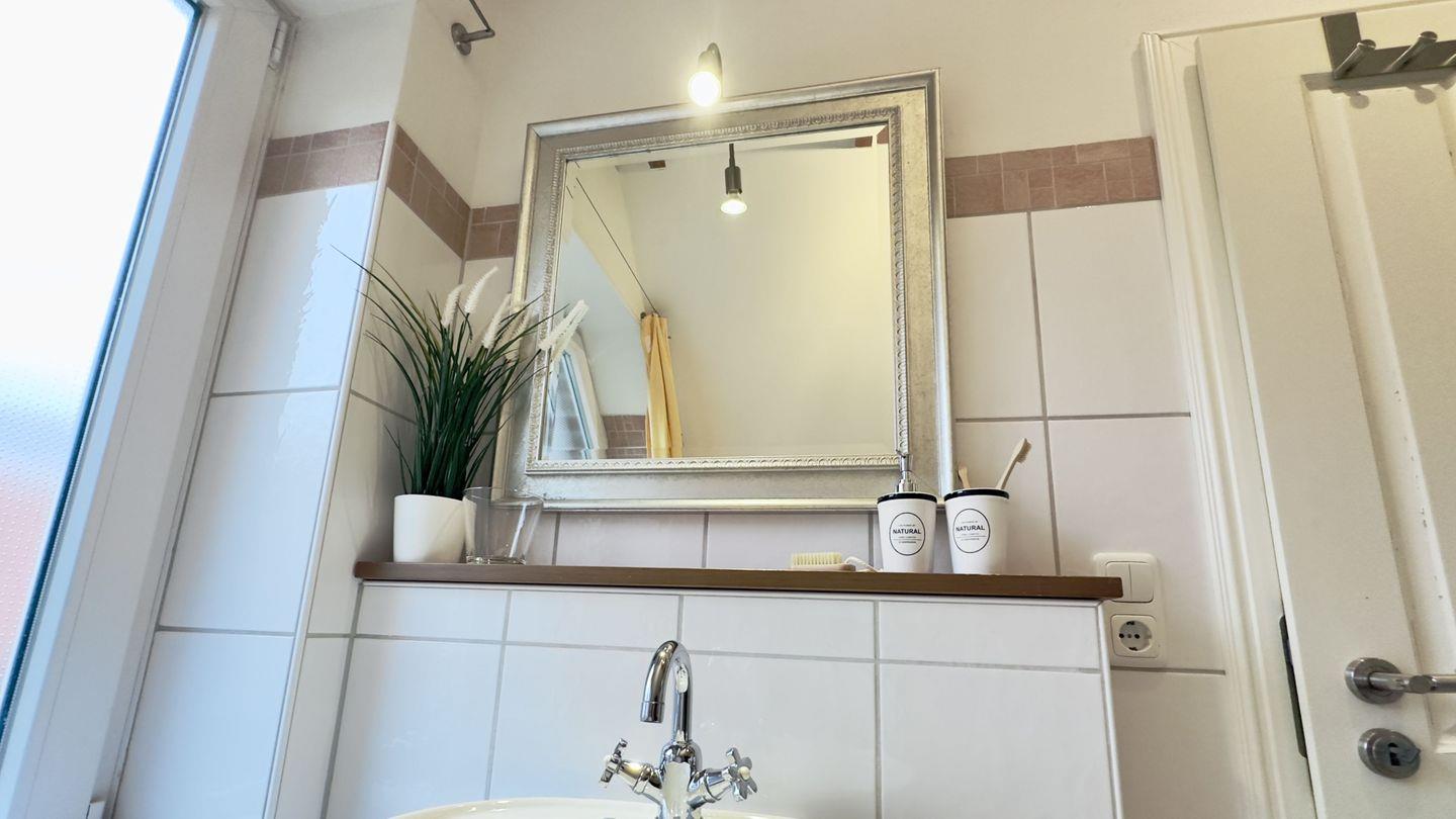 Das hell geflieste Badezimmer bietet mit Badewanne, Dusche und einem Fenster viel Komfort und Raum. Ein großer Wandspiegel vervollständigt die Ausstattung dieses Badezimmers.