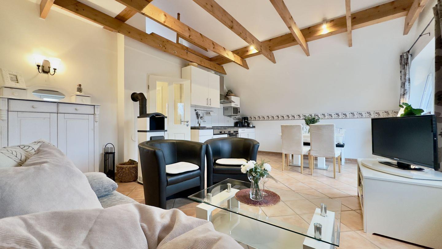 Das Wohnzimmer ist besonders beeindruckend mit seinen hohen Decken und den natürlichen Holzbalken, die eine charmante Atmosphäre schaffen. Die großzügige Fensterfront lässt viel Tageslicht herein und verleiht der Ferienunterkunft ein helles und einladendes Ambiente. Eine gemütliche Sofaecke lädt zu entspannten Abenden vor dem Kamin ein.