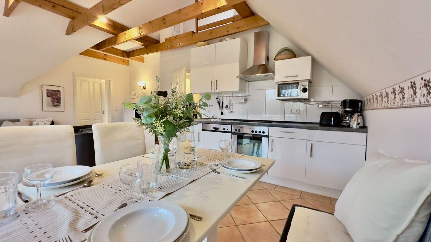 Die offene Wohnküche ist direkt mit dem Esszimmer im Wohnbereich verbunden und bietet alles, was man für die Selbstverpflegung im Urlaub benötigt. Der geräumige Esstisch bietet einen herrlichen Blick auf den Balkon und ausreichend Platz für gesellige Mahlzeiten sowie Spieleabende.