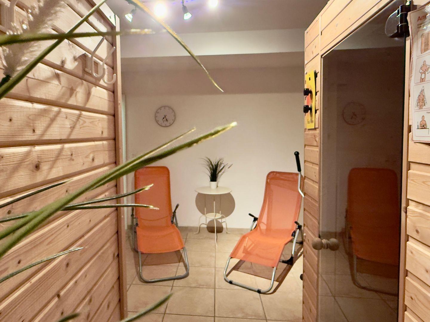 Unser Saunabereich steht allen Gästen offen, jedoch obliegt die Nutzung und Einstellung der Sauna Ihrer eigenen Verantwortung. Zusätzlich stehen zwei bequeme Saunaliegen für Ihre Entspannung bereit. Gönnen Sie sich eine Auszeit, genießen Sie die wohlige Wärme und tanken Sie neue Energie während Ihres Aufenthalts bei uns.