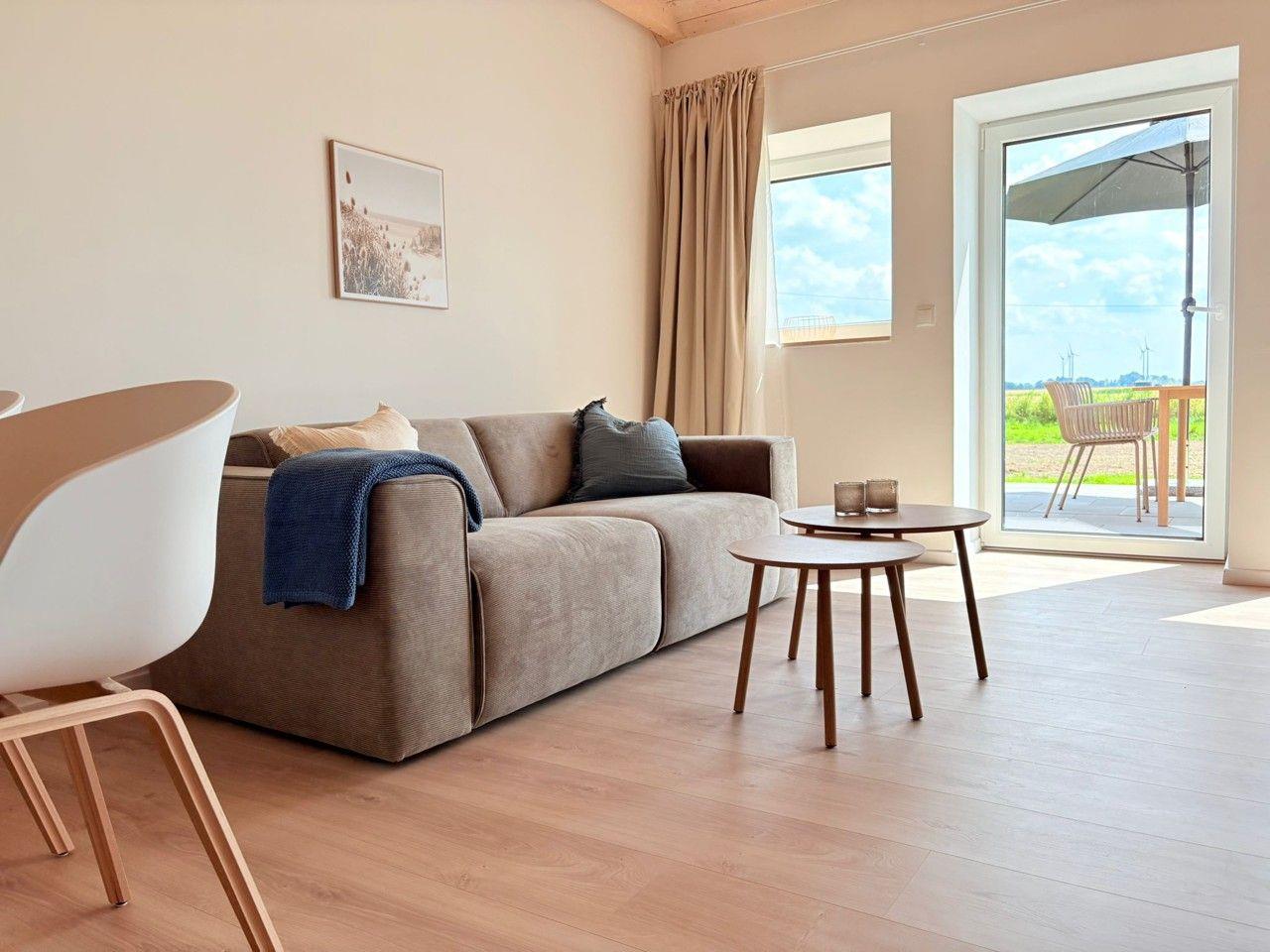 Die ebenerdige Wohnung hat einen offenen Wohnbereich mit großem Sofa und einem 55 Zoll Fernseher. Die moderne Küche, in der sich Hobby-Köche verwöhnen können, bietet ihnen einem Induktionsherd, Backofen, Mikrowelle, großen Kühlschrank mit Eisfach, Geschirrspüler und eine Nespresso-Maschine Delonghi mit Milchaufschäumer.