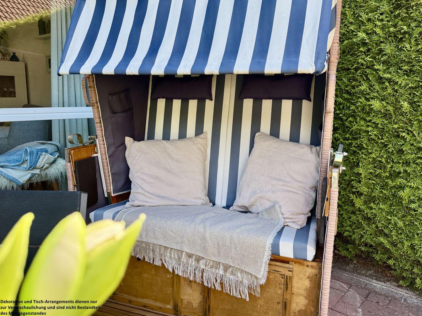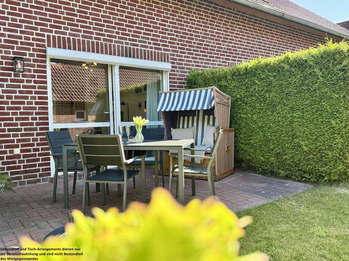 Durch das Wohnzimmer gelangen Sie direkt auf die angrenzende Terrasse, die mit einem bequemen Strandkorb ausgestattet ist. Ob mit einer Tasse Kaffee am Morgen oder einem Glas Wein am Abend – hier genießen Sie absolute Ruhe und einen herrlichen Blick ins Grüne.