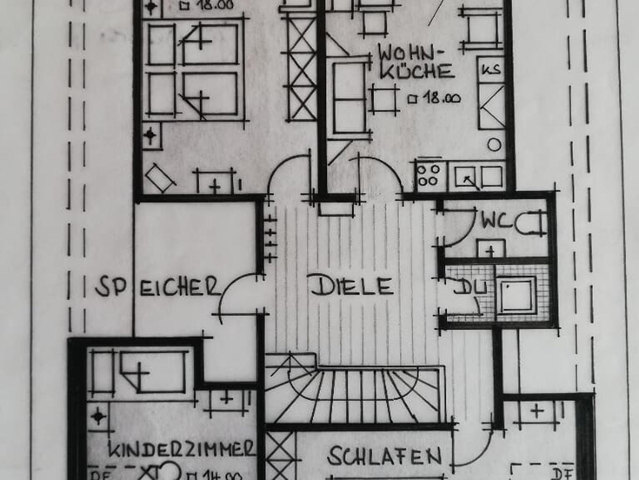 Die Ferienwohnung im Dachgeschoß ist 80qm groß und eignet sich mit den 3 Schlafräumen sehr gut für größere Familien oder Freundeurlaub.