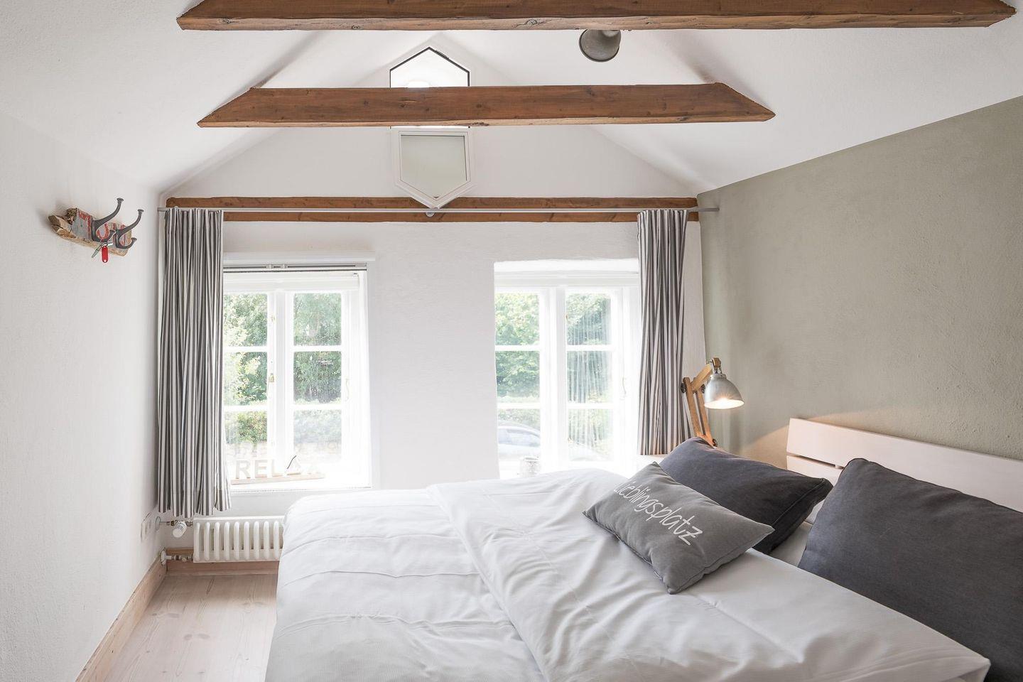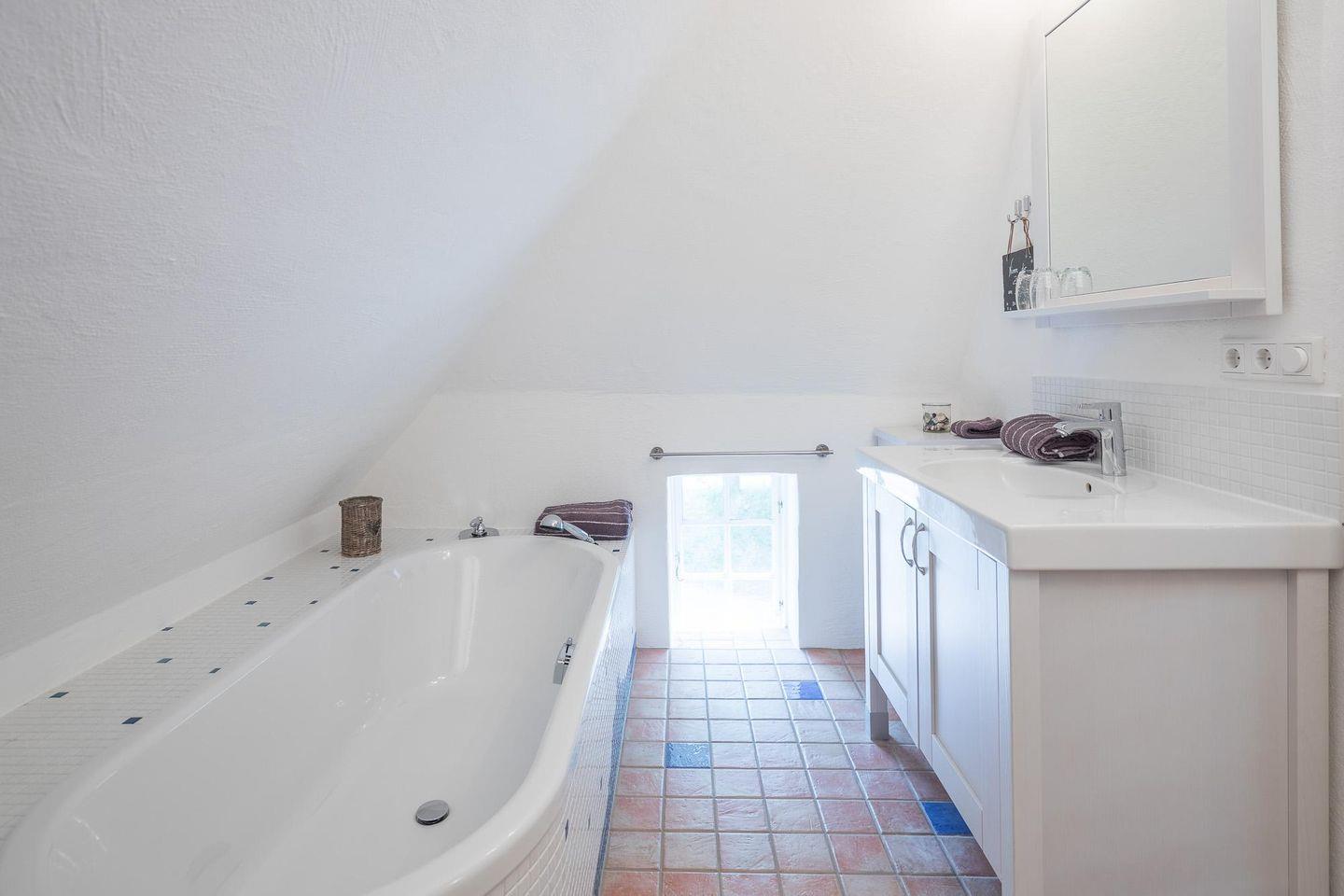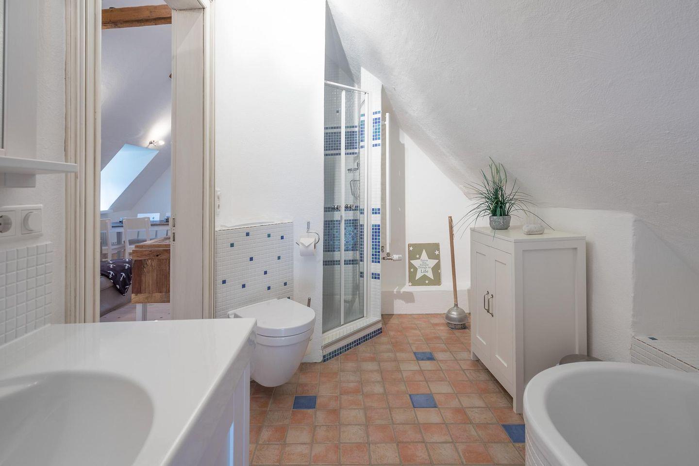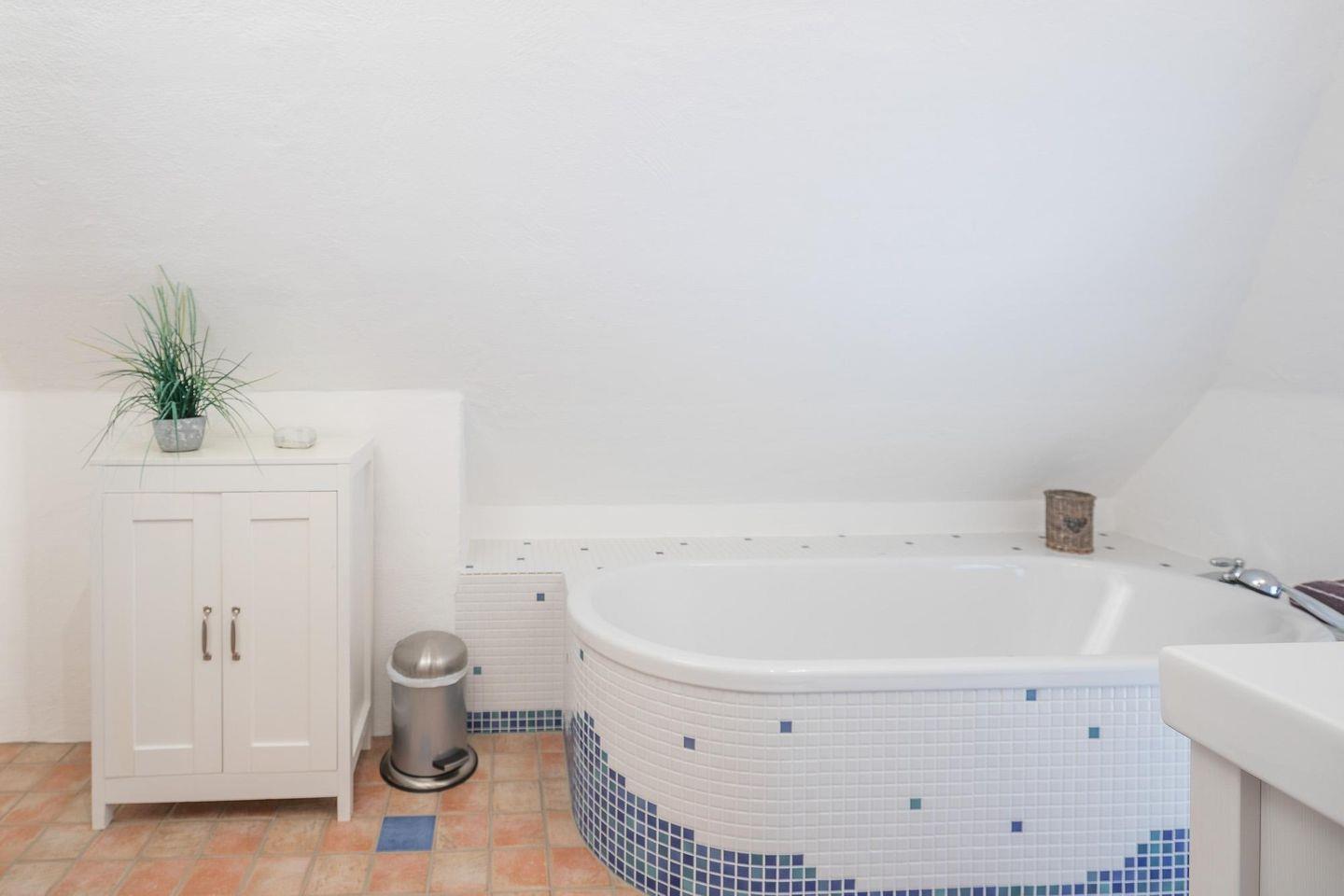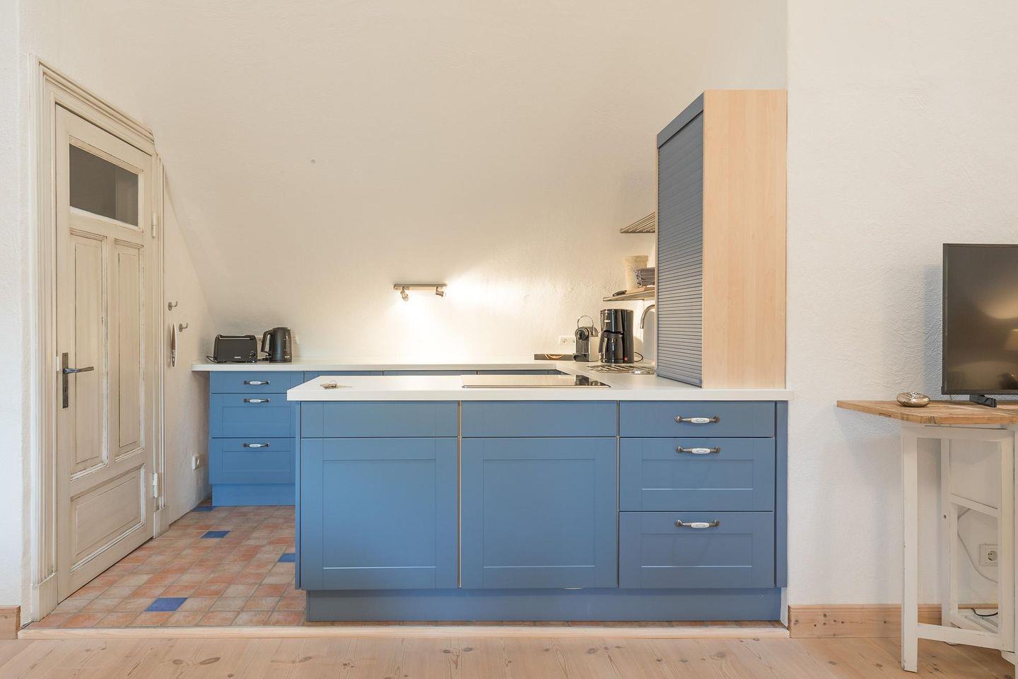 Unser stilvolles Apartment befindet sich im 1. Obergeschoss eines reetgedeckten Anwesens und ist über eine Außentreppe erreichbar. Es verfügt über ein Schlafzimmer mit einem komfortablen Doppelbett (180 x 200) und einen geräumigen Wohnbereich mit einer gemütlichen Sofalandschaft und Flachbild-TV. Die offene Küche ist bestens ausgestattet mit Backofen, Ceranfeld, Geschirrspüler, Toaster, Kaffeemaschine (Filtergröße 4), Nespresso-Maschine und Wasserkocher. Im Badezimmer finden Sie eine Dusche und eine Badewanne. Eine Waschmaschine steht Ihnen im Hauswirtschaftsraum zur Verfügung.
