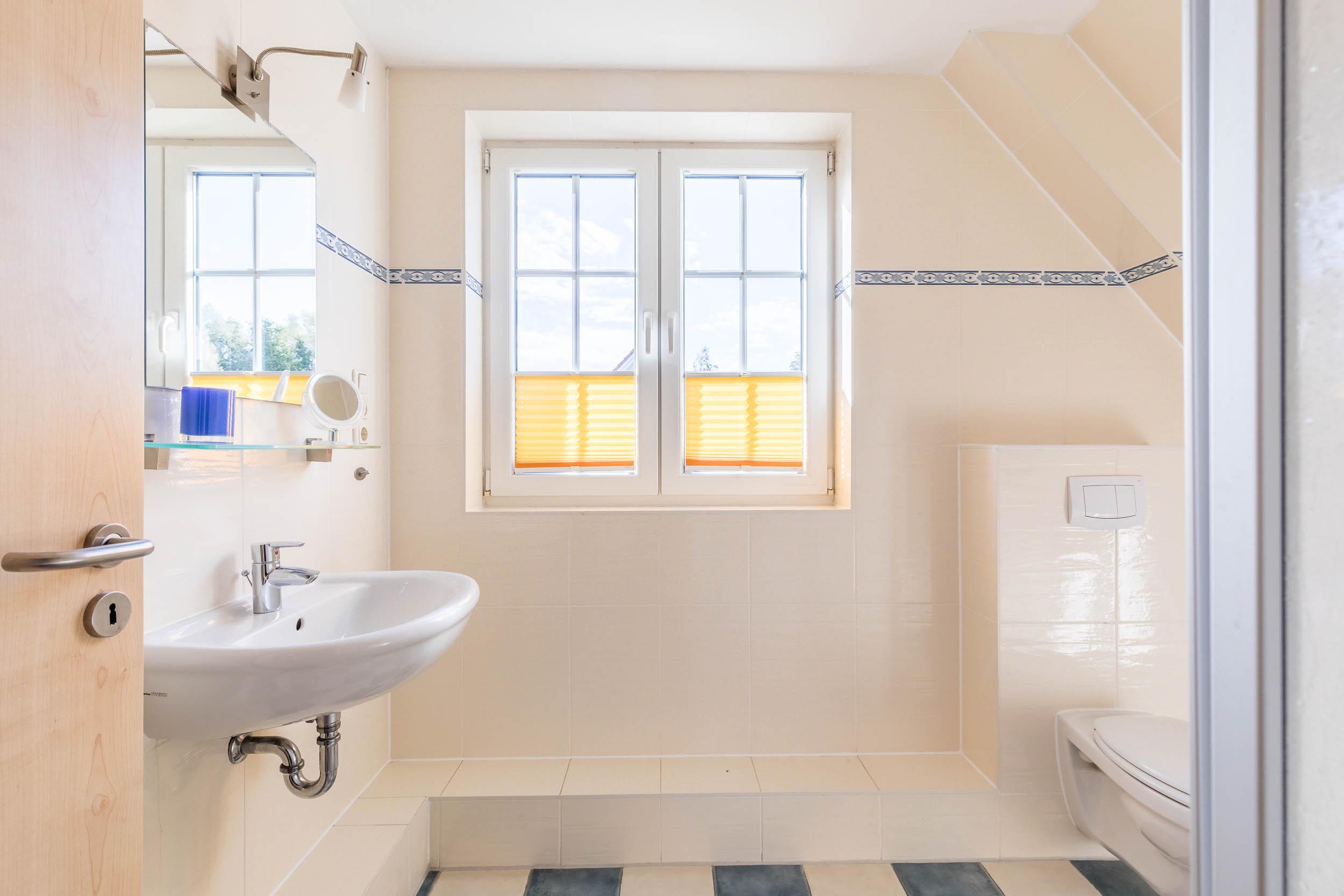 Ebenso finden Sie auf dieser Wohnebene das hell geflieste Badezimmer mit Tageslicht. Es ist mit Dusche und WC eingerichtet.