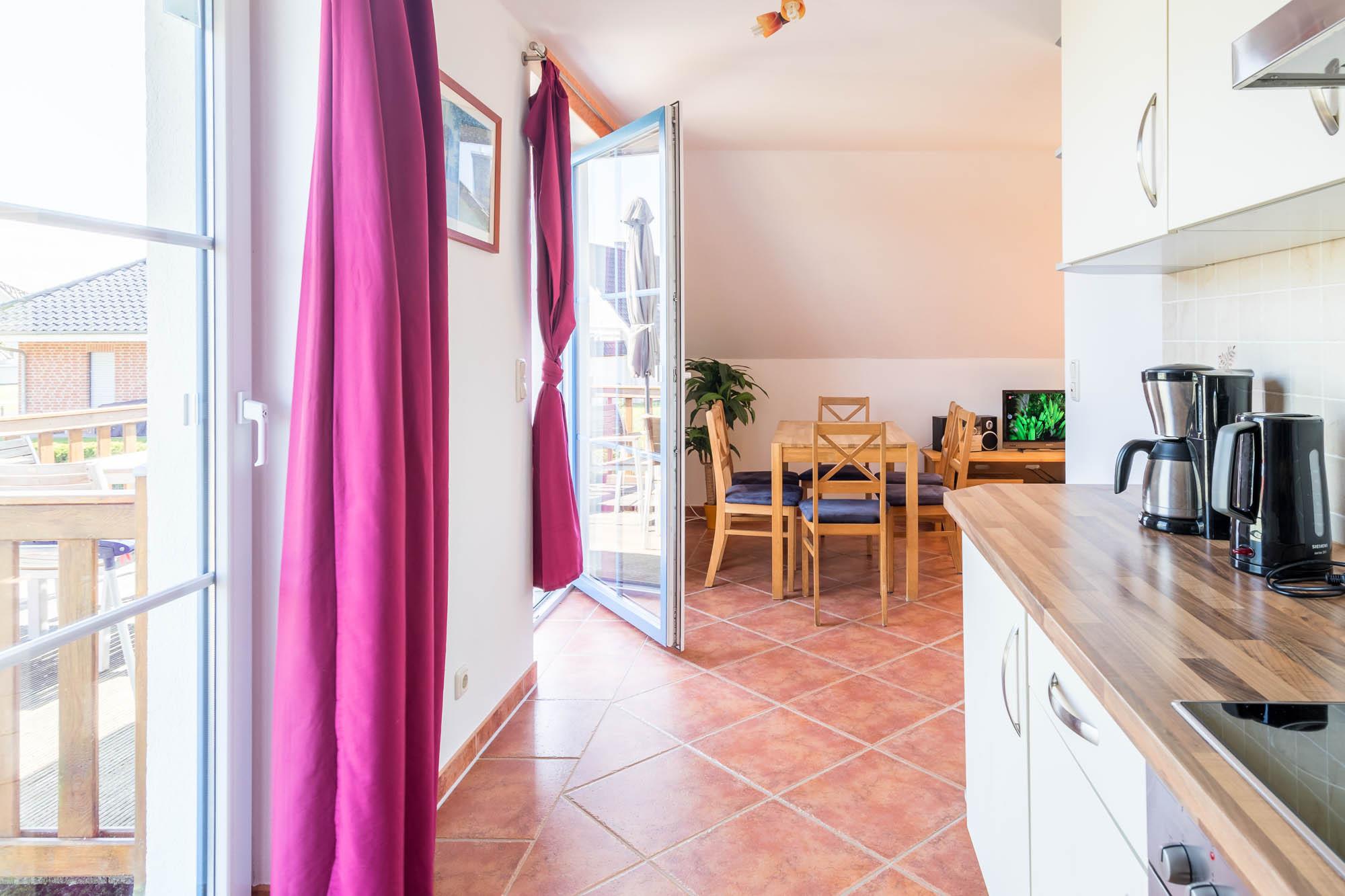 Vom Wohn- und Küchenbereich aus gelangen Sie auf den möblierten Balkon, welcher einen tollen Ausblick über die schönen Ferienhäuser hinweg zur Ostsee bietet.