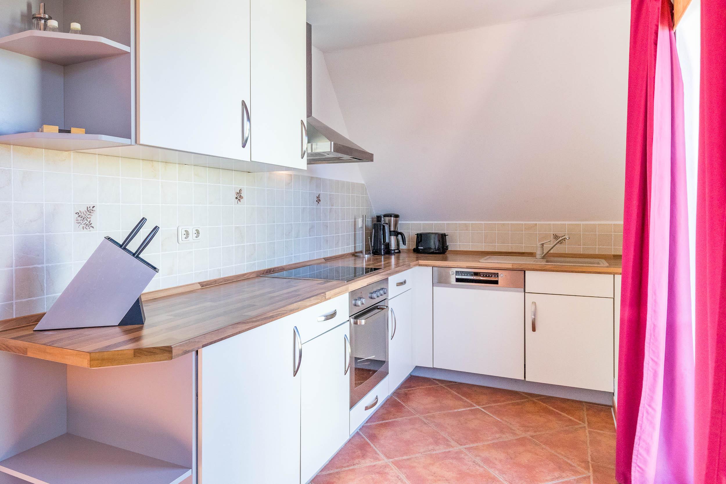 Die offene Wohnküche bietet eine komfortable Ausstattung, so ist u.a. auch ein Geschirrspüler vorhanden.
