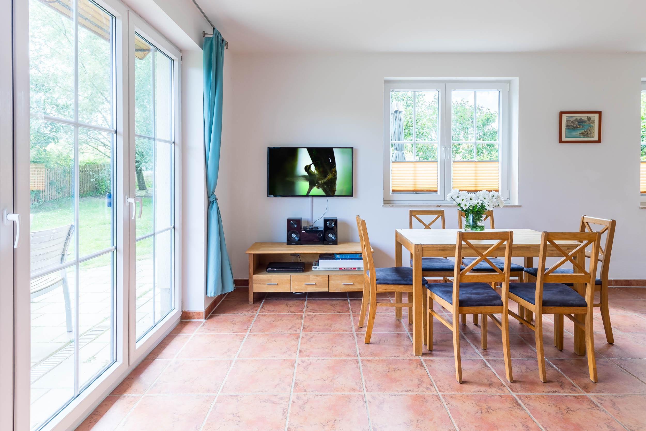 Durch eine Glastür geht es gleich hinaus auf die möblierte Terrasse in Südausrichtung. Sie kann bei schönem Wetter zum zweiten Wohnzimmer werden. Hier darf auch gegrillt werden.