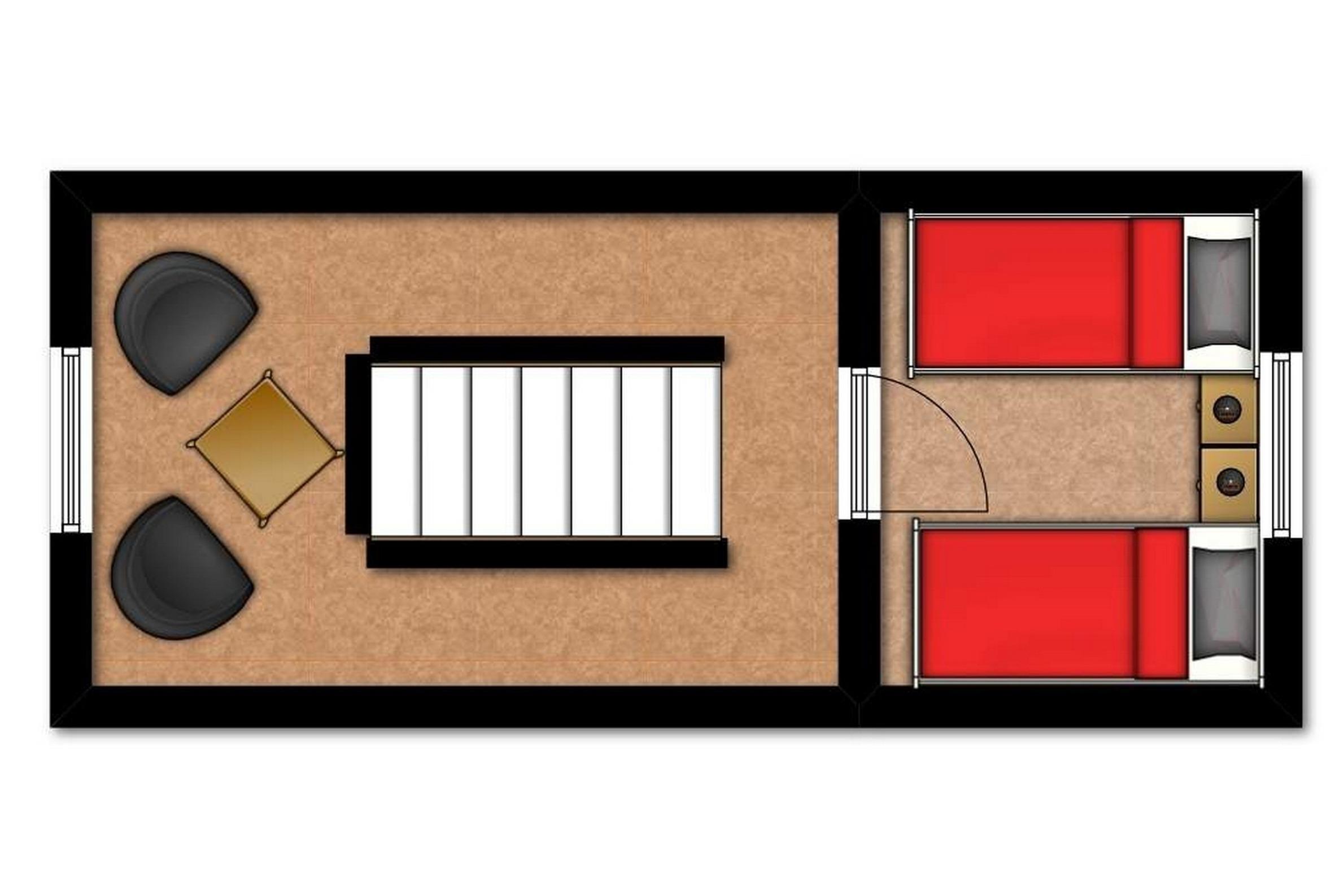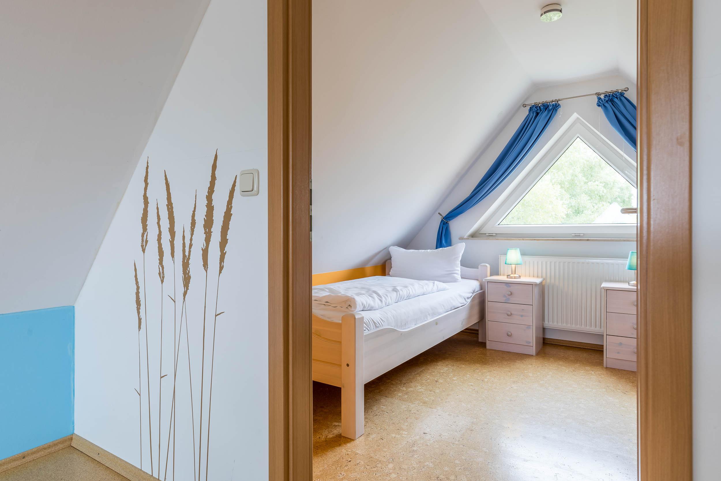 In der oberen Wohnebene, dem Dachgeschoss erreichen Sie über die offene Galerie mit kleiner Sitzecke das Kinder-/ Gästezimmer mit zwei bequemen Einzelbetten.
