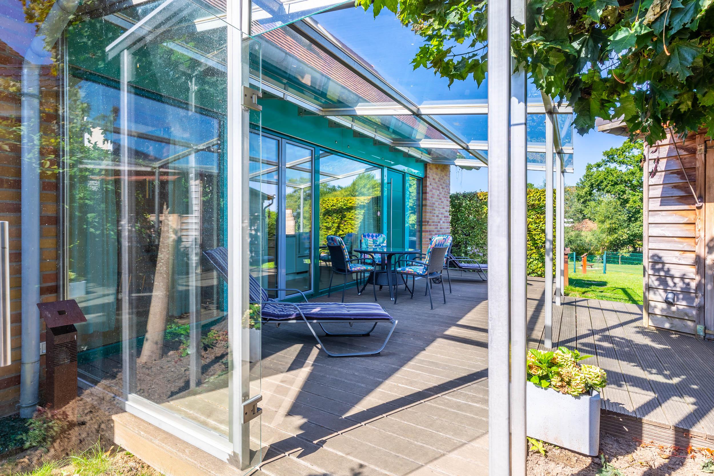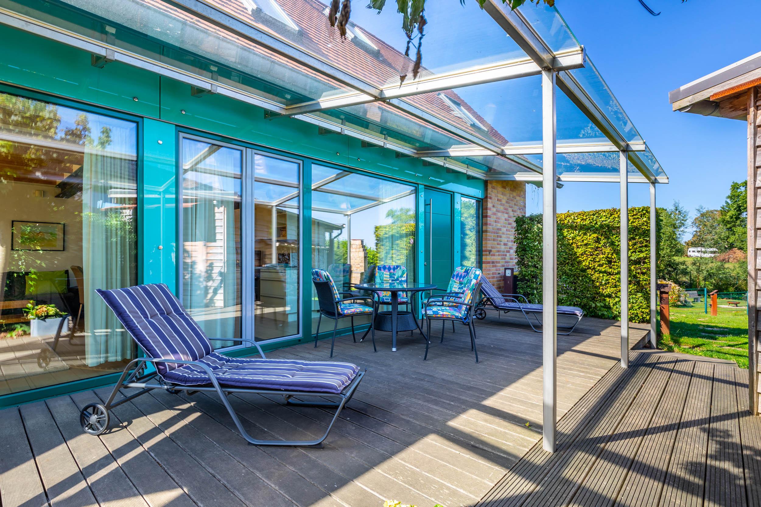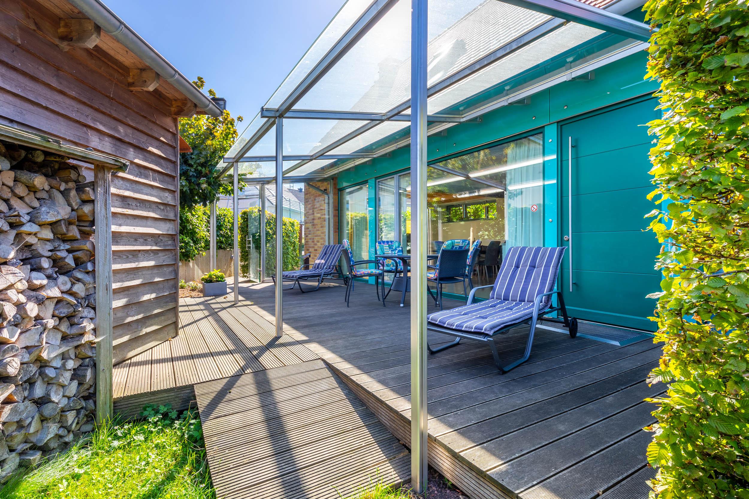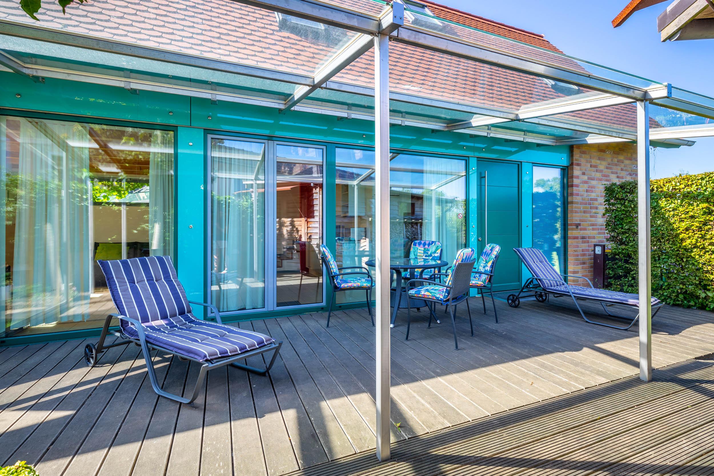Die möblierte Ost-Terrasse lädt nicht nur zum Grillen ein.