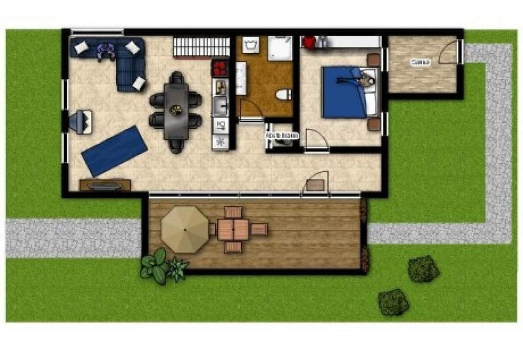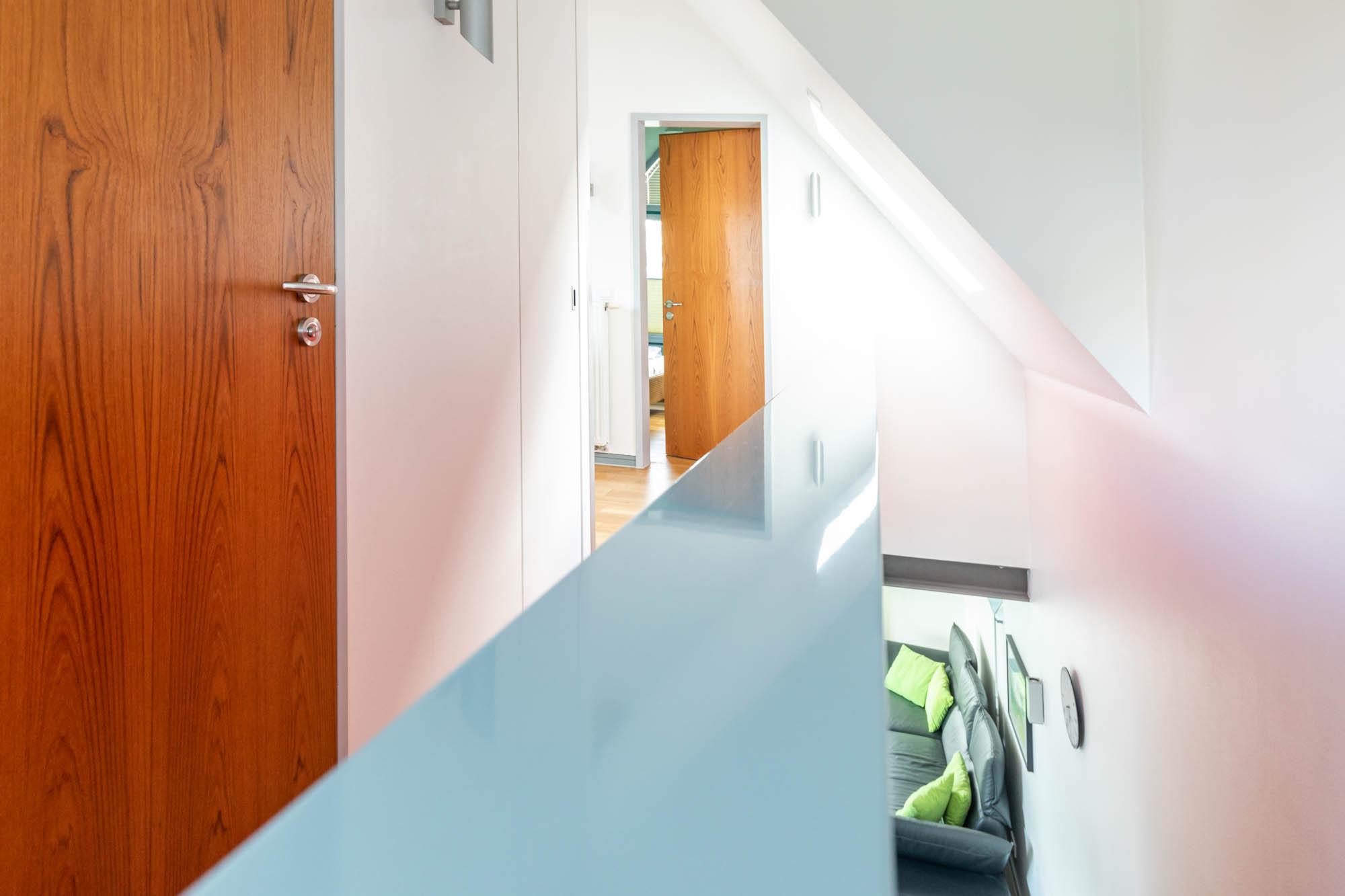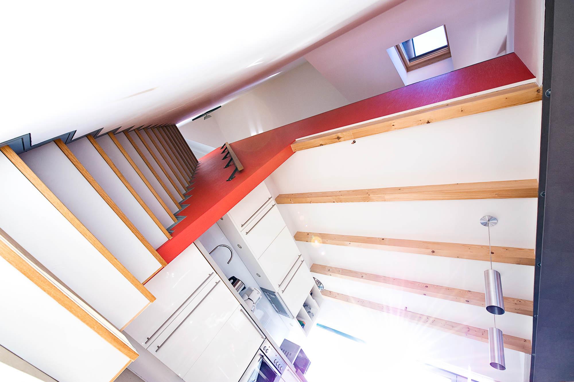 Eine Treppe führt vom Wohn-/ Küchenbereich aus in die 2. Wohnebene, ins Obergeschoss.