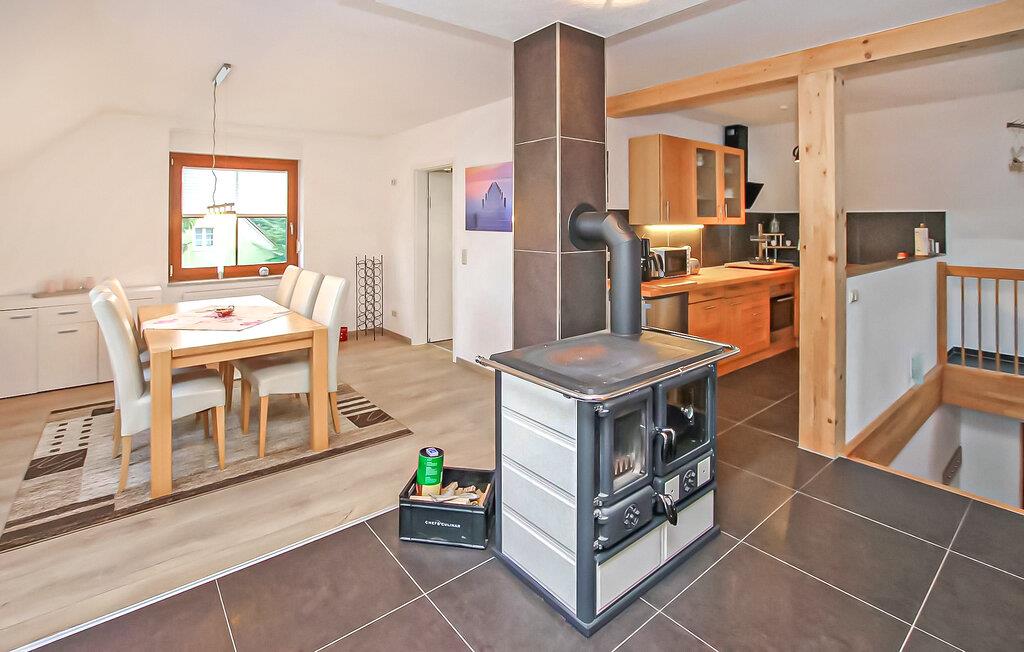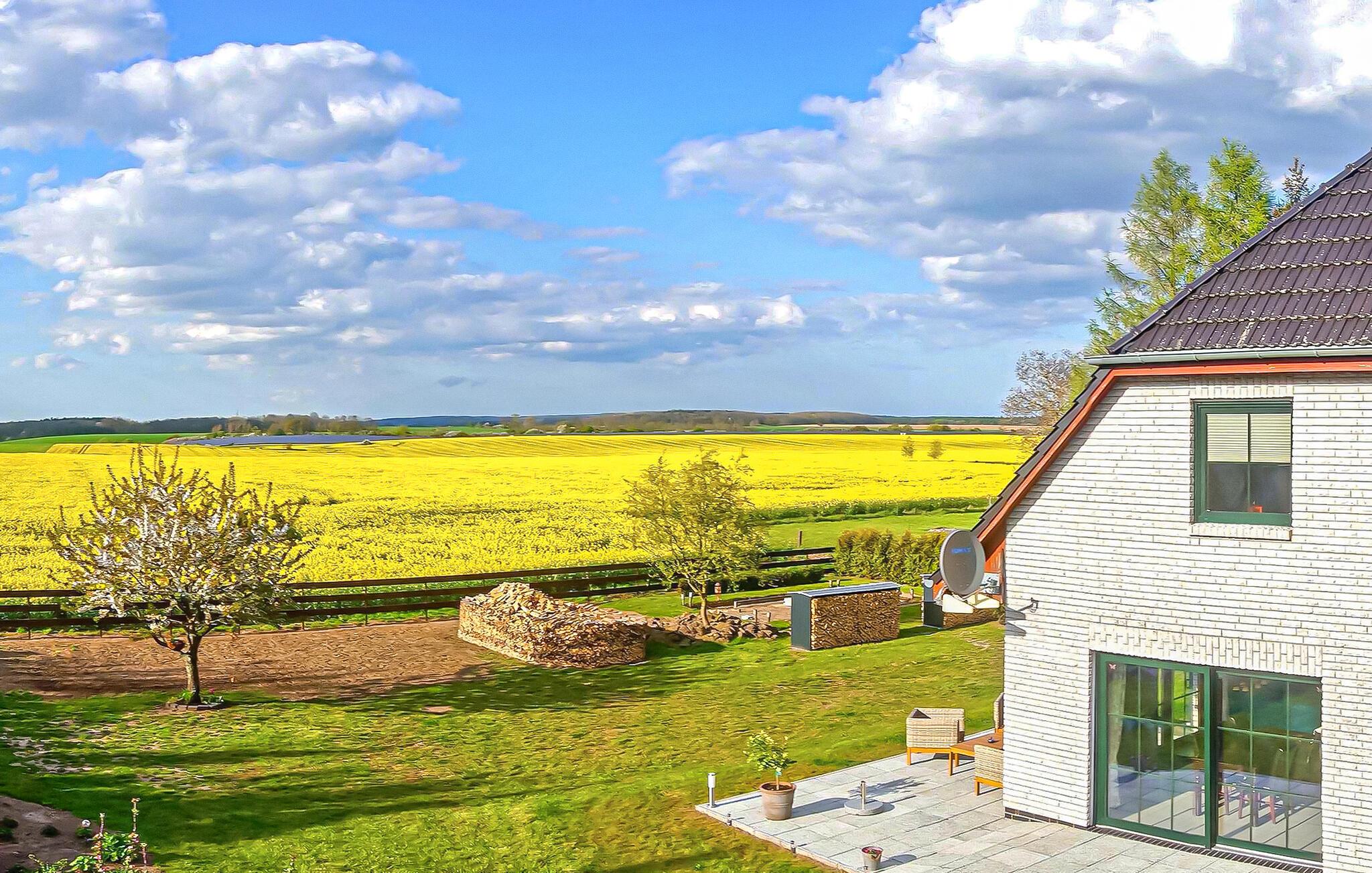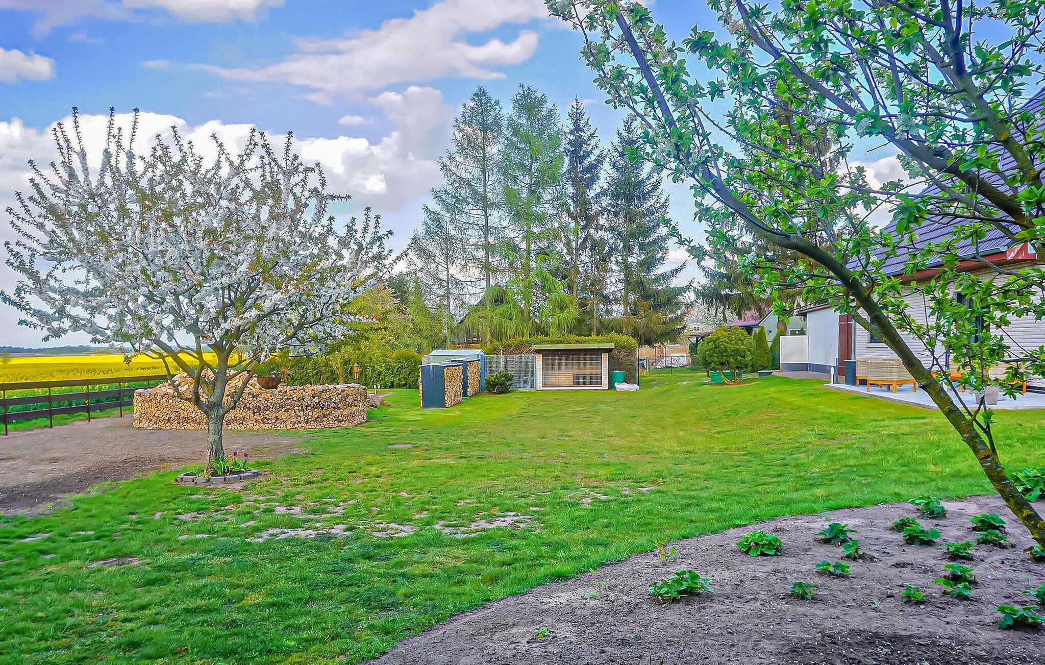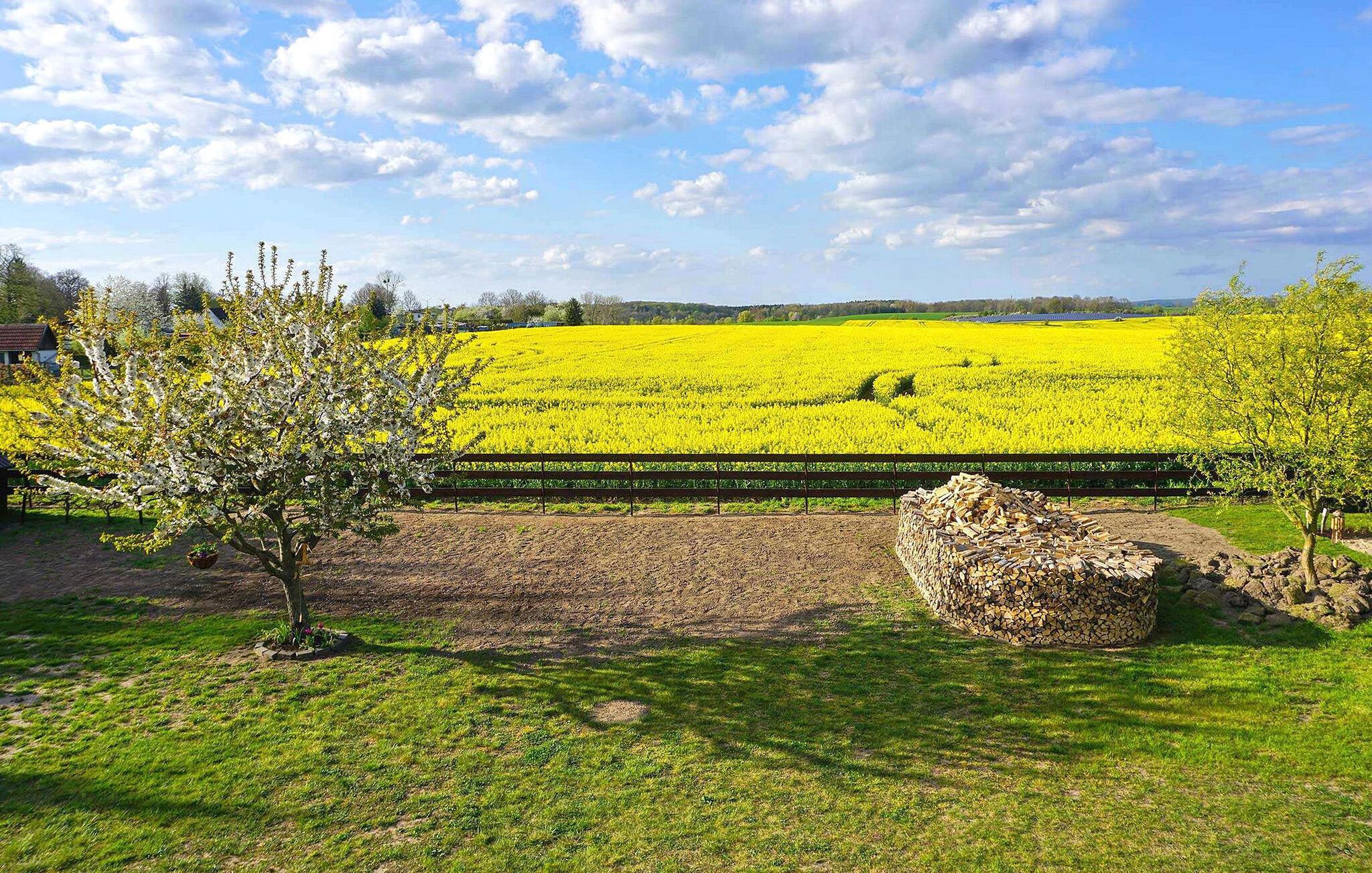 Roligt og landligt beliggende i udkanten af Helpt, den ene af to nyrenoverede ferielejligheder til 6 personer i det ca. 1.700 m² helt indhegnede enfamiliehus. Et badeområde ved Mühlensee er ca. 1,5 km væk, butikker og restauranter i møllebyen Woldegk ca. Den røgfri, cirka 95 m² store lejlighed strækker sig over to plan og kan nås via en fælles gang. Det er smagfuldt indrettet og har møbler af høj kvalitet, centralvarme og insektbeskyttelse. På første sal er der en stor stue (opholdsstue, lænestol, fladskærms TV, DVD og Blueray-afspiller, radio/CD, LAN-forbindelser) med åbent køkken (spisebord, pejs til bagning eller madlavning i wok, køkkengrej tilgængelig, el-komfur med ovn, opvaskemaskine, køleskab, mikroovn, forskellige små køkkenmaskiner), et soveværelse (2 enkeltsenge, fladskærms-tv) og det rummelige badeværelse (badekar, toilet, hårtørrer). Den åbne trappe fører til et åbent soveværelse (ekstra seng) og et andet soveværelse (dobbeltseng, fladskærms-tv). Denne lejlighed har en møbleret pavillon i haven. Alle gæster har adgang til et bryggers med vaskemaskine og tørretumbler (5 EUR/vaskecyklus), samt en carport per lejlighed (ekstra parkeringsmuligheder til rådighed), siddepladser, en grill, en stor pavillon og to liggestole på omfattende ejendom, en cykelkælder og opbevaringsrum, en børneseng og gratis WiFi. Den samlede pris inkluderer slutrengøring, vand- og energiforbrug, brænde, sengelinned og håndklæder (INGEN badehåndklæder). Betales på stedet: brug af vaskemaskine/tørretumbler (5 EUR/vask). Én hund er tilladt i denne ejendom. Små hunde (ingen katte) op til 30 cm i størrelse er tilladt i lejligheden, større dyr indkvarteres i en hytte med løb på ejendommen. Helpt er et distrikt i møllebyen Woldegk og er bedst kendt for Helpter-bjergene, som på omkring 179 m over havets overflade er den højeste naturlige højde i Mecklenburg-Vorpommern. Den skovklædte højderyg er indlejret i et blidt kuperet landskab - omgivet af skove og søer - som indbyder til omfattende opdagelser i naturen til fods eller på cykel. Butikker og restauranter findes i Woldegk, ca. 4 km væk, som primært er kendetegnet ved i alt fem bevarede vindmøller. Tre af dem ligger på Mühlenberg og er åbne for besøgende som café, museum og teknisk monument. Distriktsbyen Mecklenburg Lake District Neubrandenburg, kun 20 km væk, er også et besøg værd. Udover mange indkøbsmuligheder byder fireportsbyen også på forskellige restauranter, caféer og pubber. Ud over den historiske bymur og Tollensesee er en særlig attraktion koncertkirken, som er kendt uden for Mecklenburgs grænser, med sit nye orgel, hvor adskillige koncerter og arrangementer finder sted.