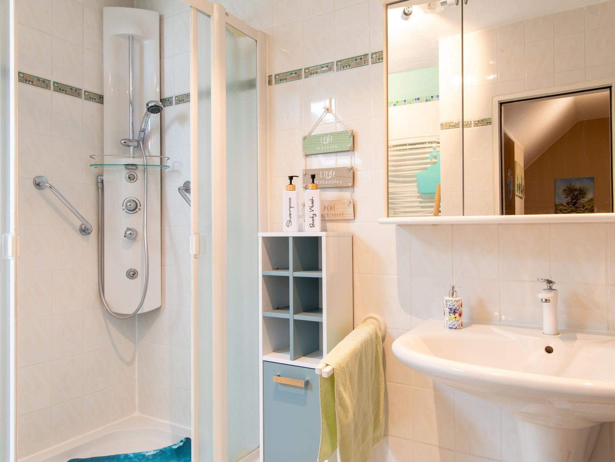 Das gemeinschaftlich genutzte Etagenbad bietet Dusche, Badewanne, WC & Pflegeprodukte.
