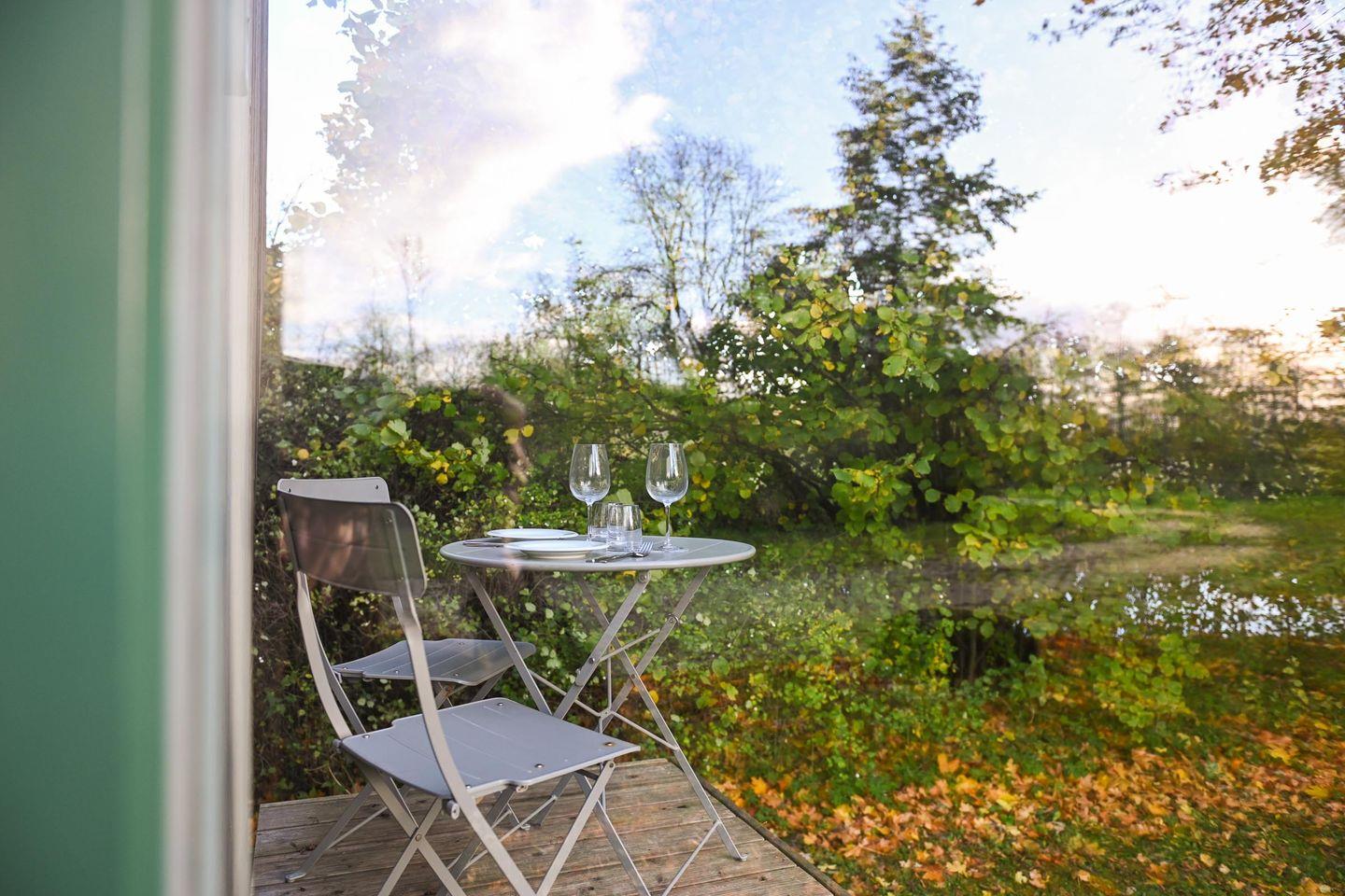 Dein Sleep Space steht naturnah auf einer grünen Fläche und eröffnet durch das große Panoramafenster einen beruhigenden Blick ins Umland. Vögel, Bäume und wechselndes Licht begleiten dich durch den Tag. Das Cabin stammt von Green Tiny Houses und wurde nachhaltig gebaut: auf einem Trailer, ohne Bodenversiegelung, gedämmt mit natürlichen Materialien und mit einem klaren, zeitlosen Design. Genau dieser bewusste Minimalismus macht den Aufenthalt so besonders.