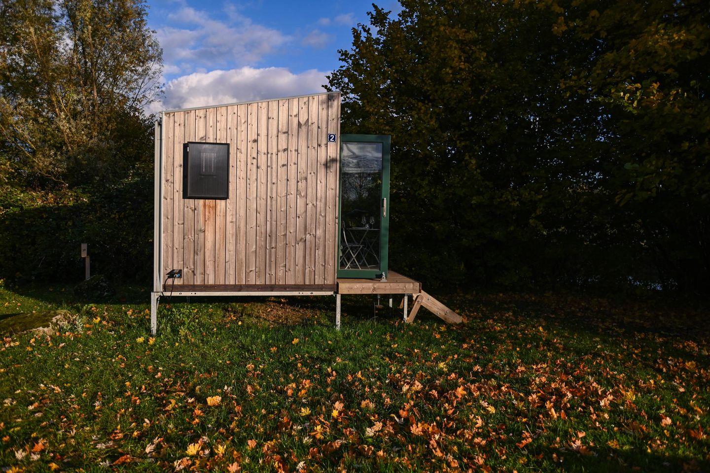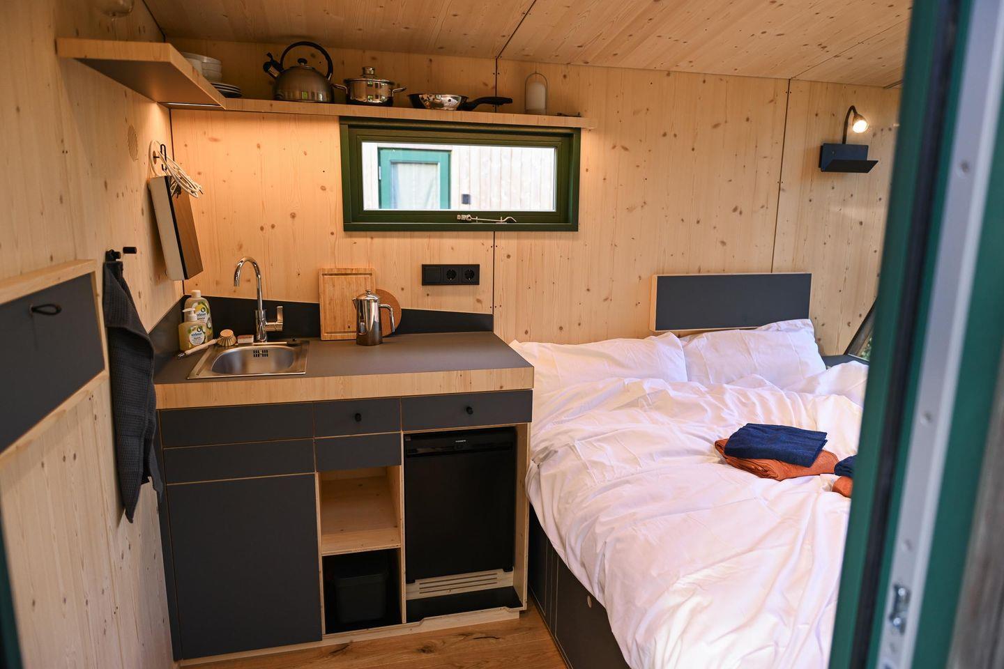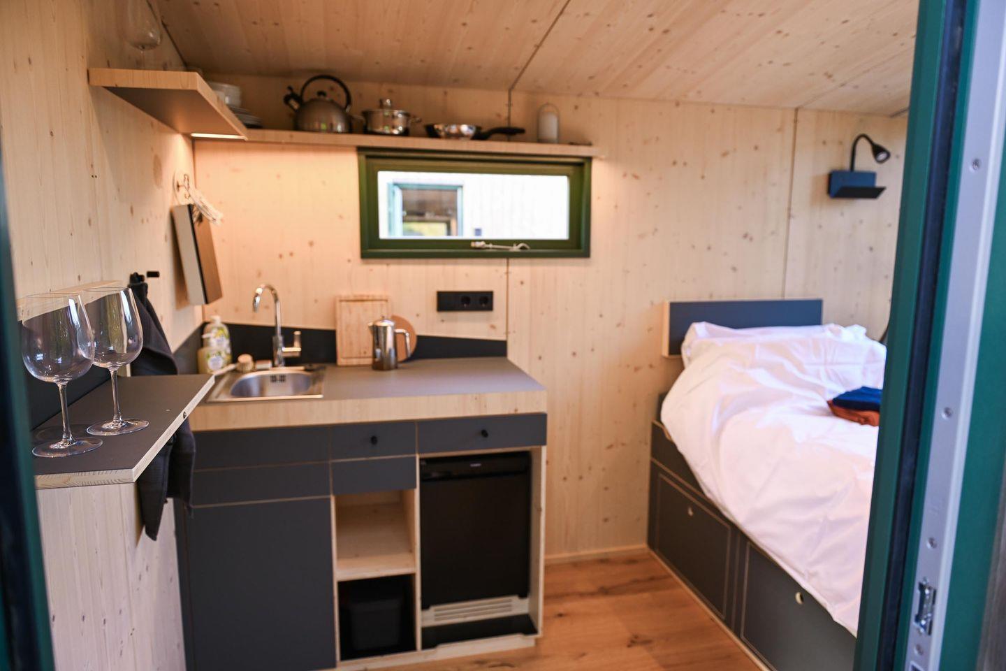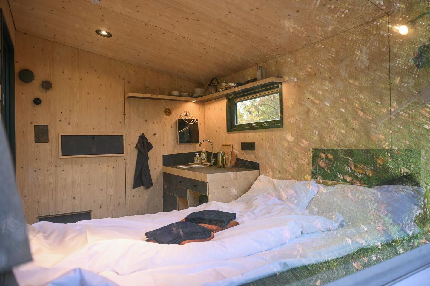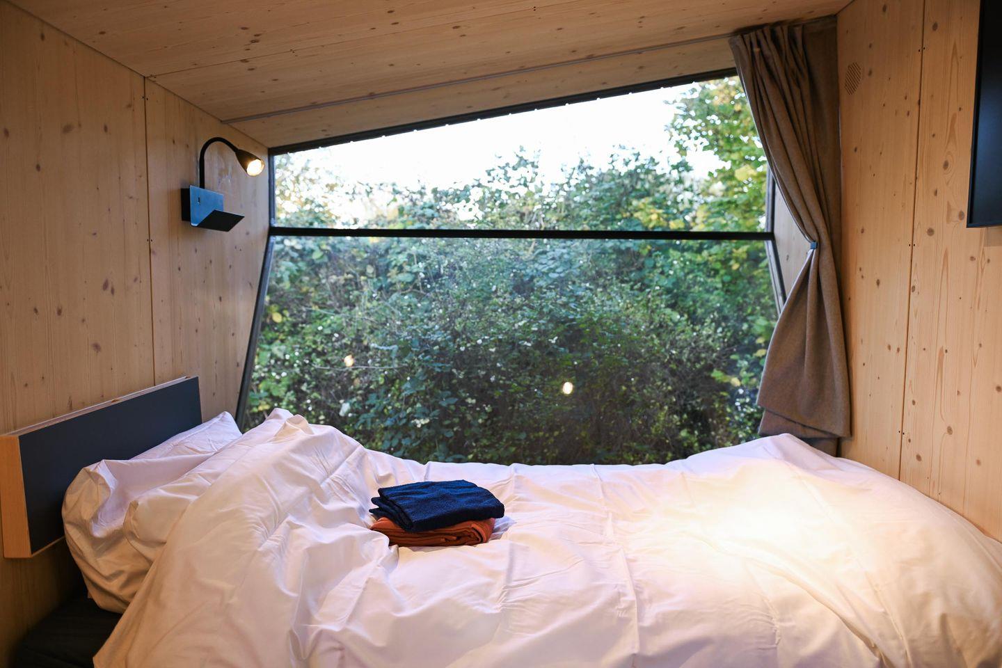 Auf rund fünf Quadratmetern findest du alles, was du für eine Auszeit brauchst. Tagsüber lädt die gemütliche Loungefläche zum Lesen, Schreiben, Träumen oder einfach zum Nichtstun ein. Abends verwandelst du sie in dein komfortables Bett (1,40 × 2,00 m) mit hochwertiger Bettwäsche, Decken und Kissen. Die Atmosphäre ist ruhig, warm und reduziert – perfekt, um abzuschalten und tief durchzuatmen. Das Panoramafenster lässt sich für die Nacht abdunkeln und schenkt dir dennoch das Gefühl, im Grünen zu schlafen.