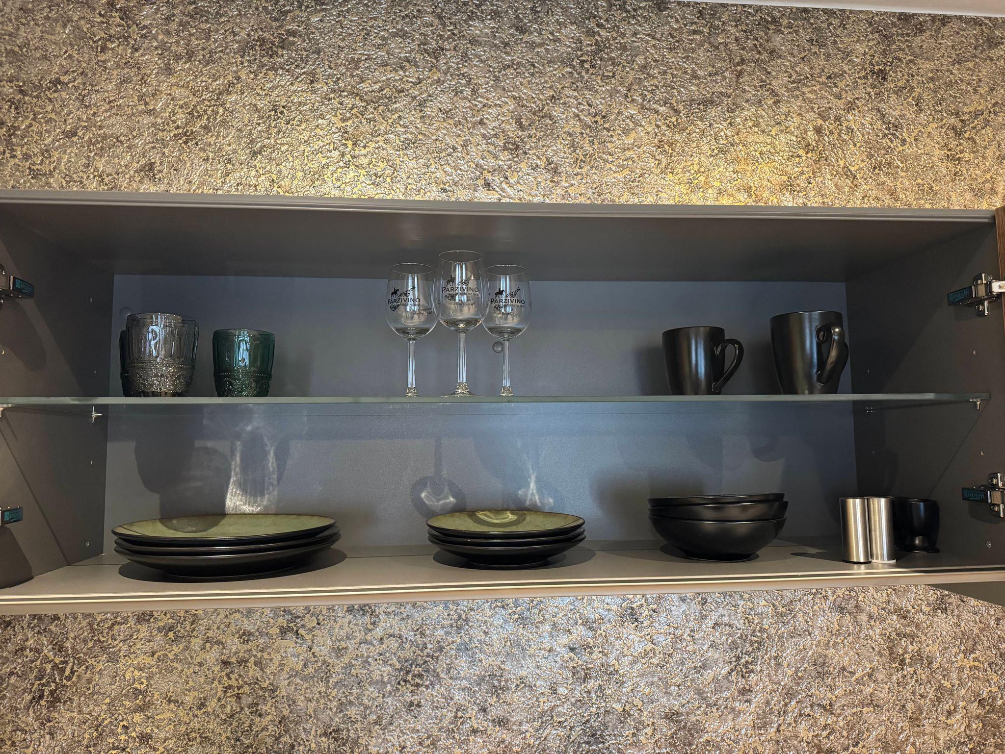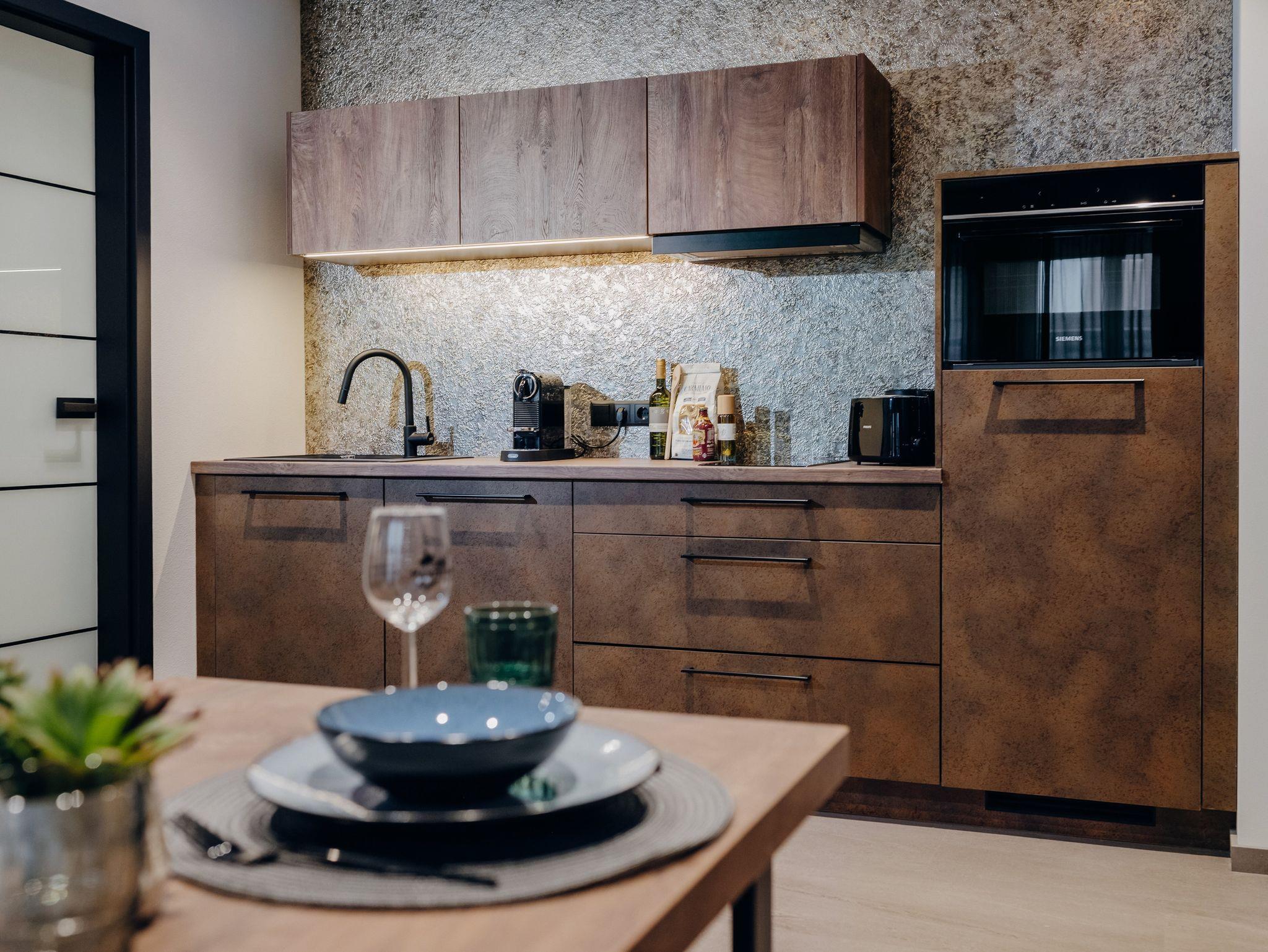 Vollwertige Küchenzeile: Mit Geschirrspüler, Nespresso-Maschine, Backofen und Mikrowelle.