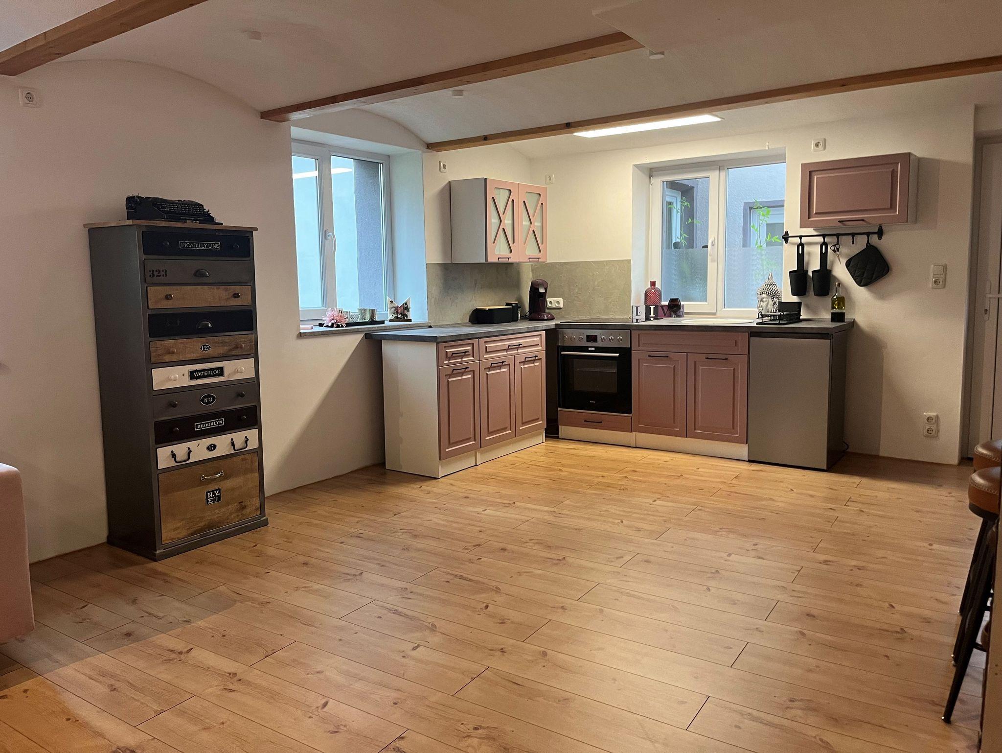 Unsere 2024 neu gebaute und gemütliche Ferienwohnung im vintage-modern Stil mit ca 60qm ist ebenerdig mit separatem Eingang und bietet Platz für 1-4 Personen. Die komplett ausgestattete Küche mit Kühlschrank, Herd, Backofen, Wasserkocher und Kaffeemaschine lässt keine Wünsche offen. Die FeWo verfügt über ein Schlafzimmer mit einem Doppelbett. Die Wohnküche mit Schlafcouch, TV und Sitzgelegenheit runden das Gesamtbild ab. Offene lichtdurchflutete Studiowohnung. Gerne kann ich auf Anfrage ein Babybett bzw. Babyhochstuhl zur Verfügung stellen. Die Terrasse lädt zum Verweilen ein. Grillmöglichkeit vorhanden.