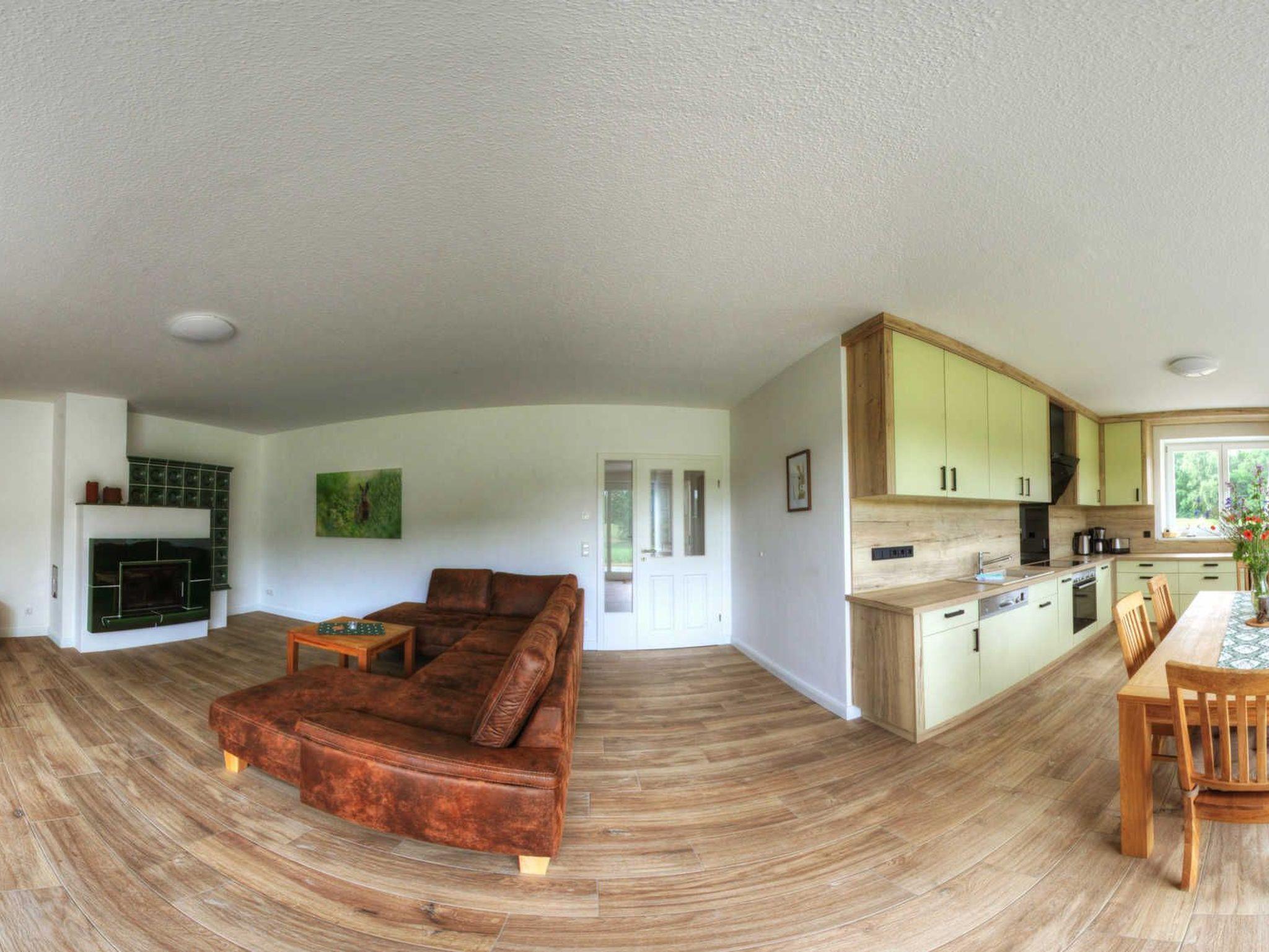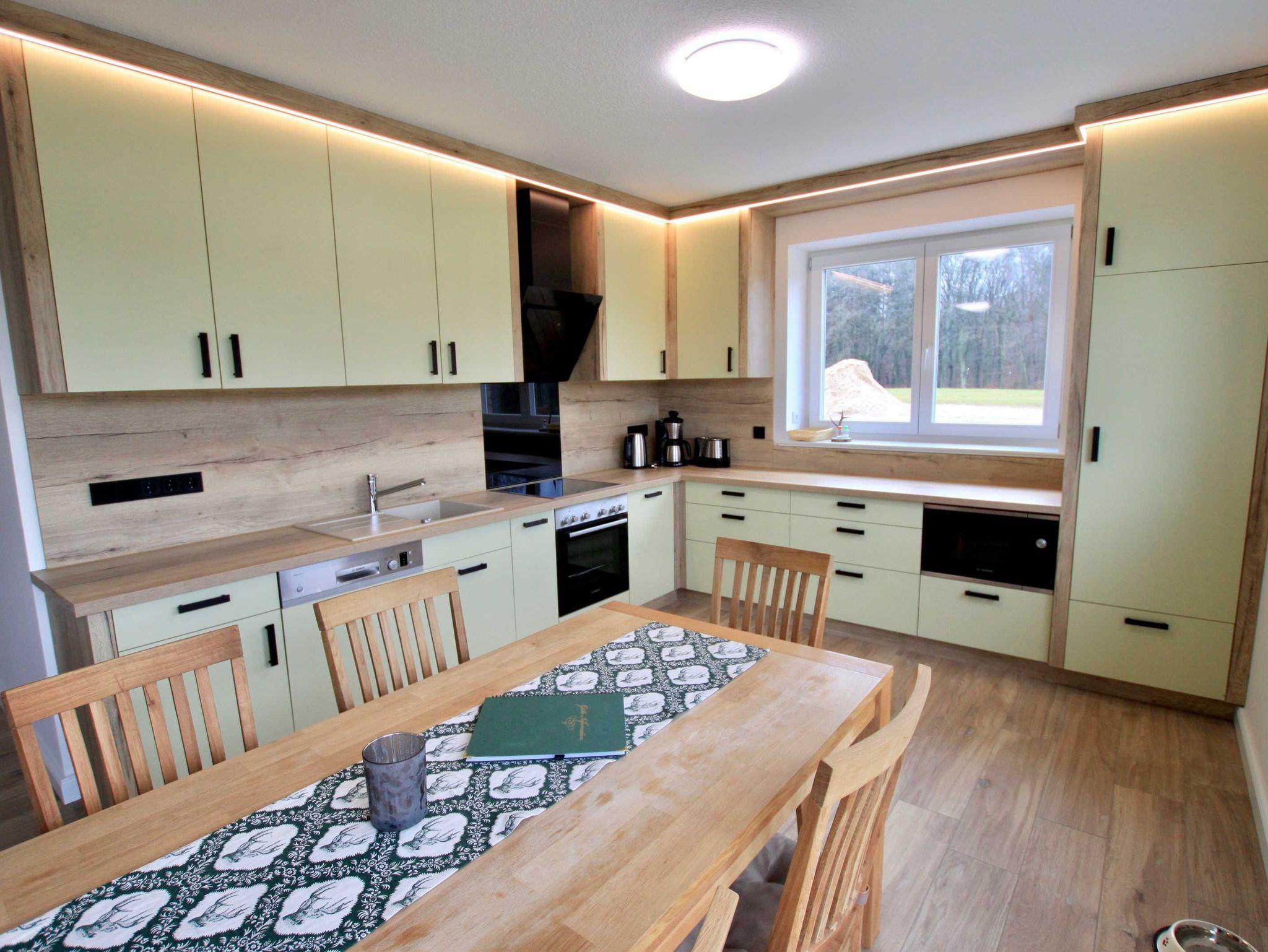 Die Ferienwohnung verfügt über eine sehr große helle Küche mit offenem Wohn- und Essbereich. Schauen sie beim Abendbrot dem Knistern des Feuers zu oder genießen Sie durch die großen Fenster die wundervolle Aussicht.