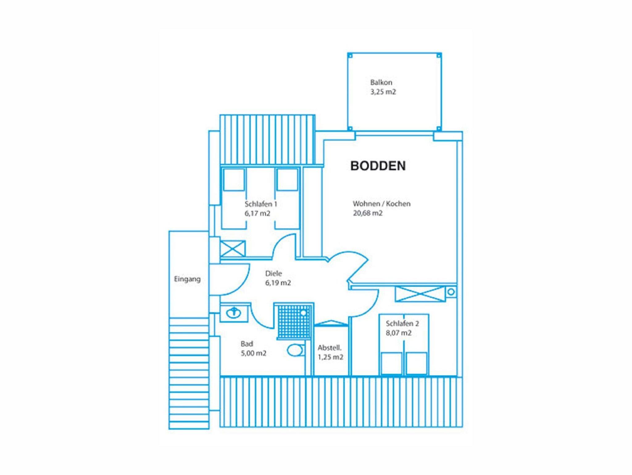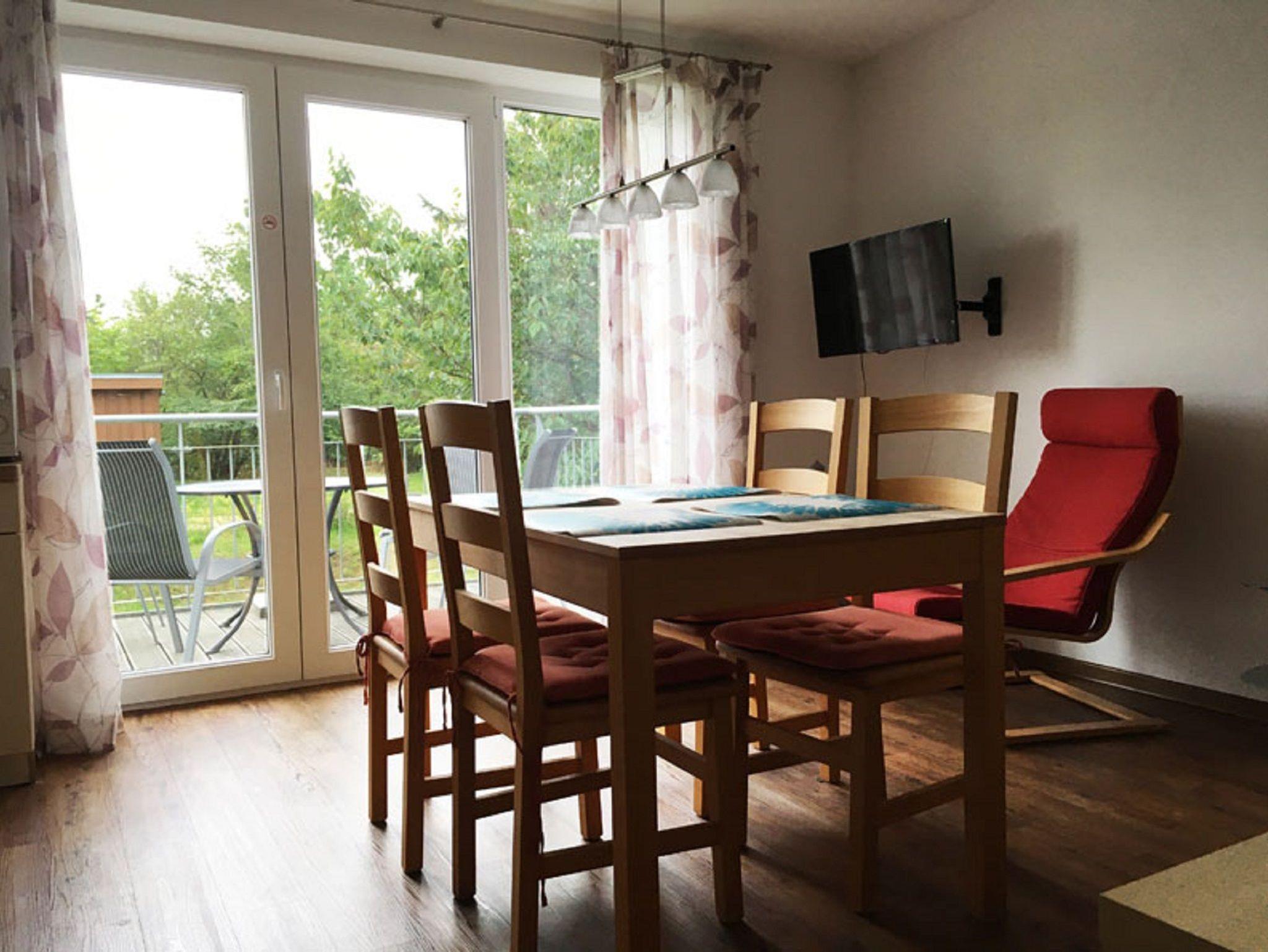 Die Ferienwohnung Bodden befindet sich im Obergeschoss des Hauses und ist ca. 49 m² groß. Das geräumige Wohnzimmer ist ausgestattet mit einem gemütlichen Sofa, Sessel zum Lesen und Fernsehen, mit einem Fernseher und mit einem Radio, sowie mit einem Esstisch und vier Stühlen. Durch das große Balkonfenster haben Sie einen schönen Ausblick ins Grüne. Die offene Küchenzeile verfügt über eine Ausstattung zum alltäglichen Kochen: Geschirr, Kochgeschirr, Ceranfeld, Backofen, Kühlschrank, Spülmaschine, Mikrowelle, Kaffeemaschine, Wasserkocher und Toaster.