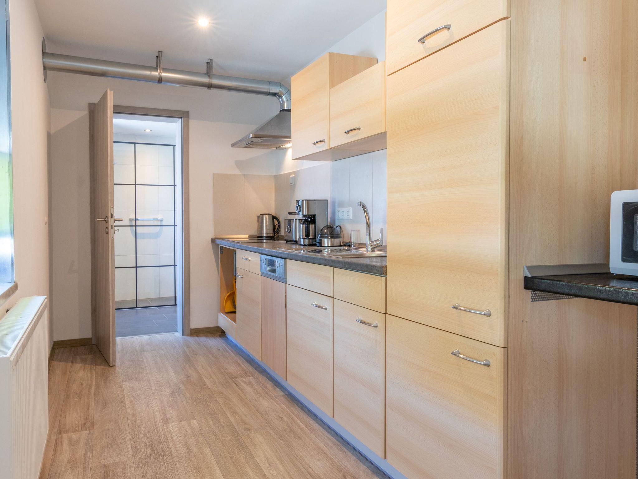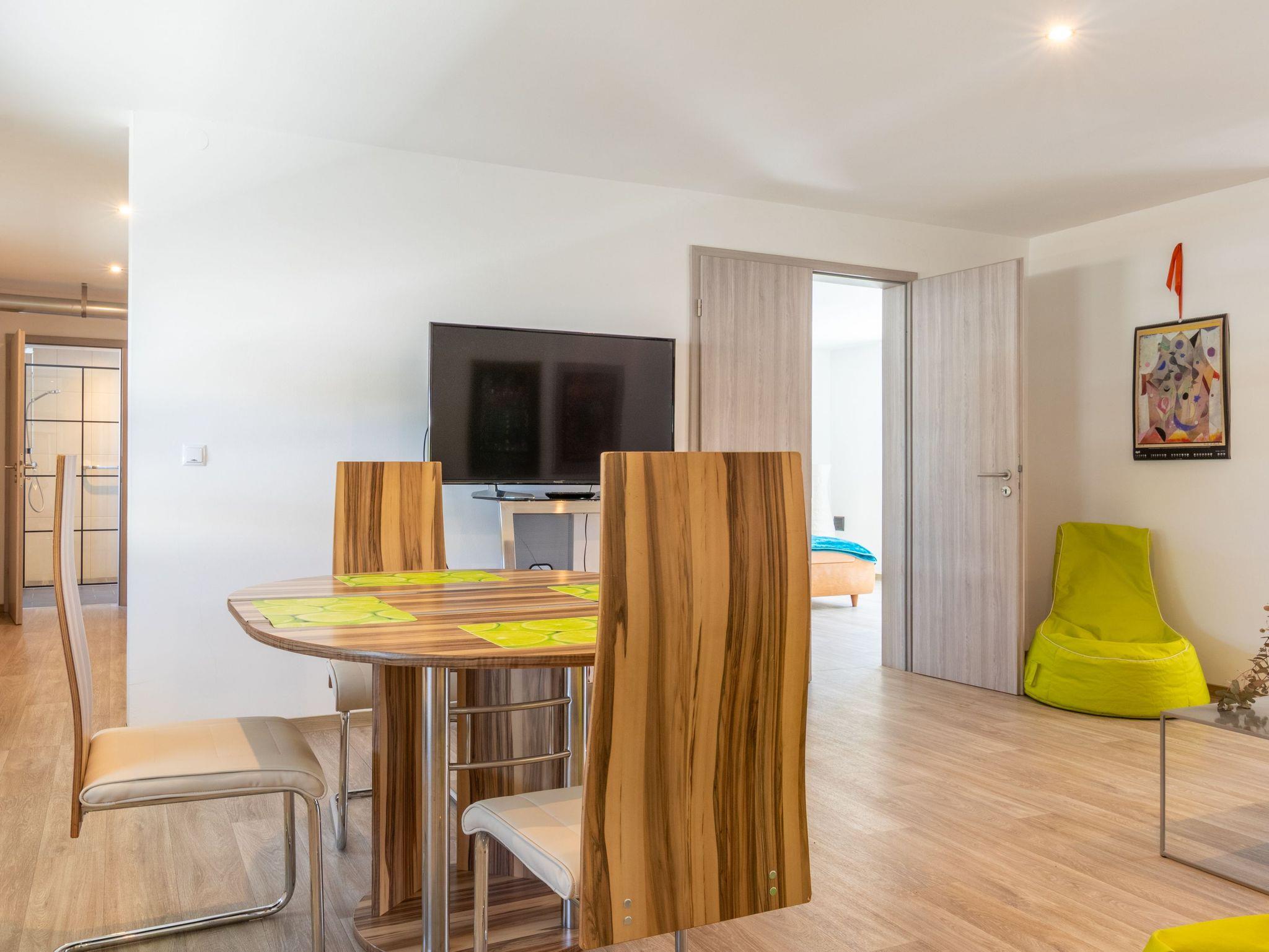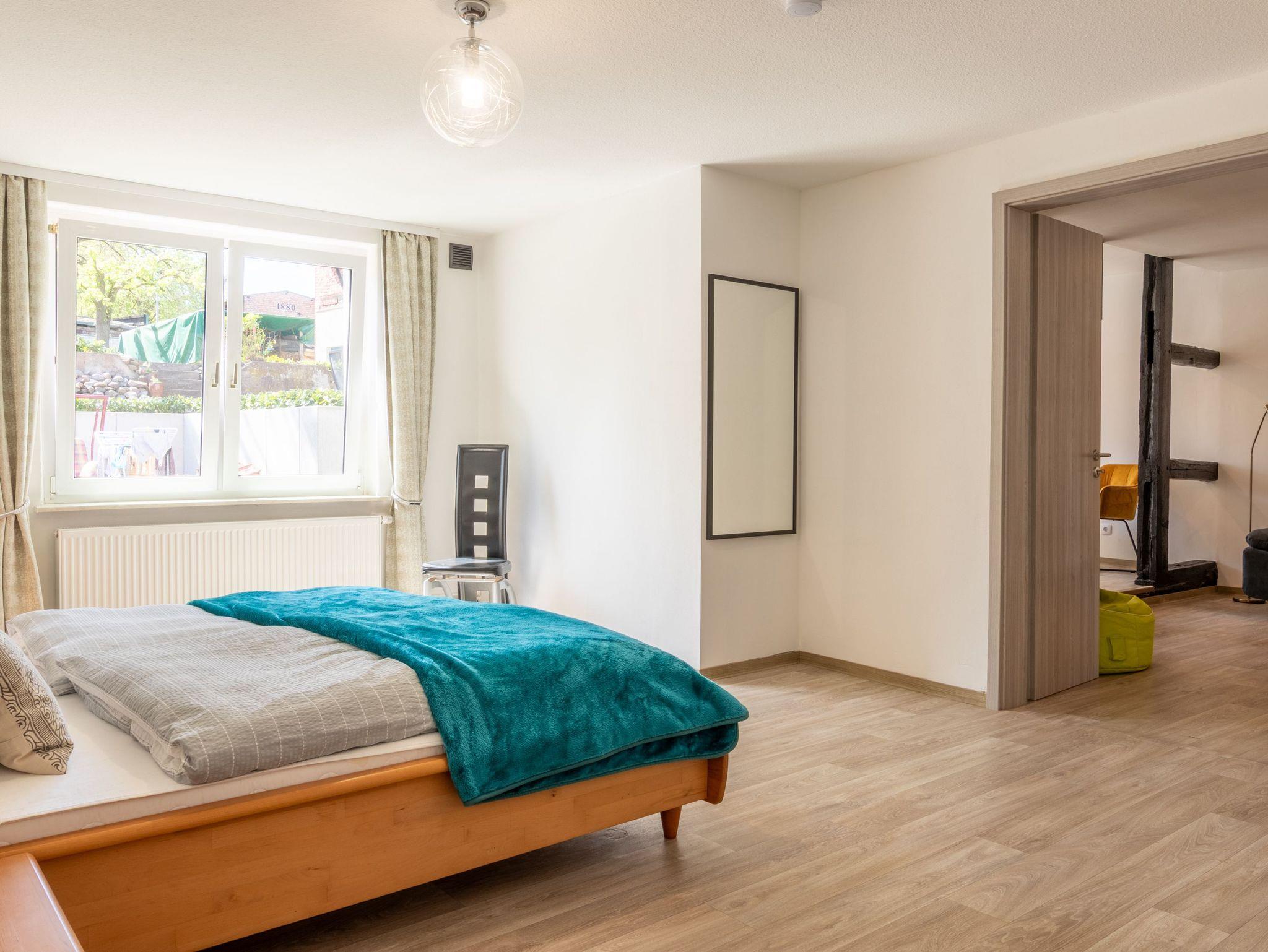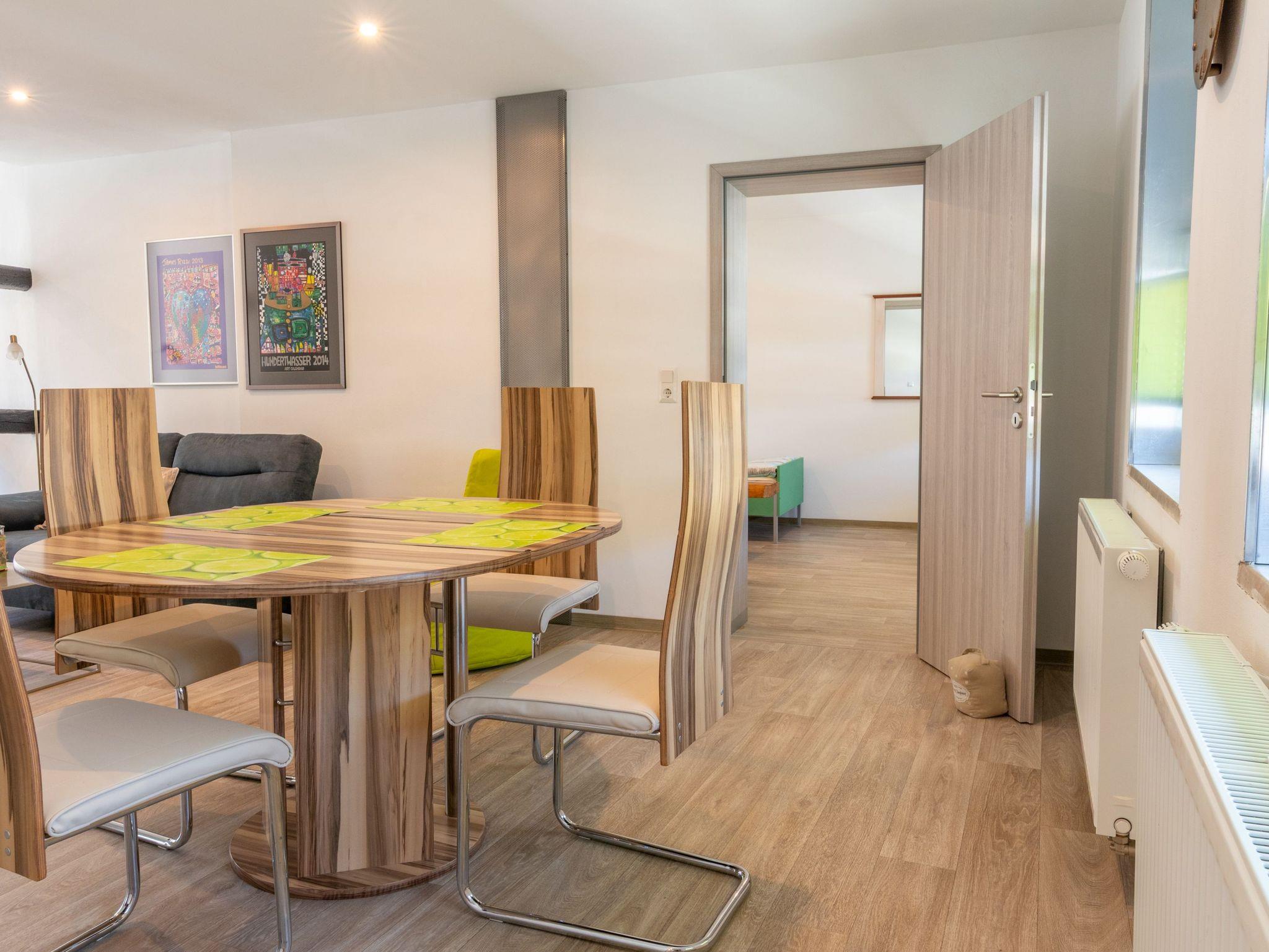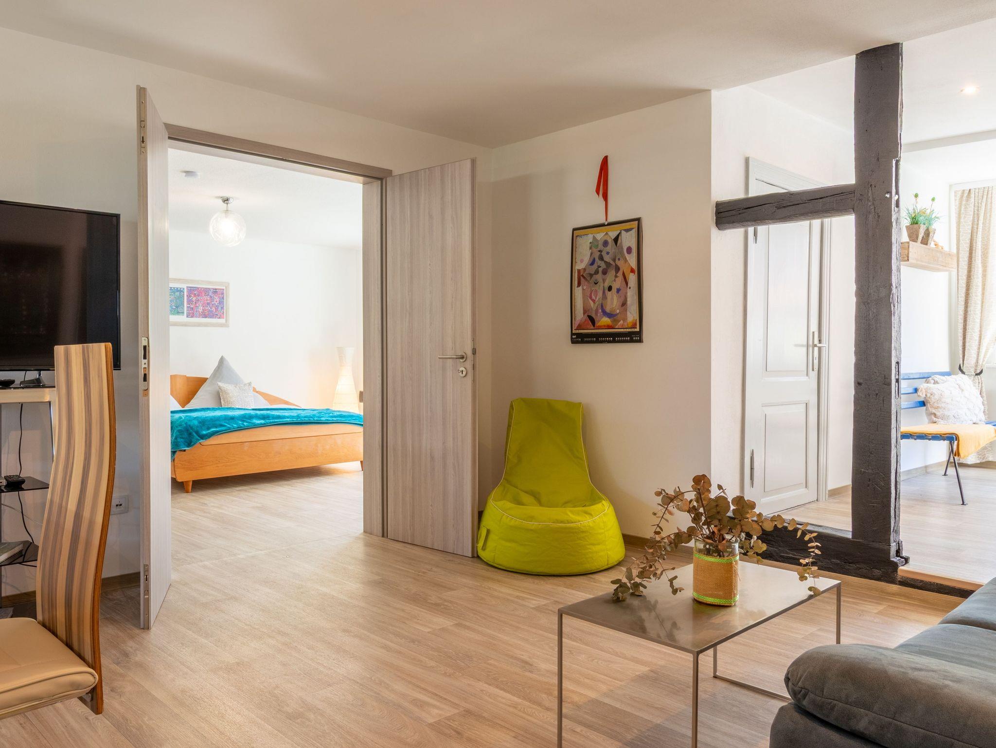 Die 100 m² große Ferienwohnung 2 befindet sich im Erdgeschoss und verfügt über einen separaten Eingang. Sie bietet Platz für bis zu 4 Personen und eignet sich ideal für einen entspannten Familienurlaub. Du betrittst die lichtdurchflutete Wohnung über das Wohnzimmer, das durch sichtbare Holzbalken in einen Ankleidebereich mit Garderobe und Sessel sowie einen gemütlichen Wohnbereich unterteilt ist. Im Wohnbereich erwarten dich ein bequemes Sofa, ein Esstisch und ein Flachbild-TV - der perfekte Ort zum Entspannen nach einem erlebnisreichen Tag. Die offene Küche ist voll ausgestattet und bietet alles, was du für die Selbstverpflegung brauchst. Mikrowelle, Kaffeemaschine, Toaster, Wasserkocher, Spülmaschine, Kühlschrank, Herd und ein Gefrierschrank stehen dir zur Verfügung. Die beiden Schlafzimmer bieten ausreichend Platz und Komfort. Eines ist mit einem Doppelbett (180x200) ausgestattet, das andere mit zwei Einzelbetten (90x200). Beide Zimmer verfügen über Kleiderhaken für deine persönlichen Dinge. Das moderne Badezimmer ist mit einer ebenerdigen Dusche, einem WC und unterfahrbaren Waschbecken ausgestattet und sorgt für einen angenehmen Start in den Tag. Direkt vor der Wohnung befinden sich Parkplätze sowie ein Sitzbereich mit Gartenmöbeln und Grill, die sich hervorragend für ein gemütliches Frühstück im Freien oder einen entspannten Abend eignen.