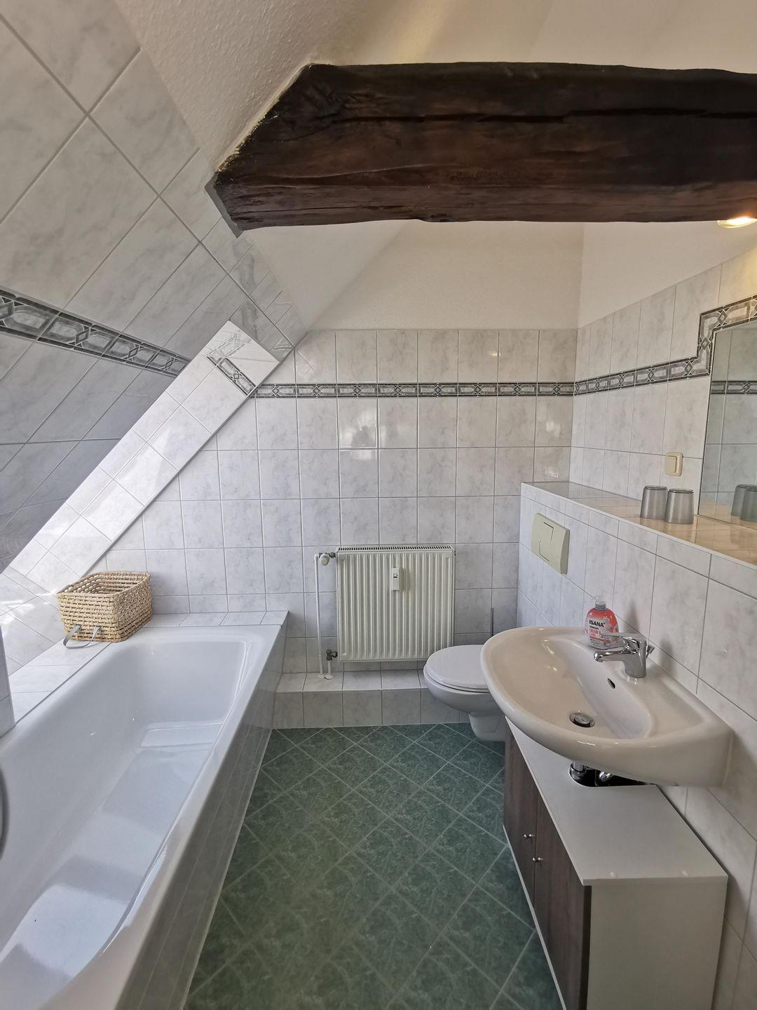Das Bad in der oberen Etage lädt zu einem gemütlichen und erholsamen Bad in der Badewanne ein.