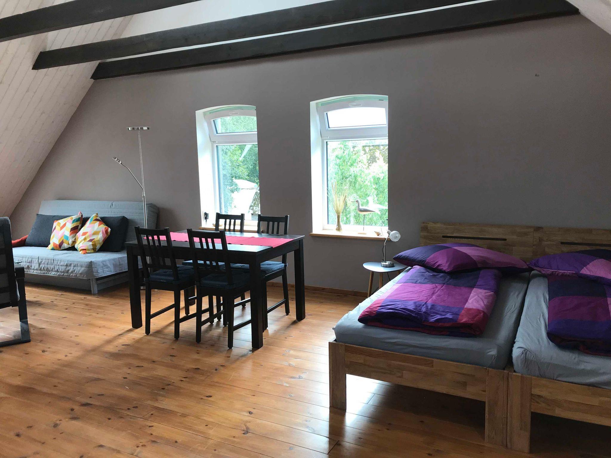 Unsere 2 liebevoll eingerichteten Maisonettes befinden sich im Dachgeschoss unseres Hauses und bieten Platz für 4 und 6 Personen. In der großzügigen Küche - Nutzung durch 2 Ferienwohnungen - könnt ihr euch selbst versorgen und auf Wunsch Kontakt zu anderen Gästen knüpfen.