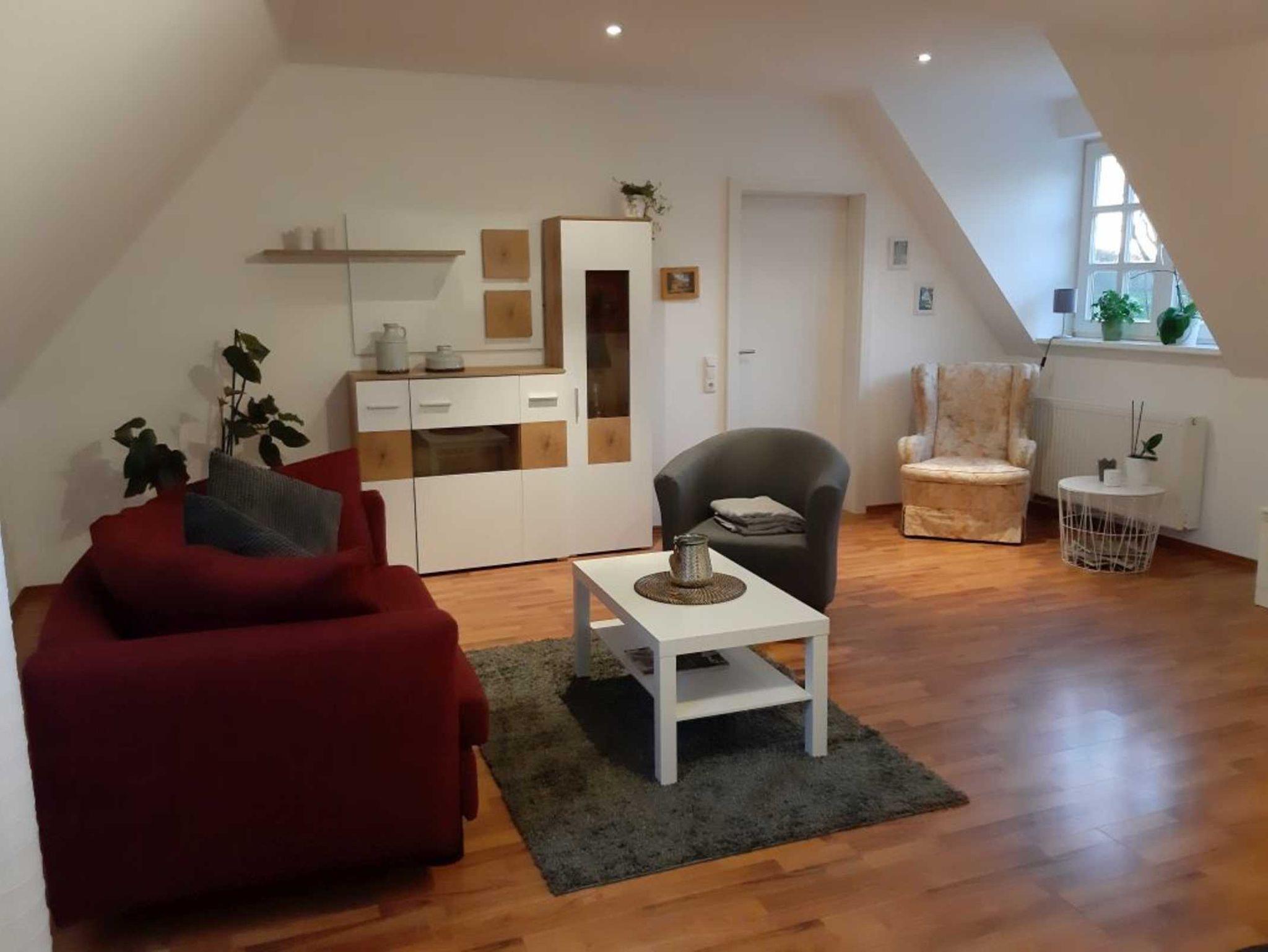Die in der ersten Etage des Scheunentraktes gelegene helle ca. 80 m² große Ferienwohnung ist nach dem neusten Standard eingerichtet und bietet Platz für bis zu 4 Personen. Neben einer großzügigen und gemütlichen Wohnküche finden Sie hier 2 Schlafzimmer ((Eltern/Kinder) zur Nutzung des Bades muss ein Schlafzimmer passiert werden)) sowie ein großes Badezimmer mit ebener Dusche und Badewanne. Von hier oben hat man einen sehr schönen Ausblick in den Garten und auf die Hammewiesen.