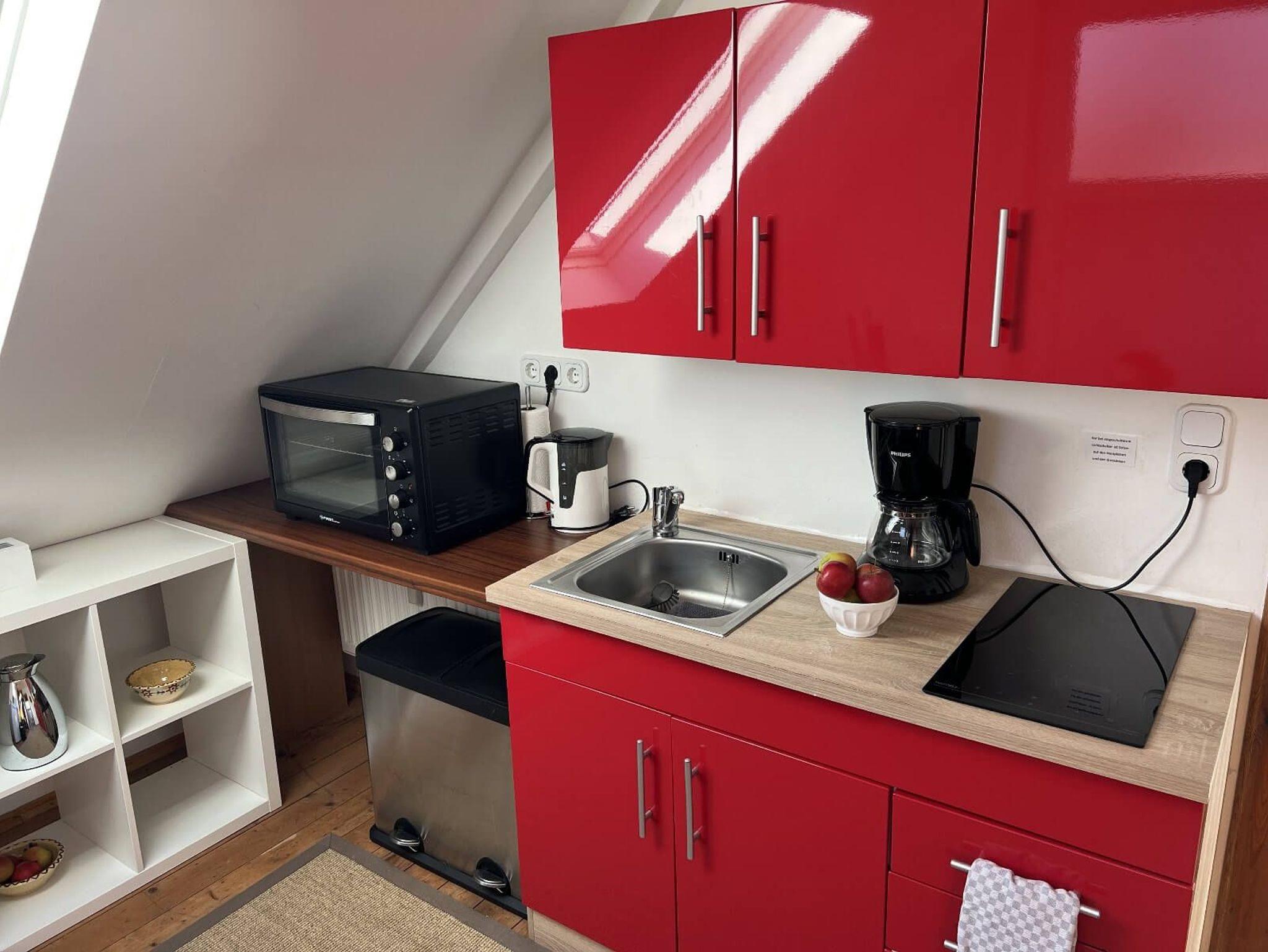 Ganz oben unterm Dach mit gemütlichen 36 m2 Wohnfläche, neuer kleiner Küche und eleganter Dusche mit vielen Schrägen, viel Holz und viel Licht von Deckenfenstern und Fenstern rund um, bietet das ehemalige Maleratelier von Willi Ohler, Ende 2016 frisch renoviert und stilvoll gestaltet, einen fantastischen Blick vom Weyerberg auf Bremen und das Bremer Umland. Hohe Decken, freigelegte Eichenbalken und schräge Wände geben immer noch künstlerische Inspirationen. Gedacht für zwei Gäste (max.3), die wirklich stimmungsvoll hier verweilen wollen. Die neue schöne und schwungvoll gestaltete Wendeltreppe zum Eingang des Ateliers führt hoch hinaus, für Gäste mit Bewegungseinschränkungen eher nicht empfohlen.