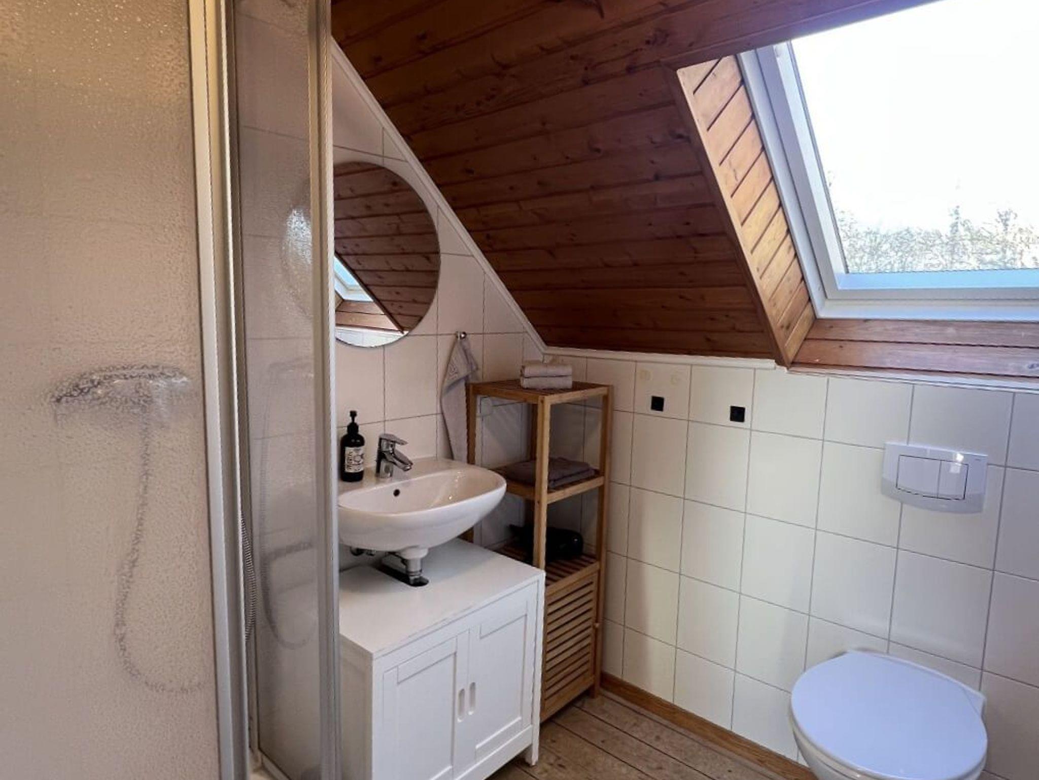 Ganz oben unter’m Dach mit gemütlichen 36 m2 Wohnfläche, neuer kleiner Küche und eleganter Dusche mit vielen Schrägen, viel Holz und viel Licht von Deckenfenstern und Fenstern rund um, bietet das ehemalige Maleratelier von Willi Ohler, Ende 2016 frisch renoviert und stilvoll gestaltet, einen fantastischen Blick vom Weyerberg auf Bremen und das Bremer Umland. Hohe Decken, freigelegte Eichenbalken und schräge Wände geben immer noch künstlerische Inspirationen. Gedacht für zwei Gäste (max.3), die wirklich stimmungsvoll hier verweilen wollen. Die neue schöne und schwungvoll gestaltete Wendeltreppe zum Eingang des Ateliers führt hoch hinaus, für Gäste mit Bewegungseinschränkungen eher nicht empfohlen.