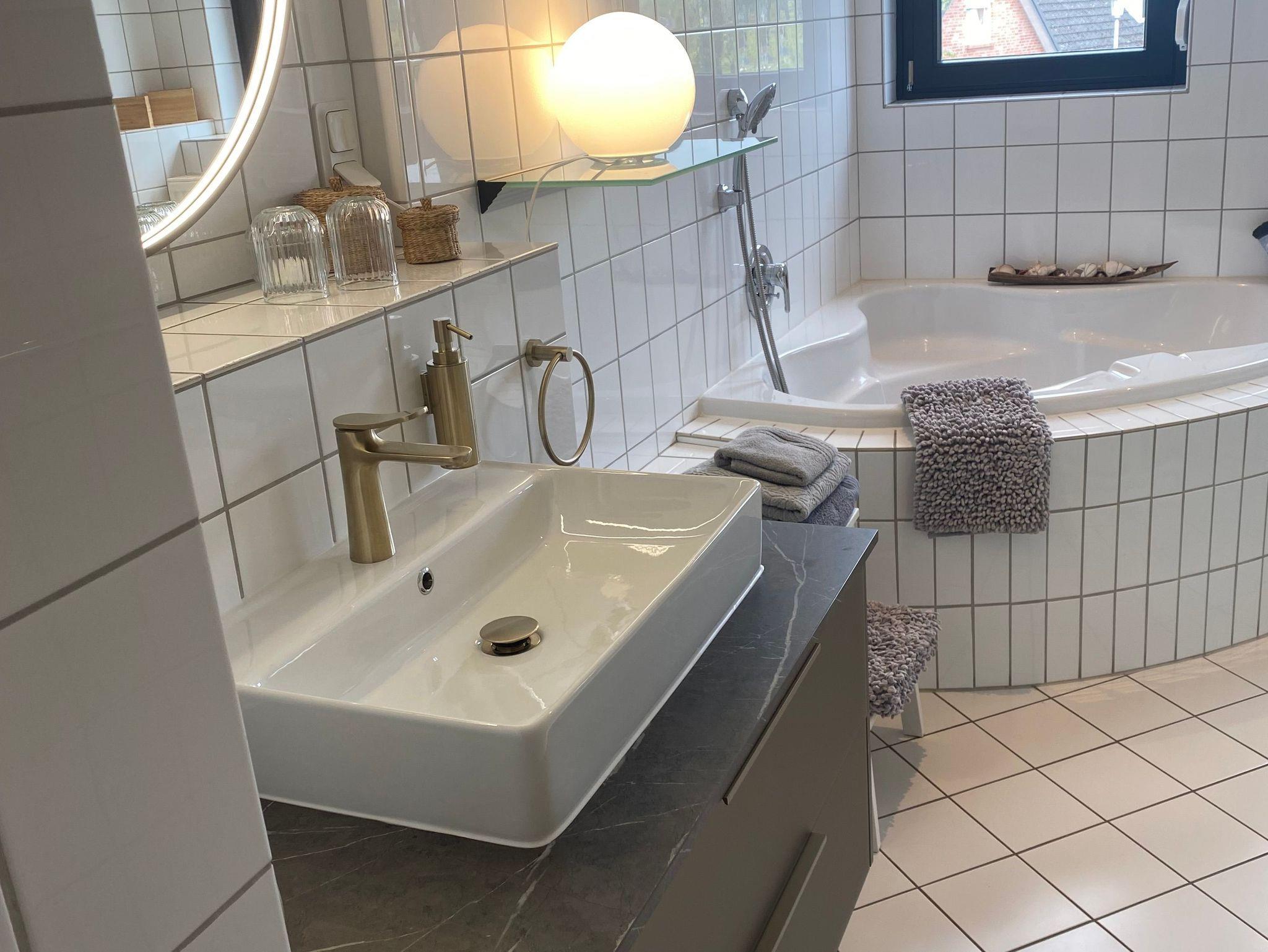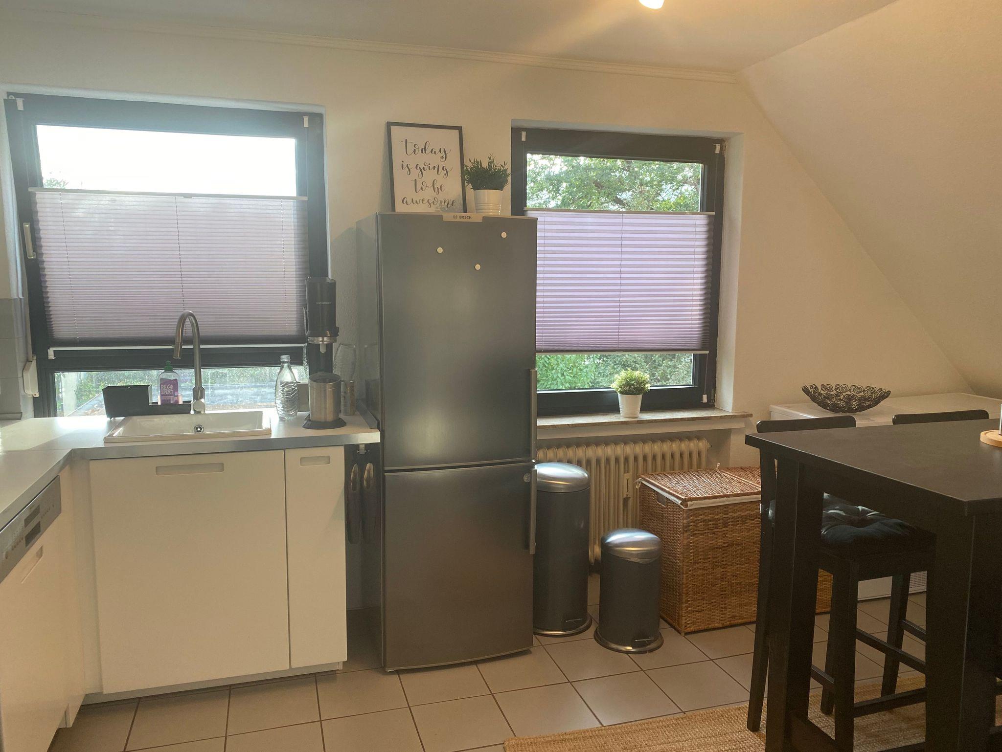 Die Wohnung befindet sich im Obergeschoss, ist sehr hell und hat eine separate Küche und Badezimmer mit Dusche und Badewanne. Ein großer Kühlschrank mit Eisfach steht bereit und sorgt für kühle Getränke. Die Küche ist ausgestattet mit einer Spülmaschine, Backofen, Ceranfeld, Wasserkocher, Toaster und einem Sodamax.
