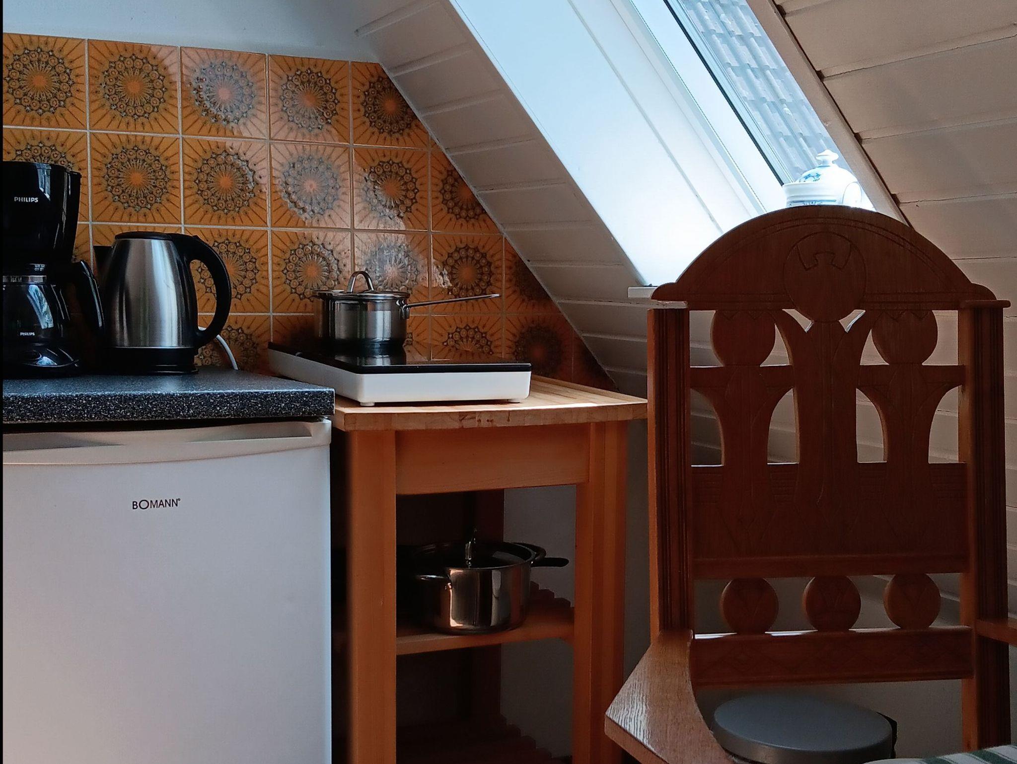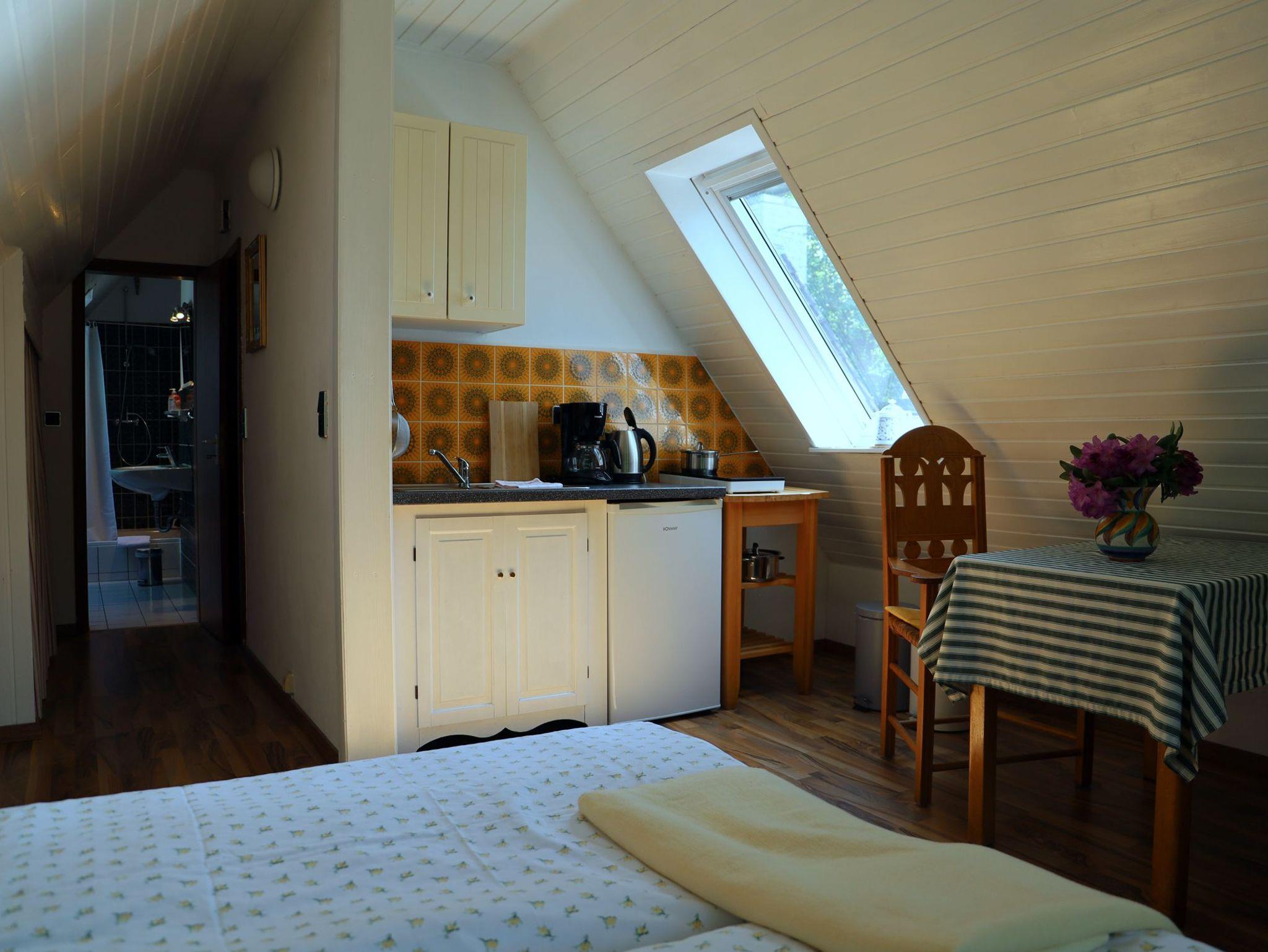 Der 22 qm große Wohn-Schlafraum mit kleiner Küchenzeile und separatem Duschbad/WC, Ausrichtung Süd-Westen, liegt im Dachgeschoss des Hauses. Das Appartement ist mit einem Smart-TV ausgestattet. Geeignet für ein bis zwei Personen, für die es ein komfortables Schlafsofa (1,40 m breit) gibt.