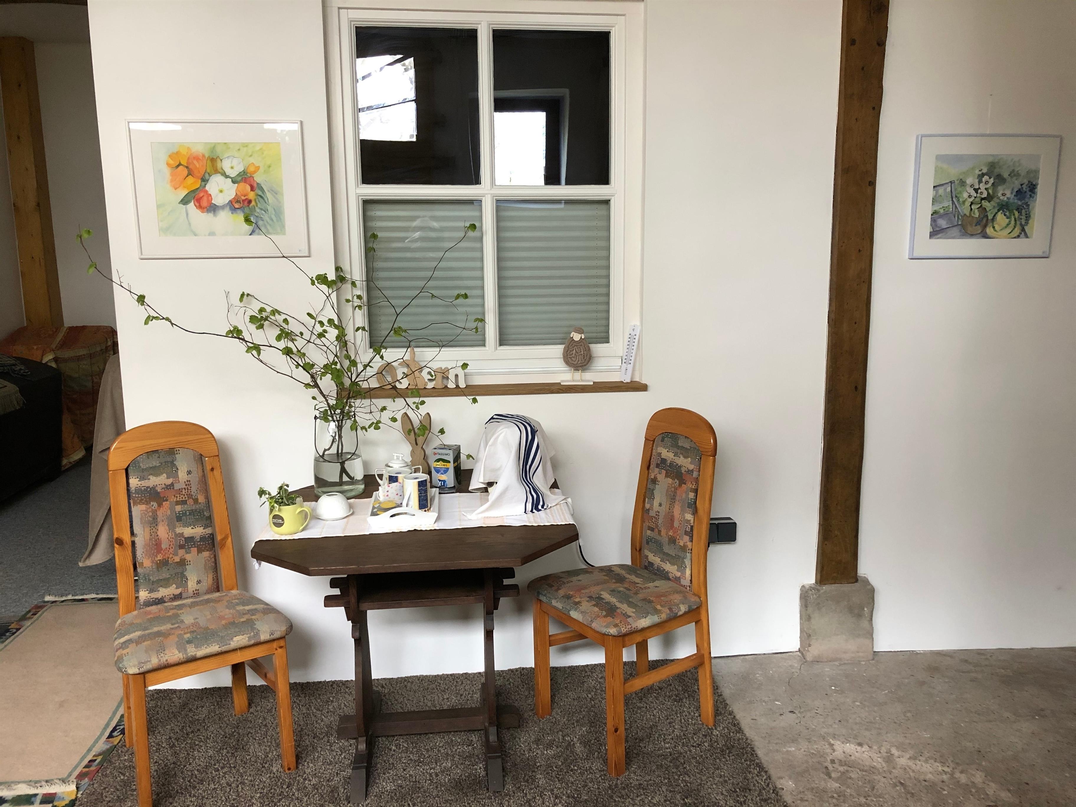 Die Vordiele darf gerne mit genutzt werden. Von dort aus zugänglich gibt es eine Gemeinschaftsküche, die man sich mit Gästen aus dem Tinyhouse-Bauwagen teilt. Dort steht ein Kühlschrank, Mikrowelle, eine Kochplatte und Spüle.