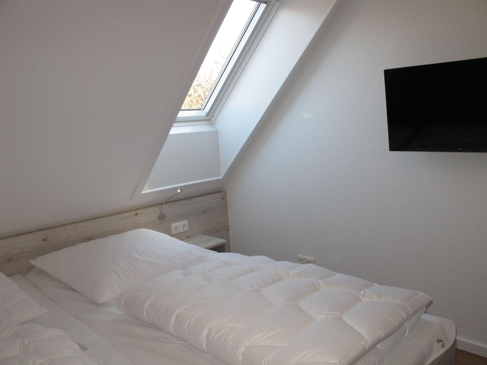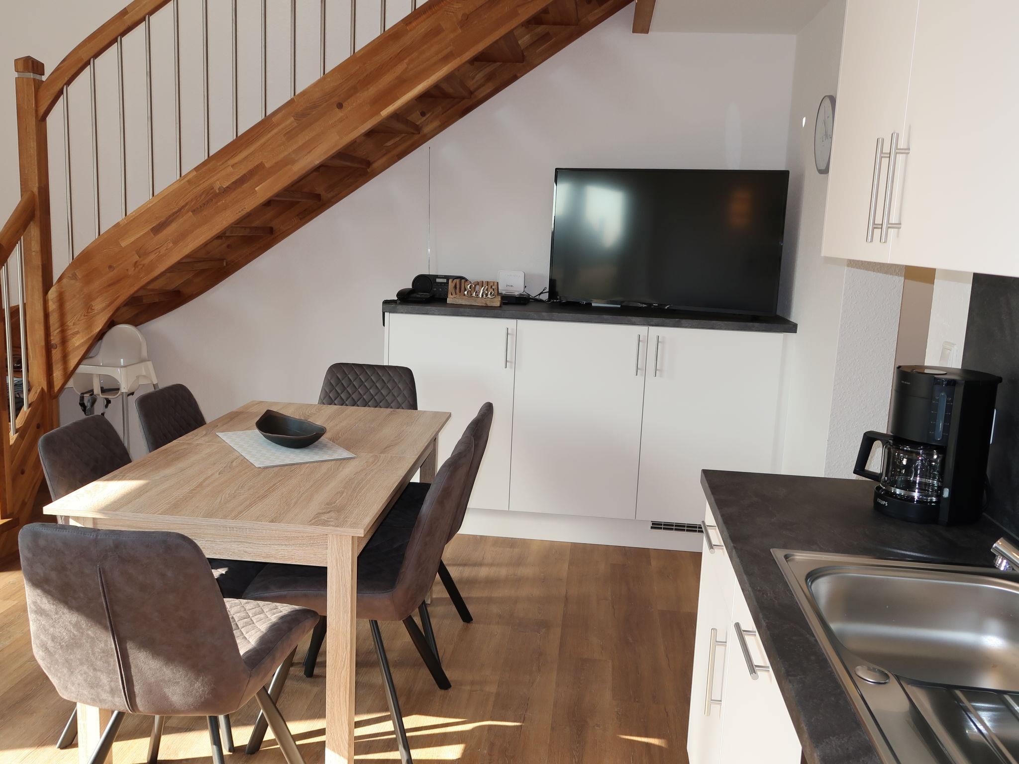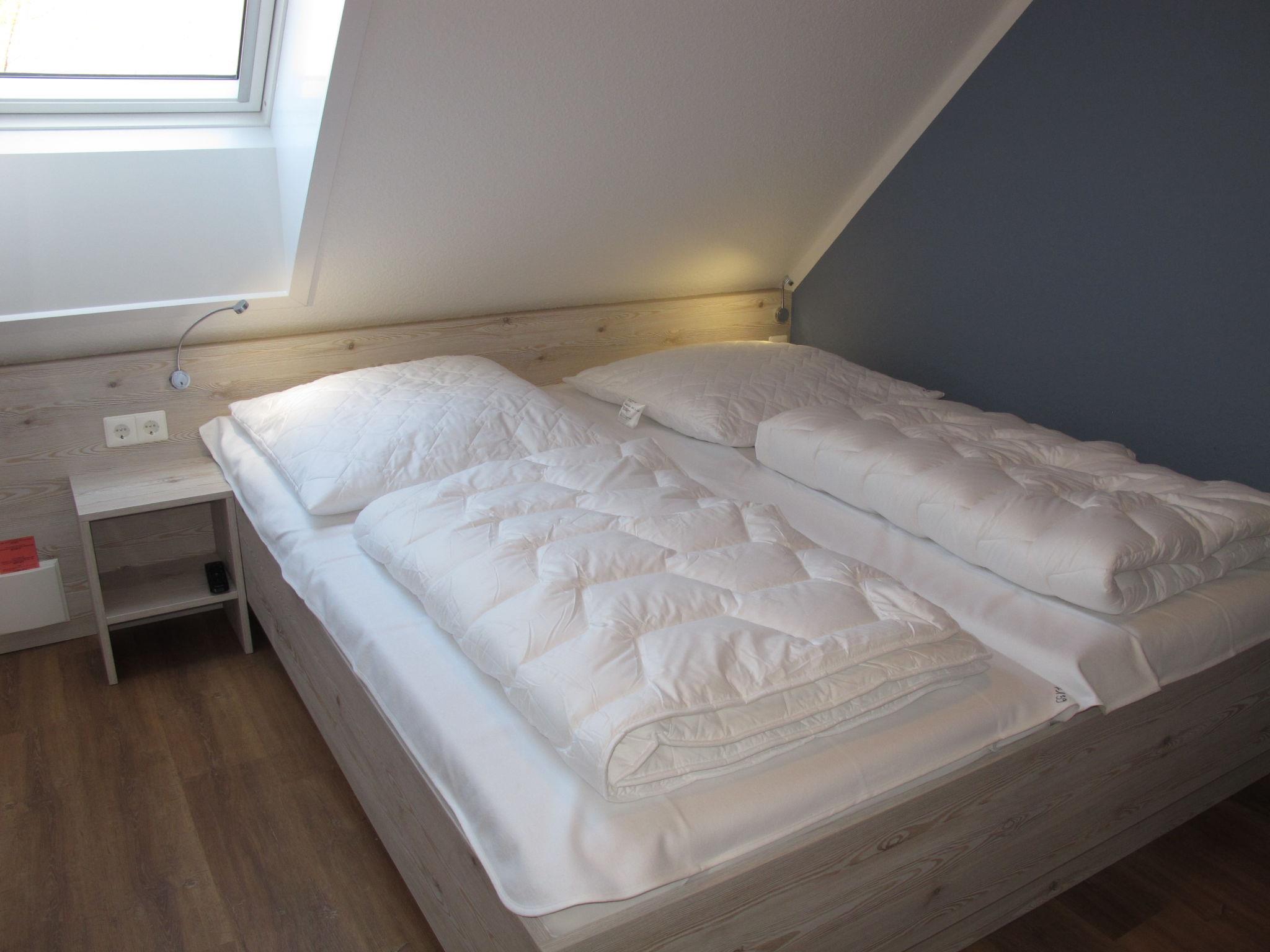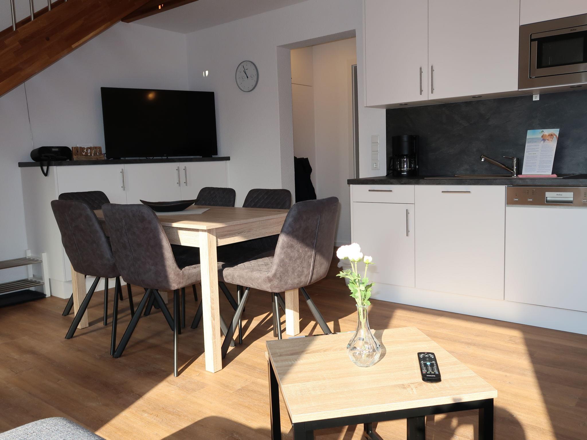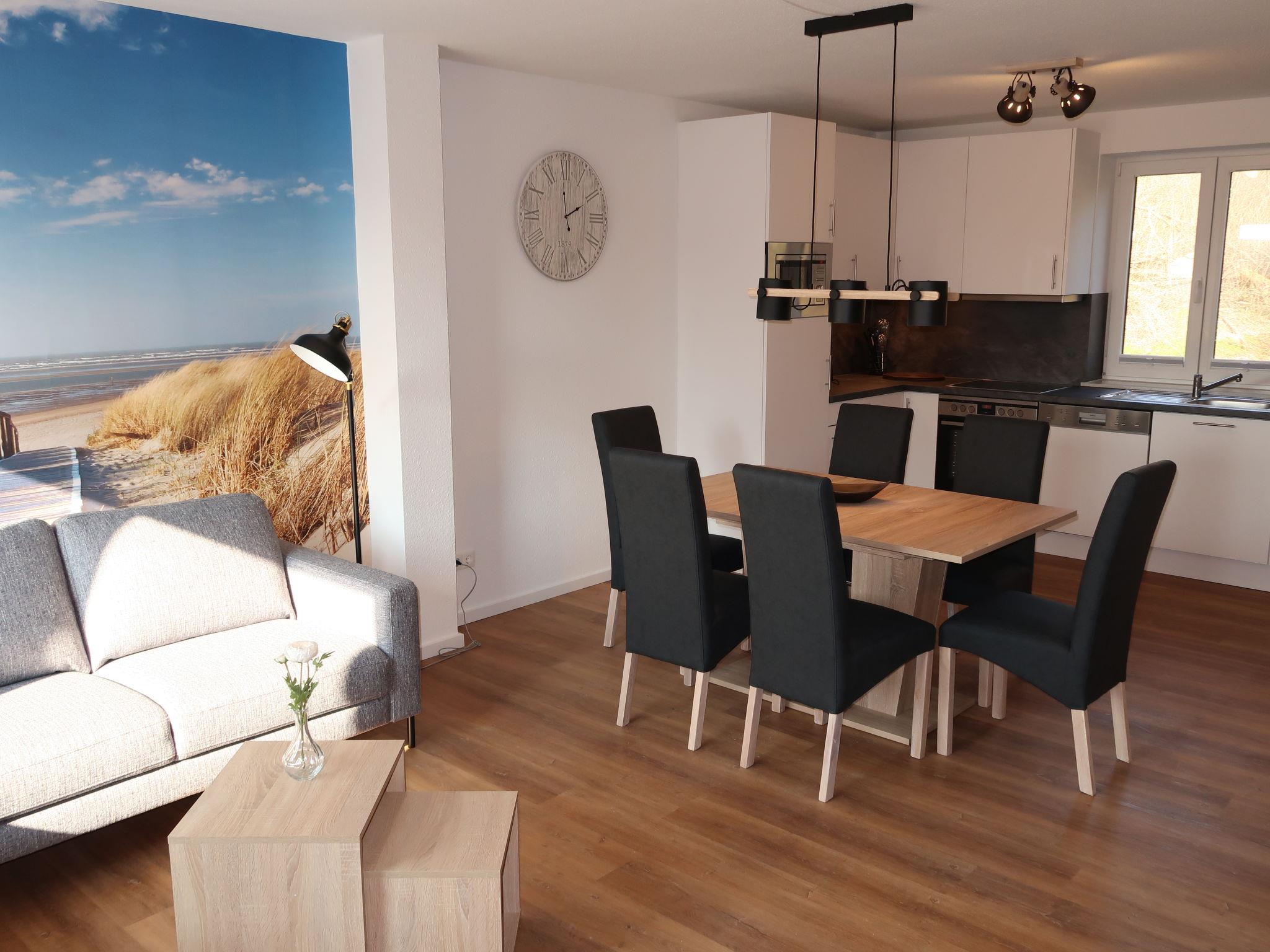 4-room terraced house 64 m2 on 2 levels. Modern and tasteful furnishings: living/dining room with dining table, satellite TV and flat screen. Open kitchen (oven, dishwasher, 4 ceramic glass hob hotplates, toaster, kettle, microwave, electric coffee machine). Bath/shower, sep. WC. Heating. Upper floor: 2 rooms, each room with 1 double bed, satellite TV and flat screen. 1 room with 2 beds. Facilities: children's high chair, baby cot. Internet (WiFi, free). Please note: maximum 1 pet/ dog allowed. Smoke alarm, fire extinguisher. The property is one of a type of property or apartment. Some of the terraced houses have a gallery and one of the bedrooms is on the ground floor. There is also the possibility of a children's room with 2 bunk beds on the upper floor.