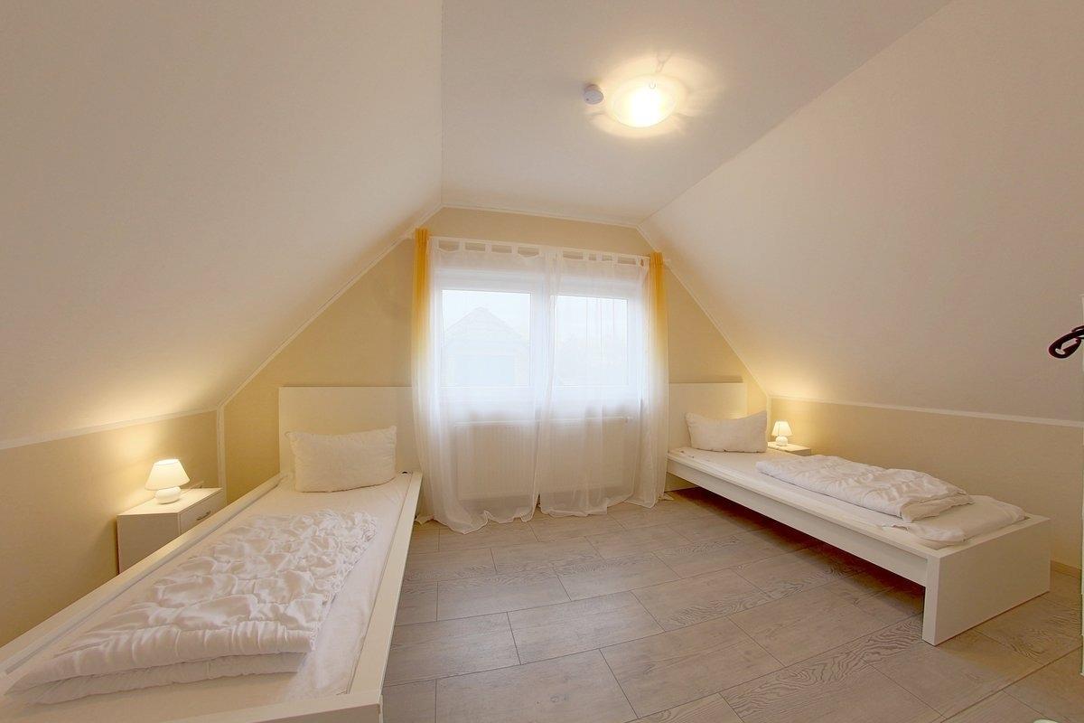 Im Obergeschoss befinden sich zwei geräumige Schlafzimmer und ein WC mit Waschbecken. Ein Schlafzimmer mit Doppelbett und Babyreisebett für ein Kleinkind und ein weiteres Schlafzimmer mit 2 Einzelbetten