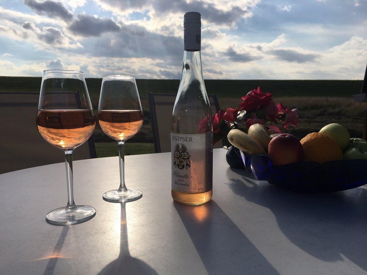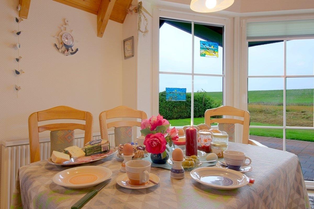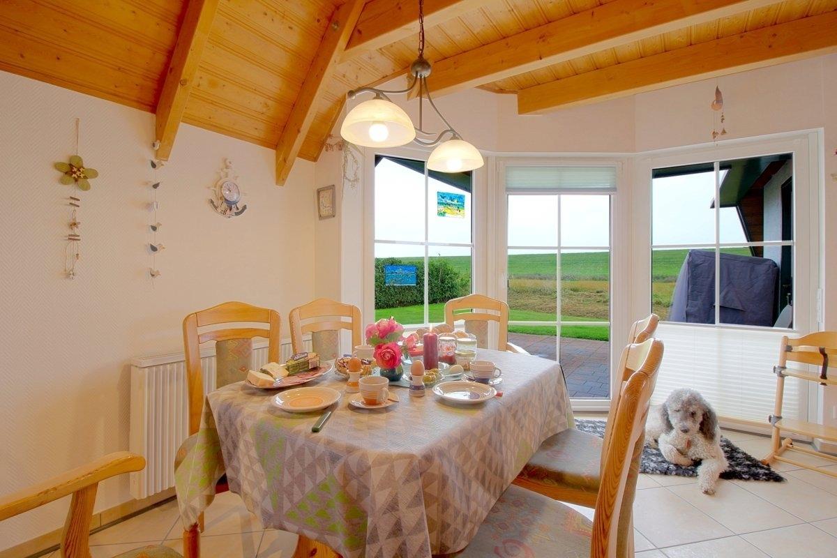 Auf der sonnigen Terrasse mit Gartenmöbeln und eigenem Strandkorb haben Sie einen sensationellen Blick direkt auf den Deich