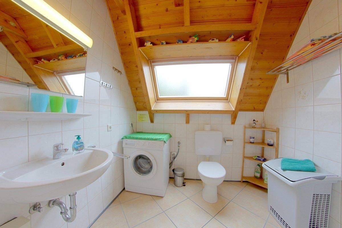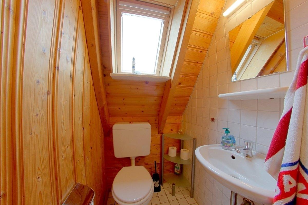 Im Obergeschoss sind zwei Schlafzimmer, eins mit Doppelbett und TV und eins mit 2 Einzelbetten, sowie eine Toilette mit Waschbecken. Beide Schlafzimmer mit Vinyl-Designbelag.