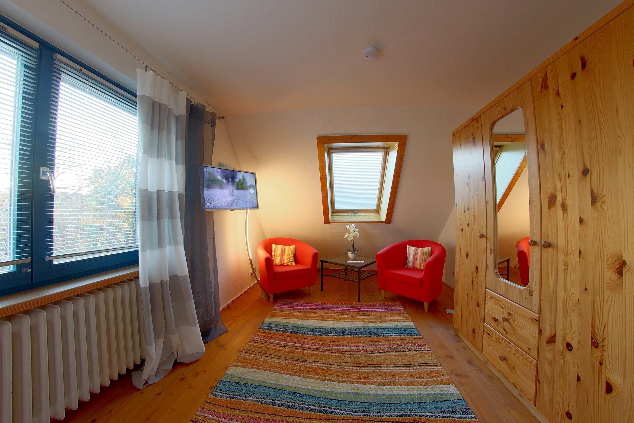 Ein gemütliches Wohnzimmer mit Holzdielenboden, Schlafsofa und TV, ein geräumiges Schlafzimmer mit Boxspringbett ( 1,80x2,00 ), TV und 2 Sesseln, eine komplett eingerichtete Einbauküche mit Geschirrspüler und Essbereich, und ein Vollbad mit Fenster stehen Ihnen zur Verfügung.
