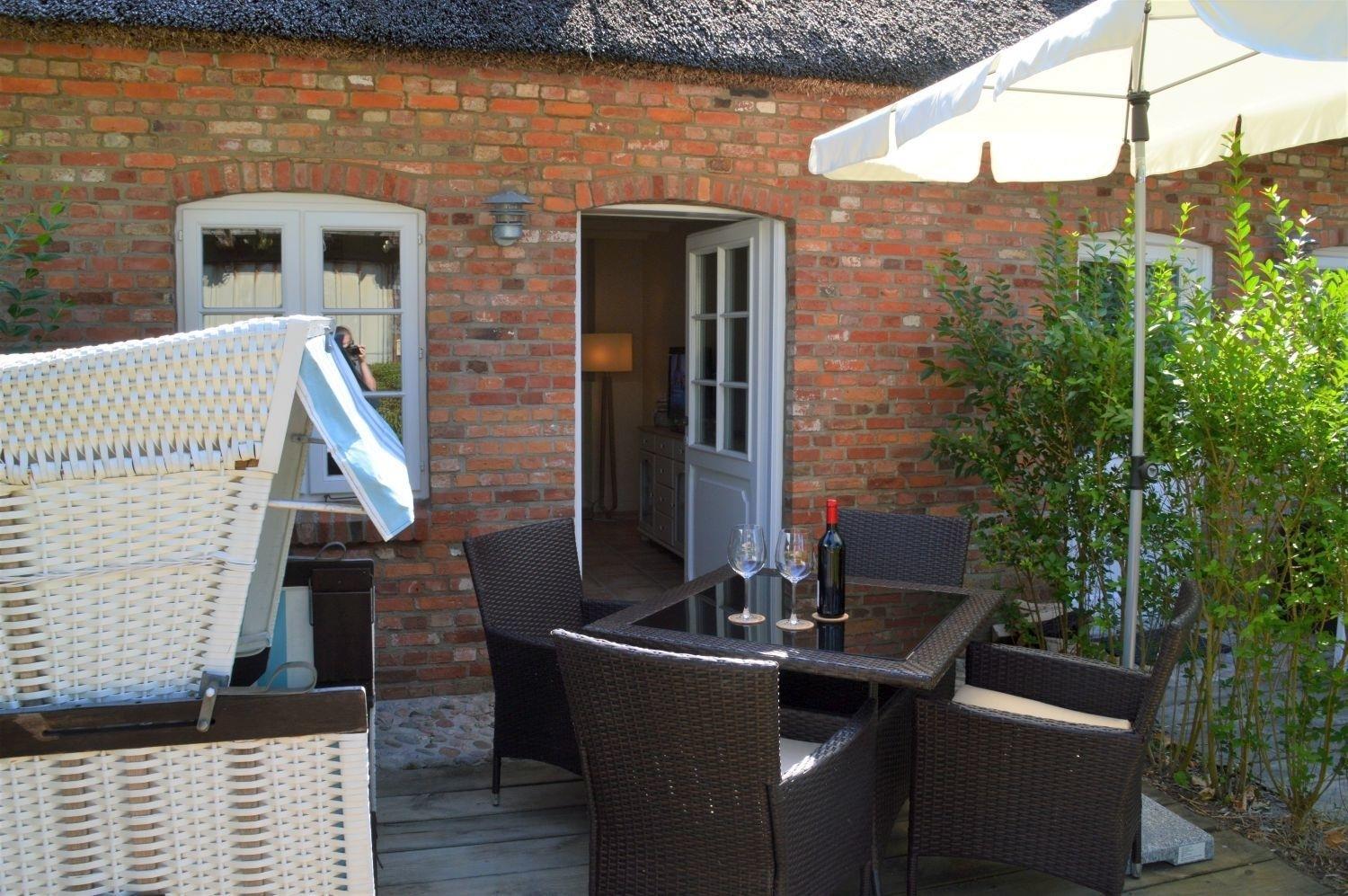 Die Terrasse ist mit Gartenmöbel und Strandkorb ausgestattet.