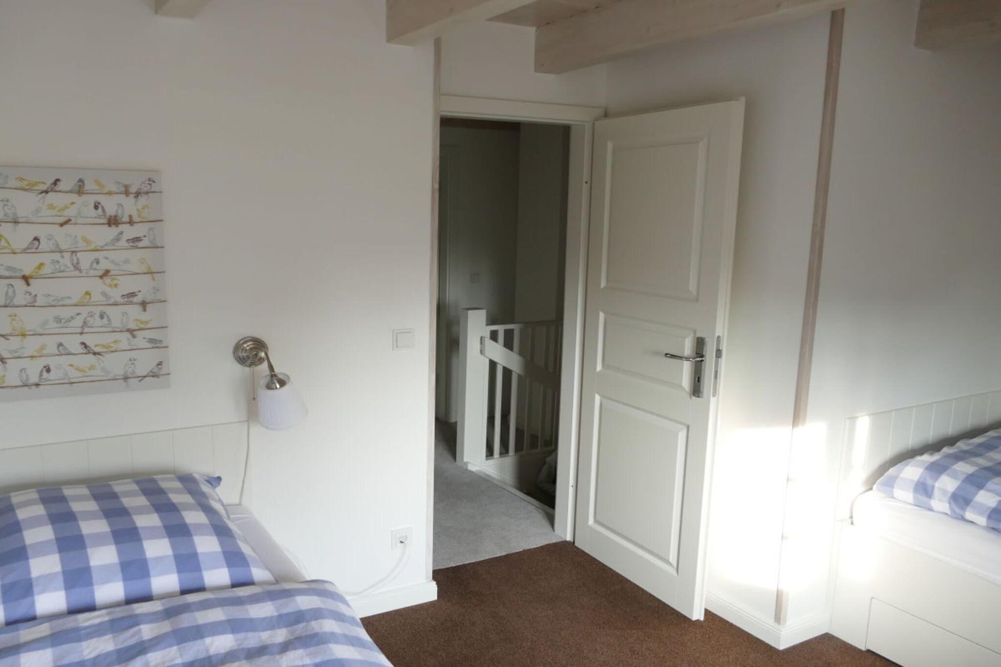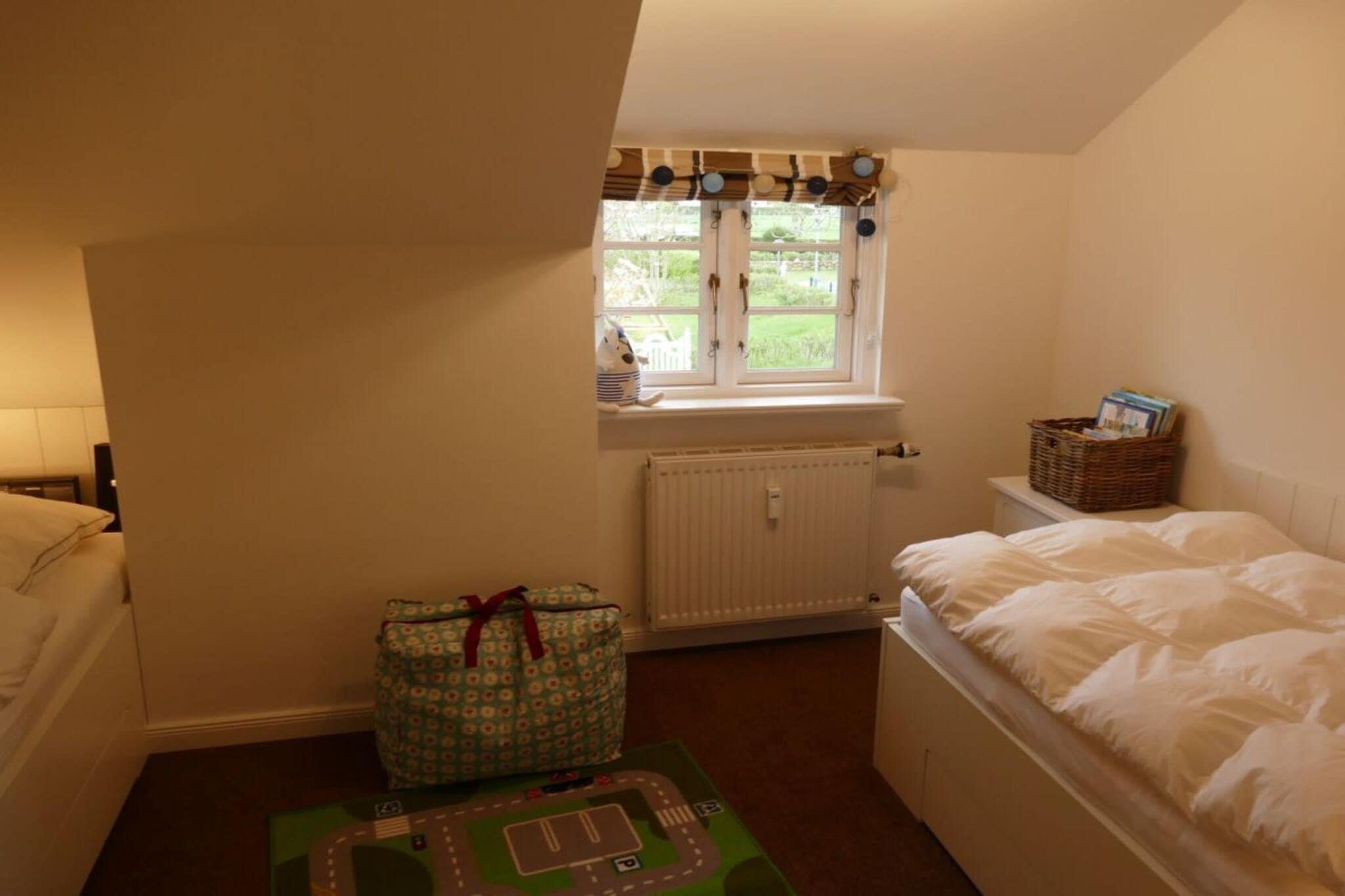 Friesische Ferien für bis zu 4 Personen. Entspannte Urlaubsmöglichkeit für die ganze Familie! Die Ferienwohnung ist in einem historischen Friesenhof gelegen und erstreckt sich über zwei Ebenen. Zusätzlich gehört zur Wohnung eine eigene Sonnenterrasse mit Strandkorb, die direkt vom Wohnzimmer aus zu begehen ist. Im Erdgeschoss befindet sich das gemütliche Wohnzimmer mit stimmungsvoller Holzbalkendecke und Kaminofen. An den Wohnbereich angrenzend liegt die modern und voll ausgestattete Küche. Weiterhin befindet sich im Erdgeschoss ein separates WC. Im Obergeschoss befinden sich zwei gemütliche Schlafzimmer mit einem Doppelbett und zwei Einzelbetten sowie ein weiteres Bad mit Dusche.