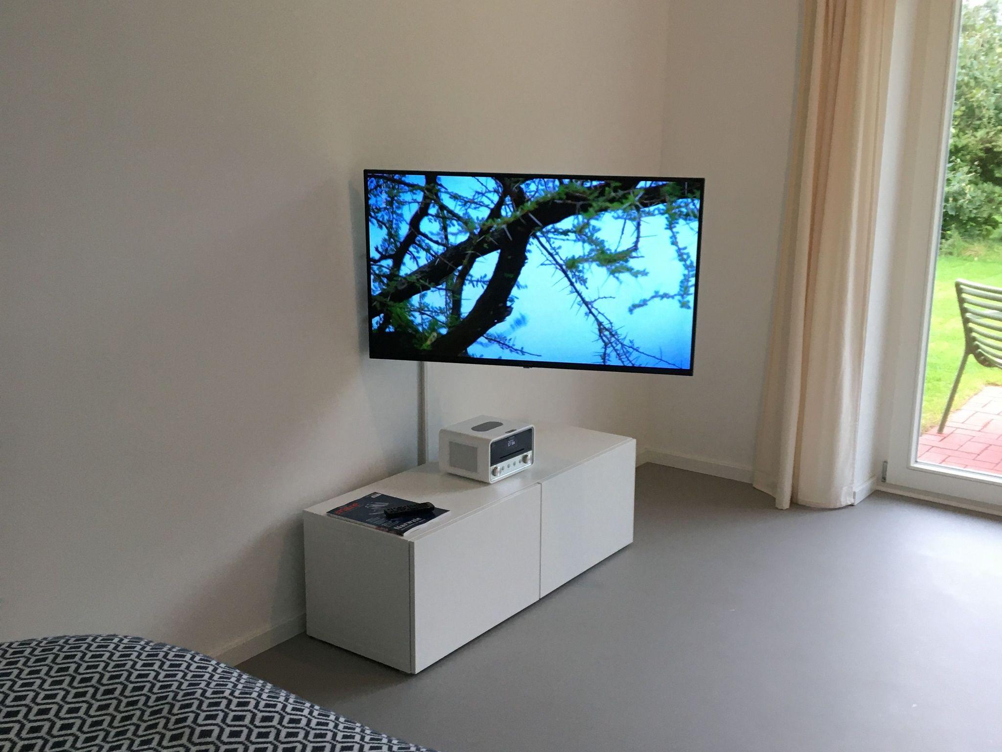 Für Unterhaltung sorgt ein Panasonic 43 Zoll Ultra HD TV, das mit einem Schwenkarm an der Wand montiert ist und so chilliges Fernsehen auch vom Bett aus ermöglicht. Ein Sound Wunder ist das DAB/Internetradio mit Bluetooth Streaming und Spotify Connect zum Abspielen von Playlists vom eigenen Smartphone. Das läßt sich durch einfaches Rauflegen auf das Radio kabellos wieder aufladen. Weitere Steckdosen mit Smartphone bzw USB Anschlüssen befinden sich im Raum.
