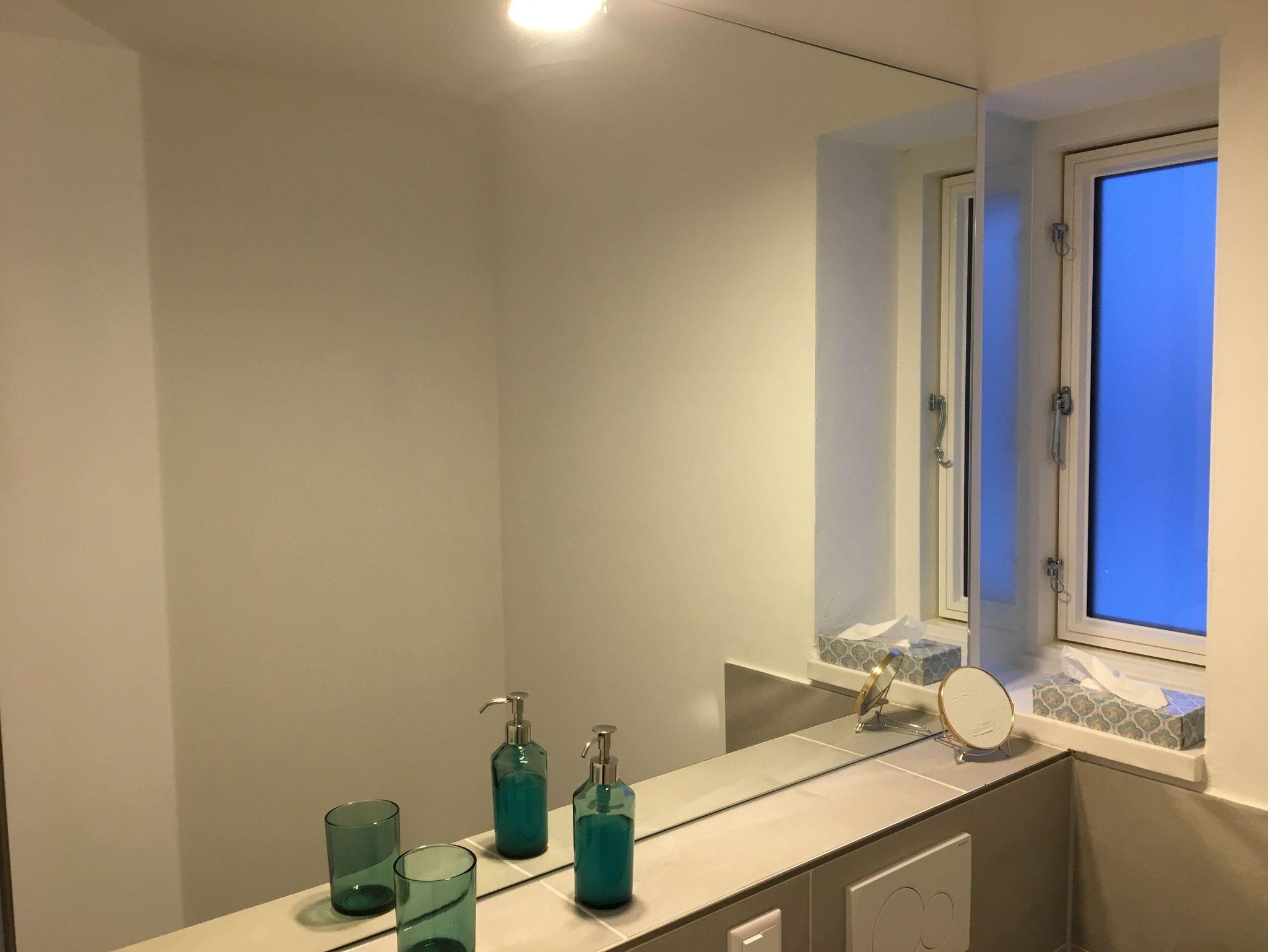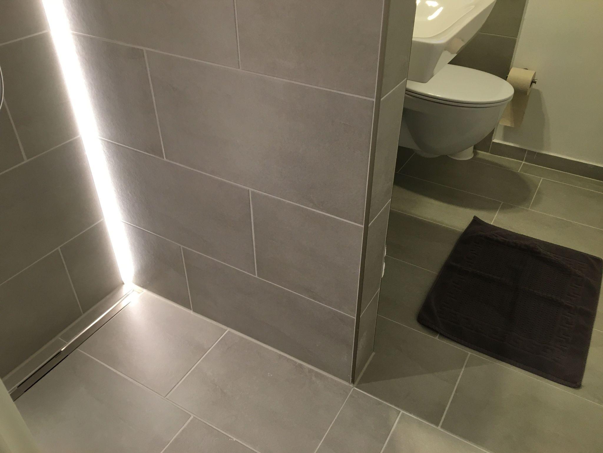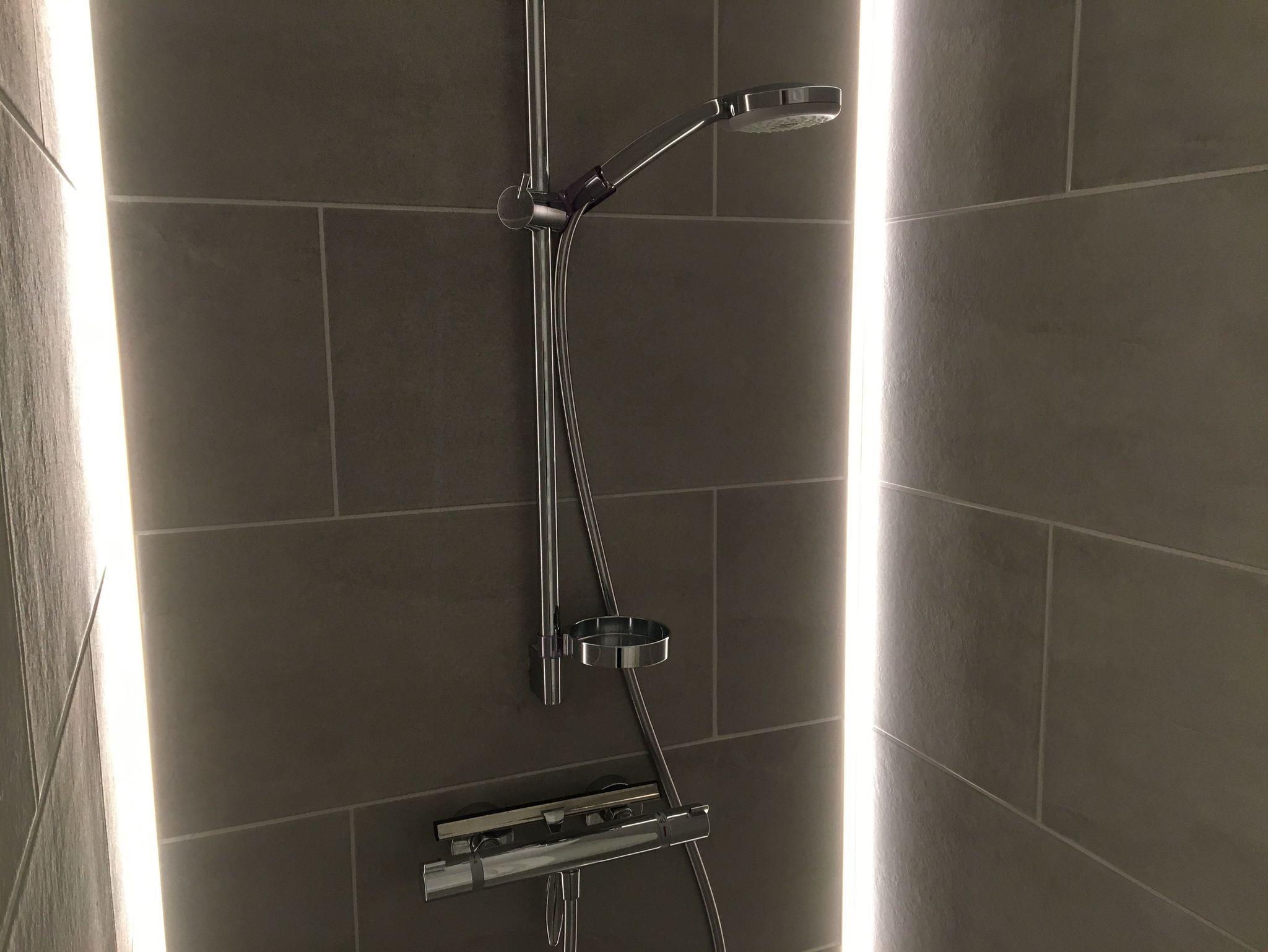 Zum Apartment gehört ein Badezimmer mit bodenebener Dusche. Für Licht sorgen im Duschbereich senkrechte Led - Lichtbänder. Ein elektrisch betriebener Badheizkörper trocknet bei Bedarf die Handtücher. Ein Waschtisch, ein WC, ein großer Spiegel, sowie ein Fenster für die Zufuhr frischer Luft runden das Bild ab.