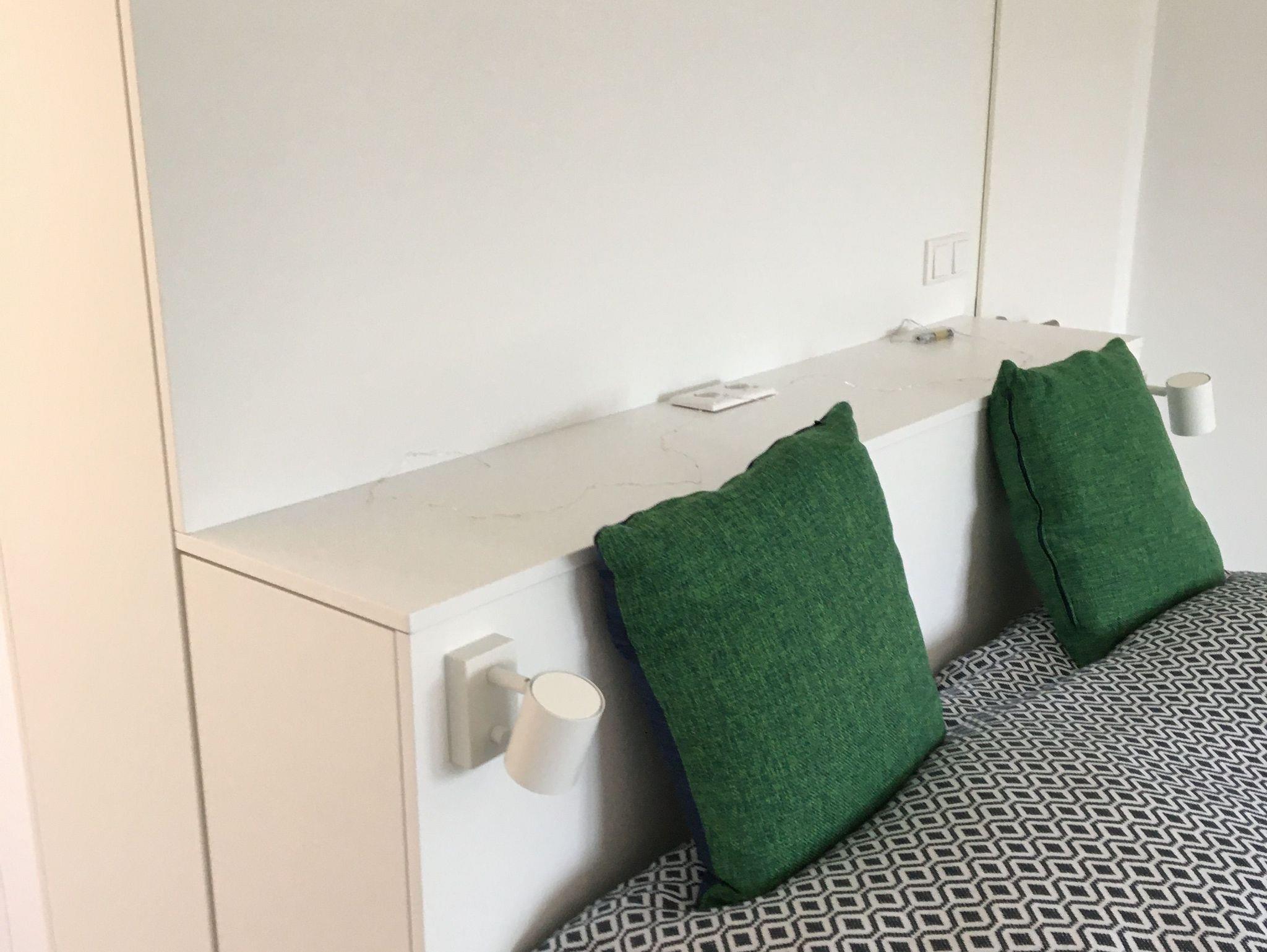 Der Wohnbereich des Apartments ist mit maßangefertigten Einbauschränken und einem Queensize Doppelbett (Breite 1,60 m) vom Tischler ausgestattet. Das Queensize Bett hat zwei Lattenroste mit jeweils verstellbaren Kopf.-und Fußteil, sowie zwei hochwertigen Matratzen von Schlaraffia. Zum Wohnbereich gehören außerdem zwei bequeme Couchsessel, nebst Couchtisch, sowie eine Kommode, die weiteren Stauraum bietet.