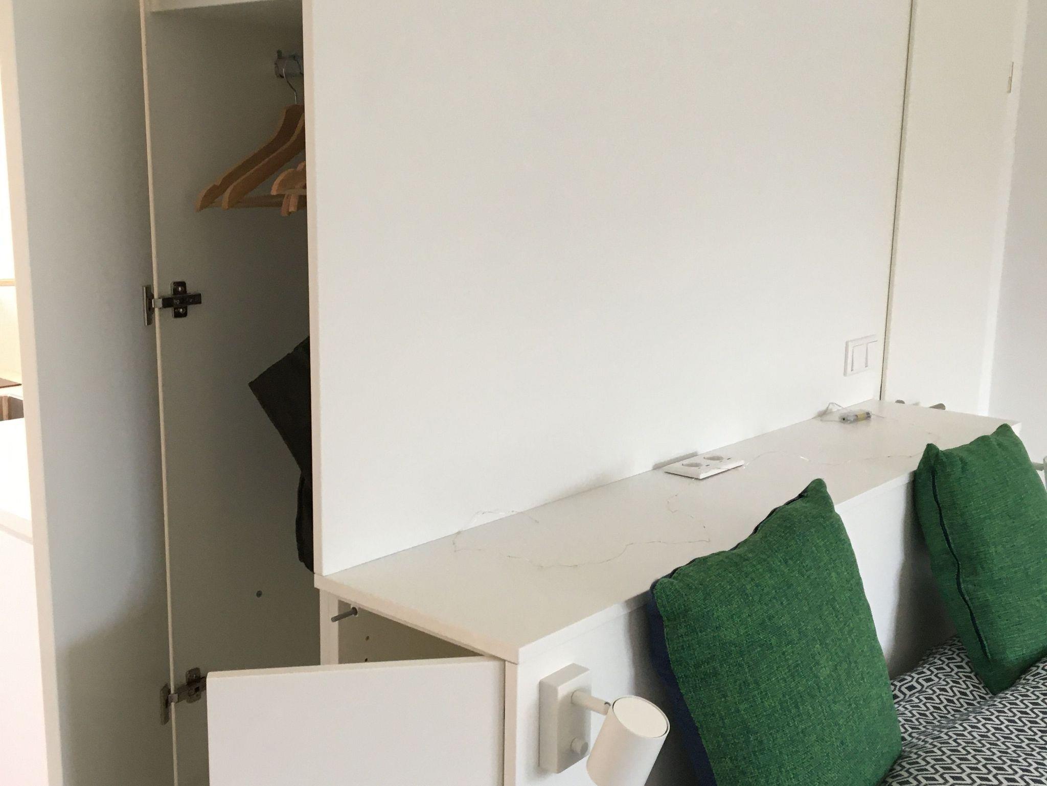 Der Wohnbereich des Apartments ist mit maßangefertigten Einbauschränken und einem Queensize Doppelbett (Breite 1,60 m) vom Tischler ausgestattet. Das Queensize Bett hat zwei Lattenroste mit jeweils verstellbaren Kopf.-und Fußteil, sowie zwei hochwertigen Matratzen von Schlaraffia. Zum Wohnbereich gehören außerdem zwei bequeme Couchsessel, nebst Couchtisch, sowie eine Kommode, die weiteren Stauraum bietet.