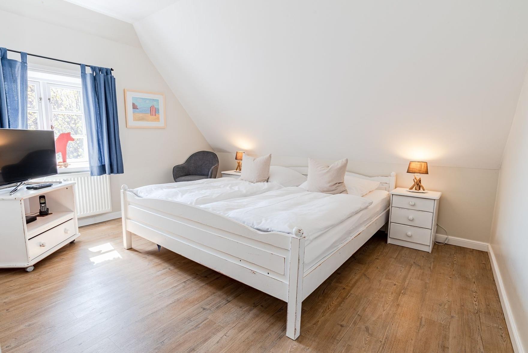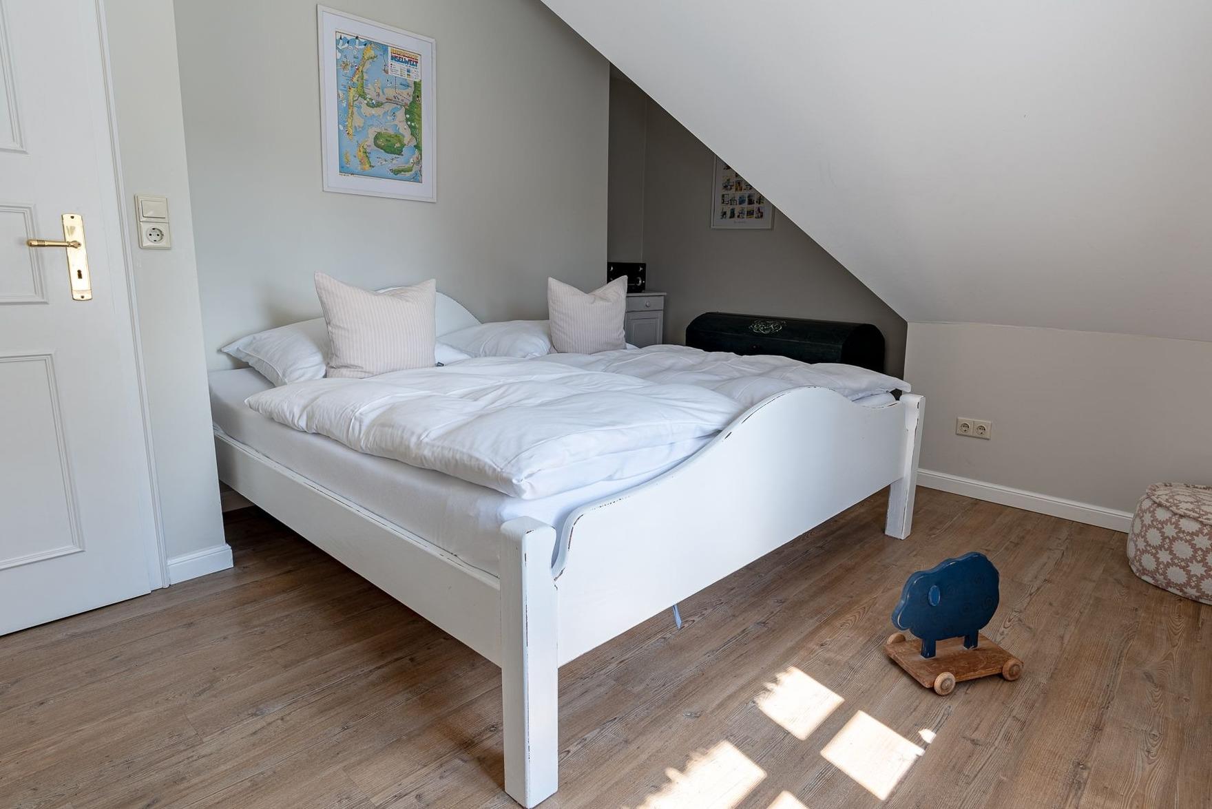 Im frisch renoviertem ersten Stockwerk befinden sich die beiden Schlafzimmer. Im Elternschlafzimmer steht ein Doppelbett und hier gibt es die Möglichkeit ein Reisebett für Kleinkinder aufzustellen. Im Kinderzimmer gibt es ebenfalls ein Doppelbett.