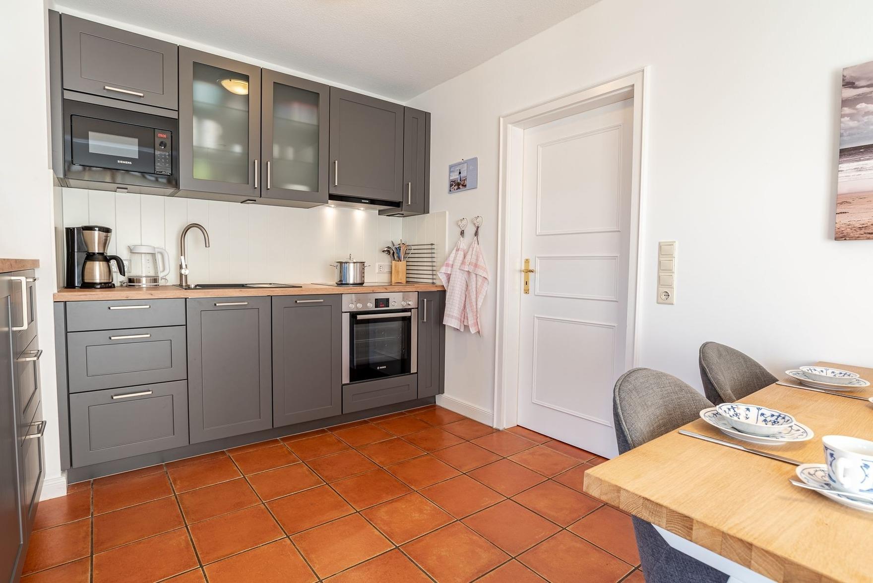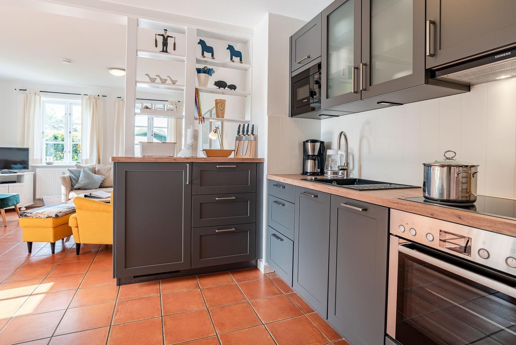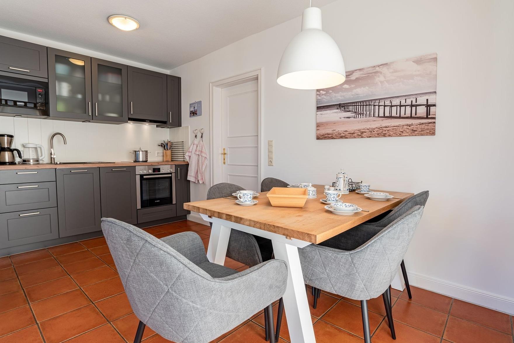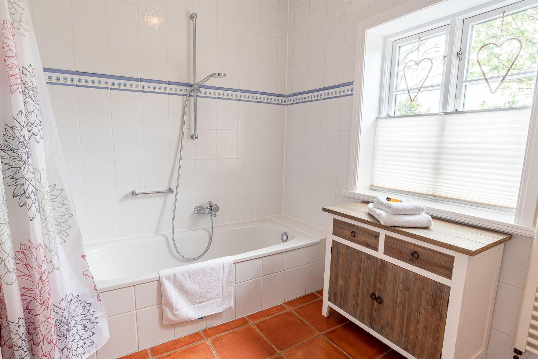 Verbringen Sie ihren Urlaub in einem typischem Föhrer Haus mit Geschichte. Im ehemaligen reetgedeckten Mühlenhaus steht Ihnen Ihr Hausteil mit eigenem Parkplatz sowie einem eigenen Garten mit zwei Terrassen in südwestlicher Ausrichtung zur Verfügung. Im Erdgeschoss des liebevoll eingerichteten Hausteils befindet sich ein offener Wohn- Essbereich mit Küche und das Badezimmer mit Badewanne. Außerdem finden Sie in einem separatem Abstellraum eine Waschmaschine und einen Trockner, die ausschließlich zur Wohnung gehören.