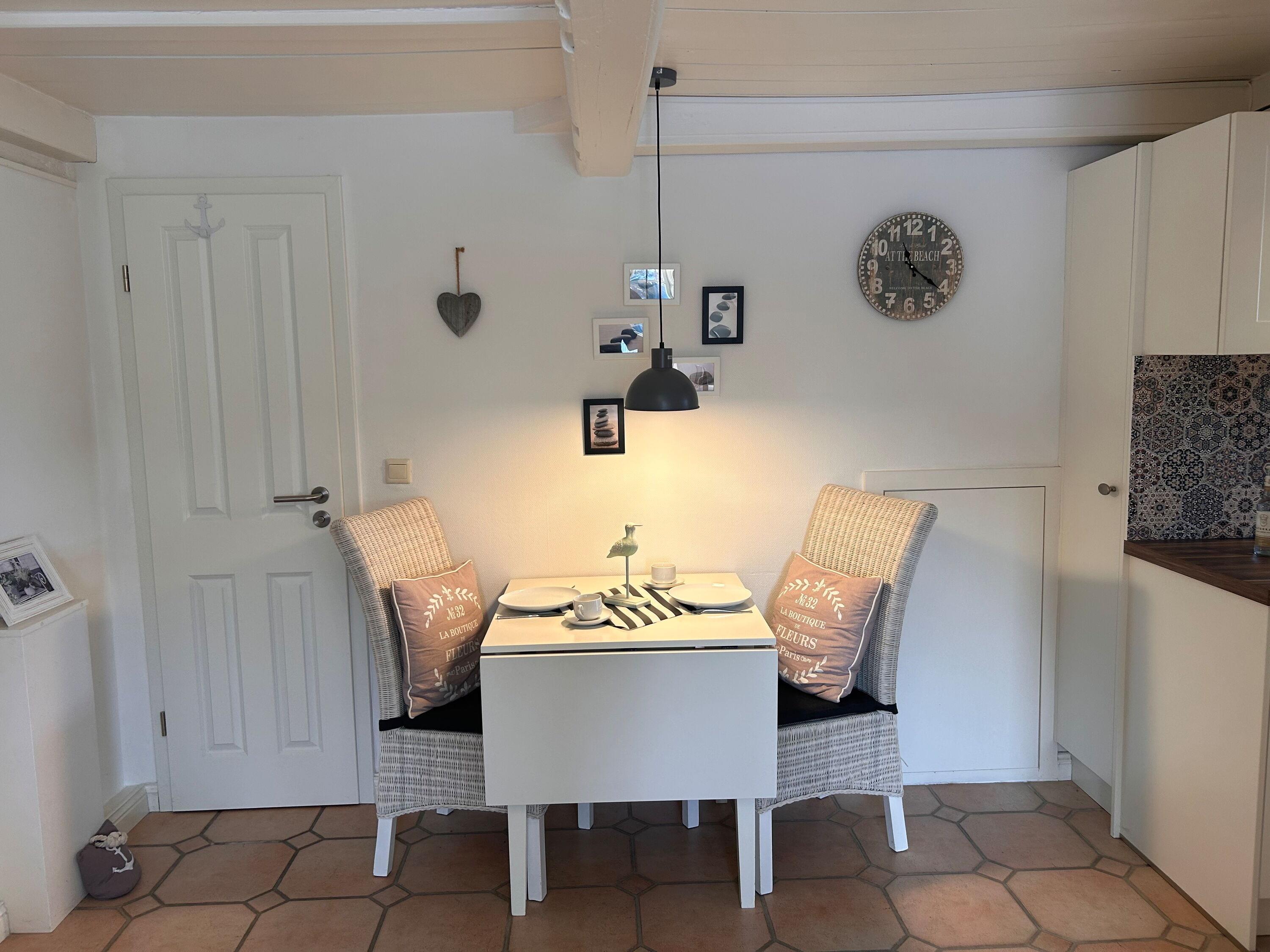Die im Dezember 2018 renovierte Ferienwohnung ist für 2 Personen und ein Baby geeignet und verfügt über eine maritime und komfortable Einrichtung. Im Erdgeschoss befindet sich ein geschmackvoll eingerichteter Wohn- und Essbereich mit einer modernen Küchenzeile. Das angrenzende Schlafzimmer verfügt über ein Doppelbett und ein kleines Duschbad. Haustiere sind in der Wohnung nicht erlaubt. In etwa 100 Metern Entfernung befindet sich ein kleiner Park mit Strandkörben und Bänken, der zum Entspannen einlädt. Von Frühjahr bis Herbst blühen dort Rosen und Obstbäume in einer bunten Farbenpracht. Ruhige Radwege führen von der Wohnung aus zu den umliegenden Inseldörfern und durch die Landschaft. Mit dem Fahrrad ist der Ort Wyk in weniger als 10 Minuten zu erreichen. Dort gibt es Sehenswürdigkeiten wie den Hafen, die Promenade mit kleinen Geschäften und Gastronomie, ein Wellenbad, die Schutzstation Wattenmeer und einen langen Sandstrand mit Blick auf die Halligen. In Wrixum gibt es fußläufig vom Haus entfernt einen Bäcker, ein Restaurant und einen Fahrradverleih.