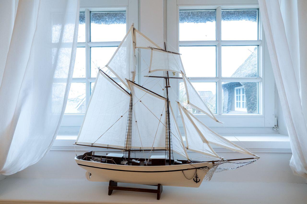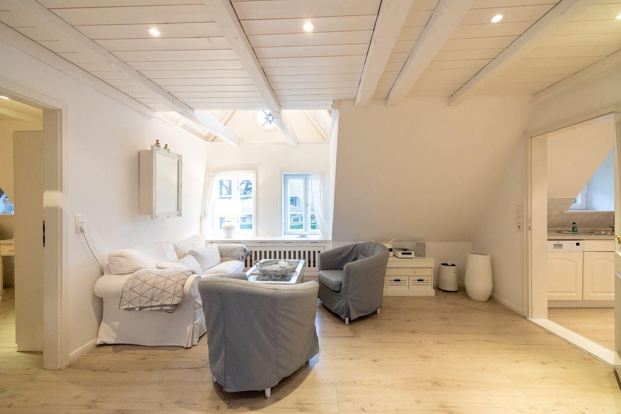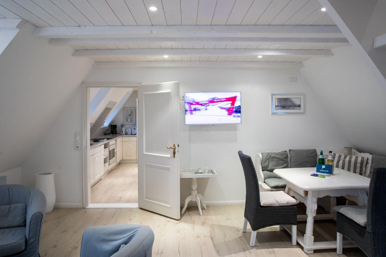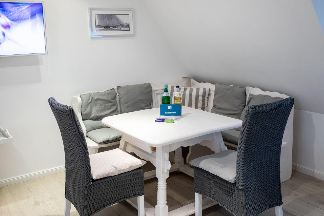 Die Ferienwohnung Silbermöwe wurde im Jahr 2012 aufwendig renoviert und restauriert. Im großen Wohn-Esszimmer werden Sie schöne Stunden verbringen. Dazu tragen die Holzdielen sowie die weiße Holzdecke bei.