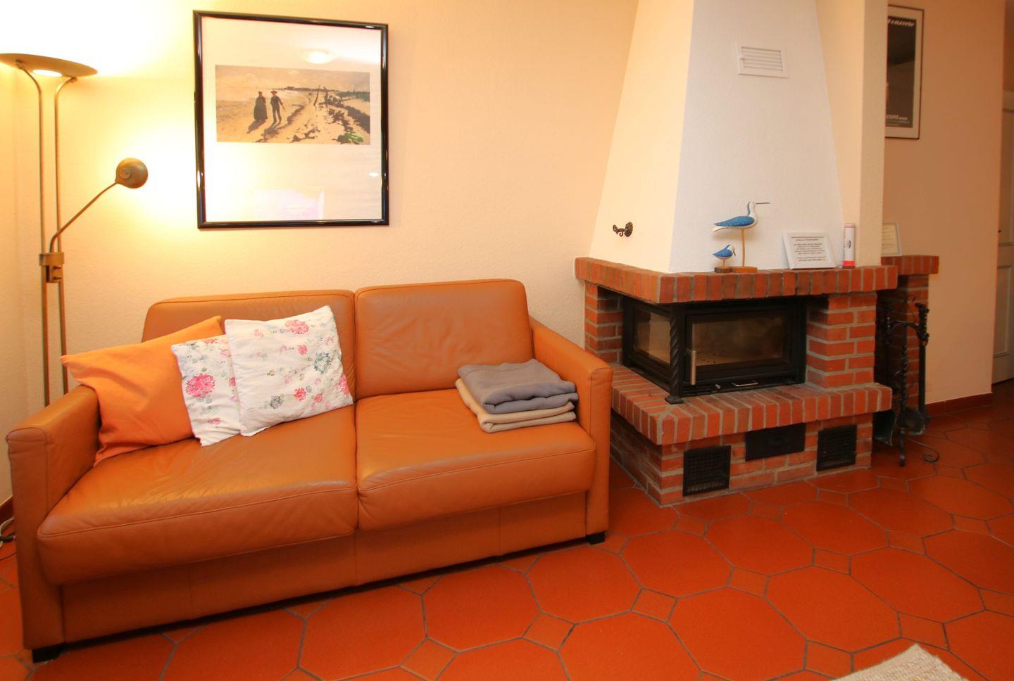- Wohnzimmer mit 2 Ledercouchen, Kamin