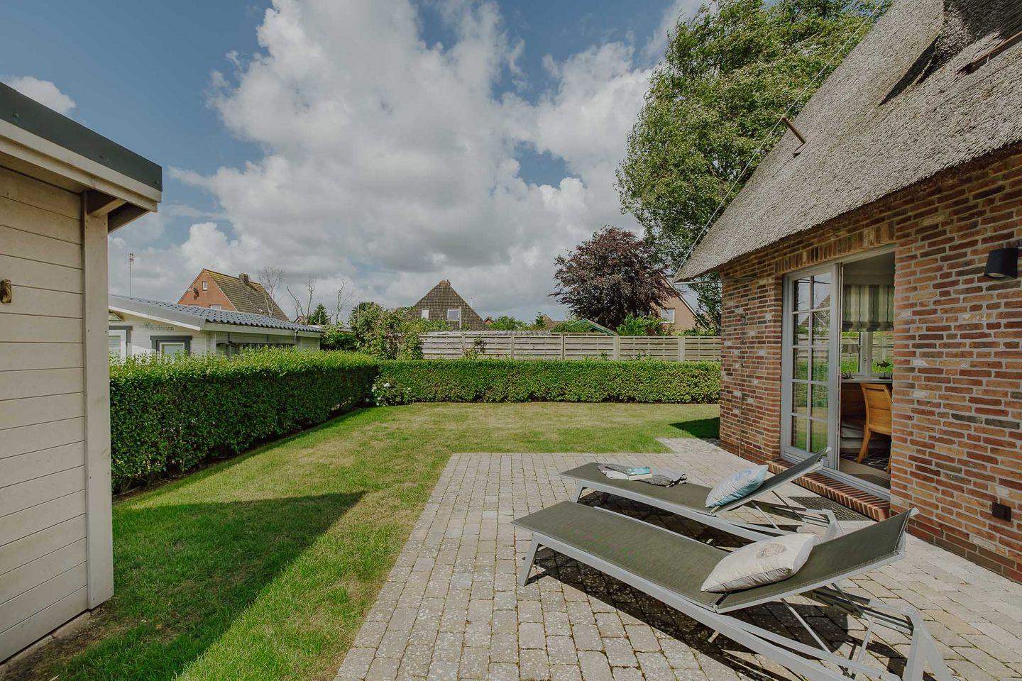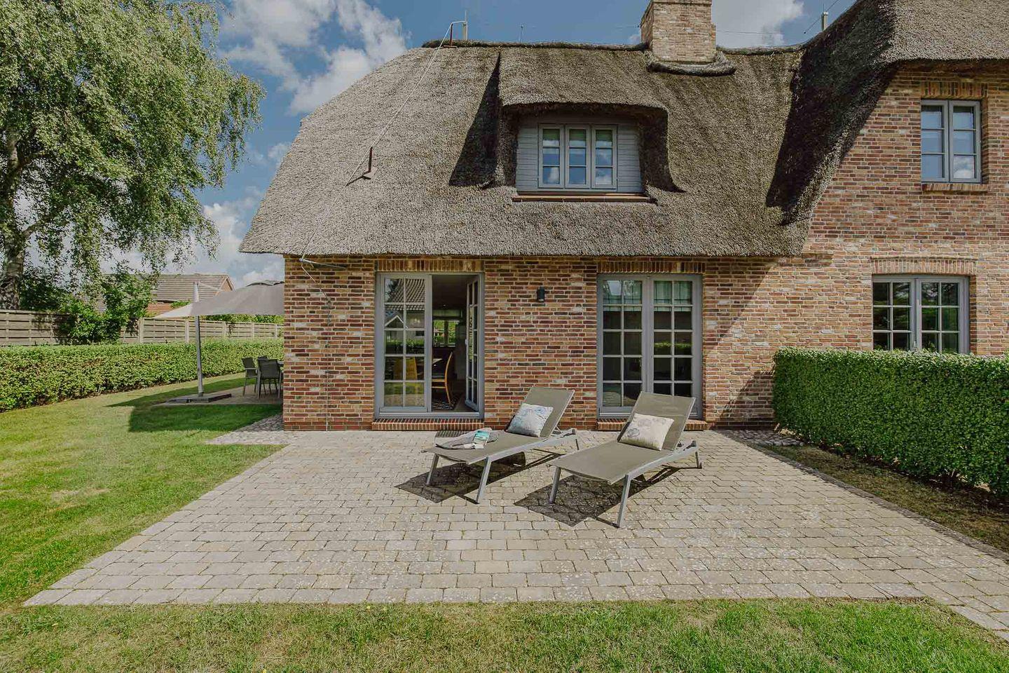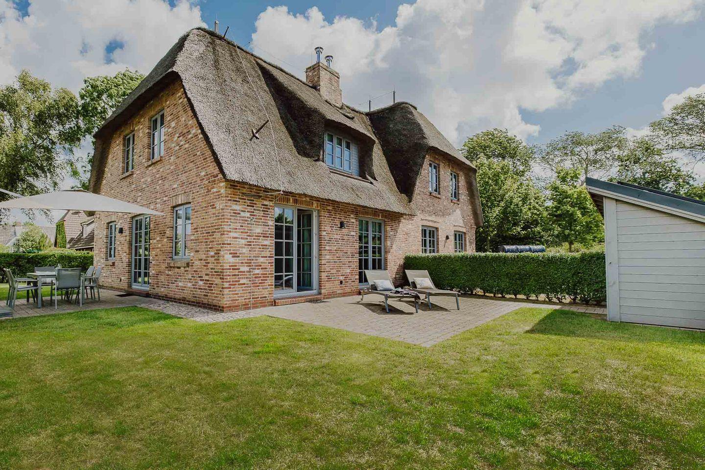Reetgedeckte Doppelhaushälfte in "friesisch-modernem" Stil mit Original Mylin-Kachelofen, hauseigener Sauna und zwei Terrassen im Garten.